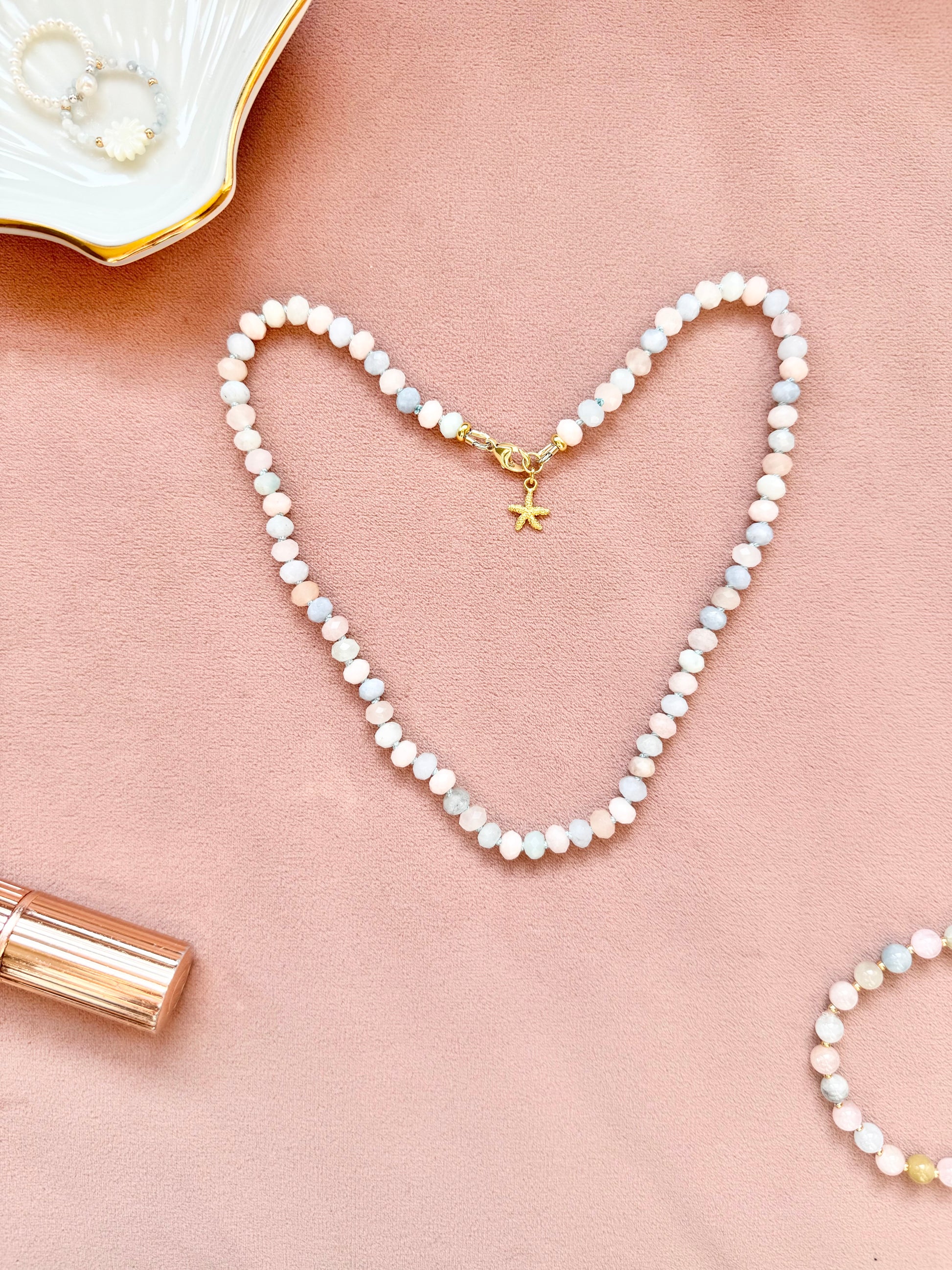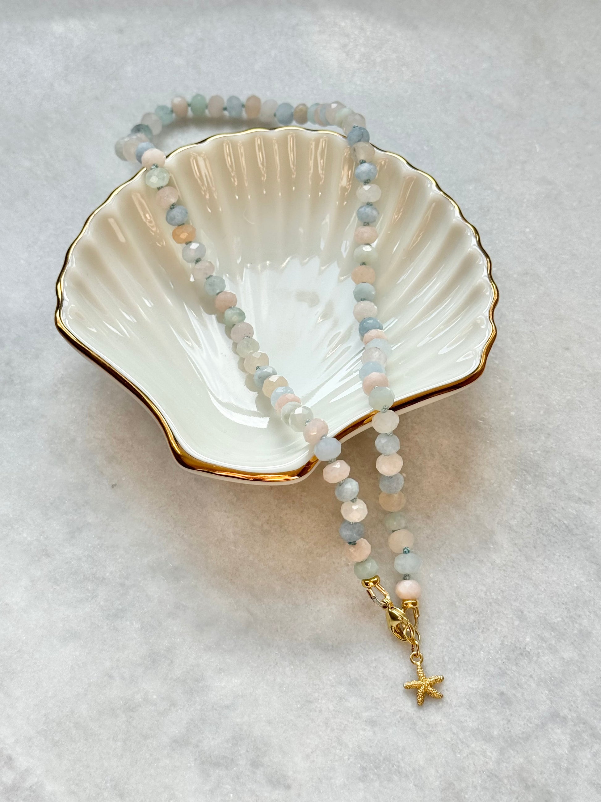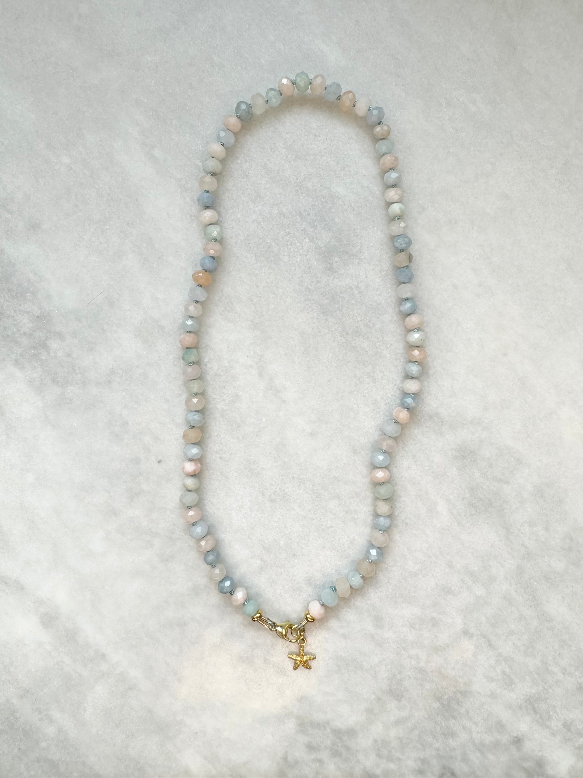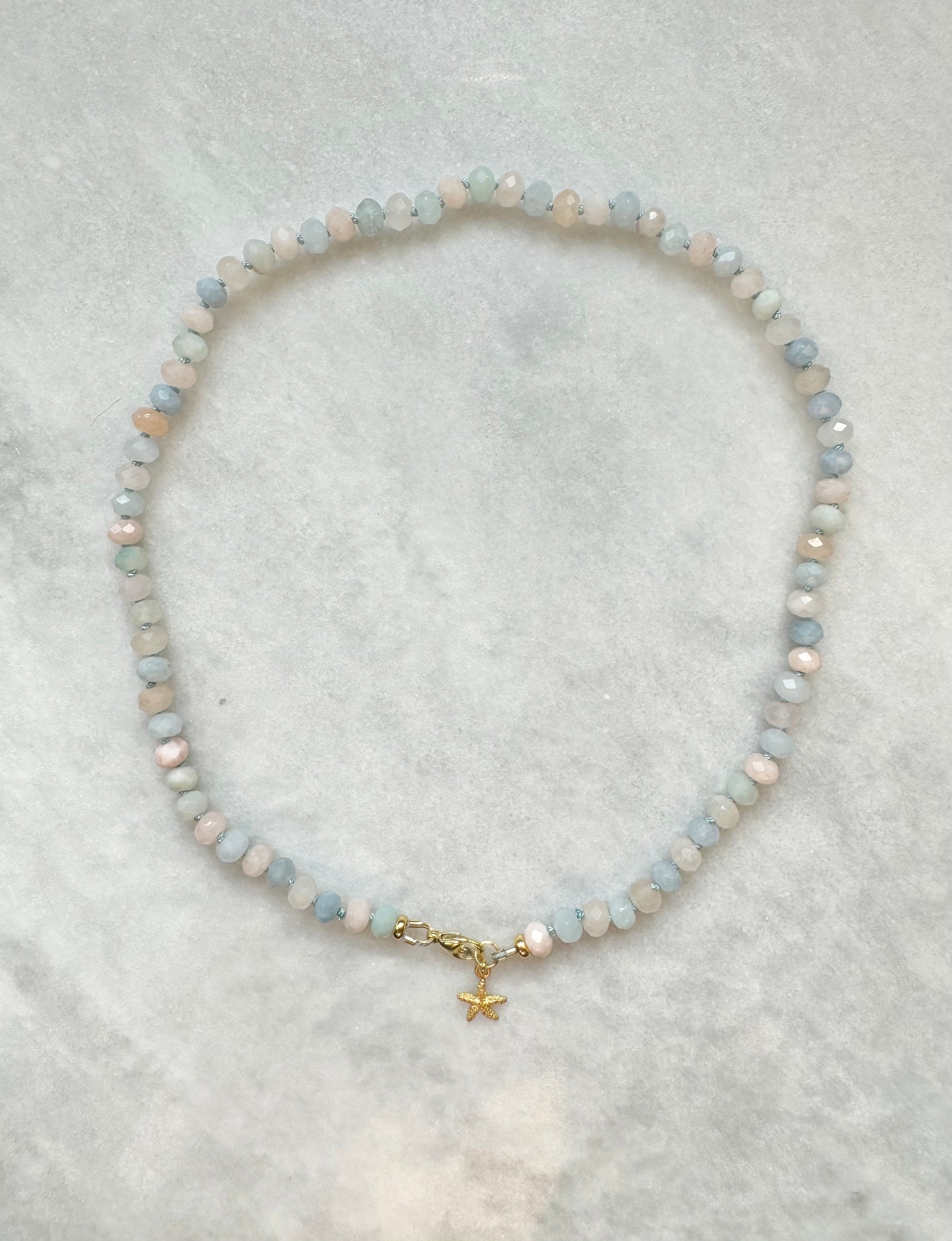 Aquamarine & Morganite rondelles hand knotted on light blue silk thread, finished with a gold vermeil clasp and starfish charm.