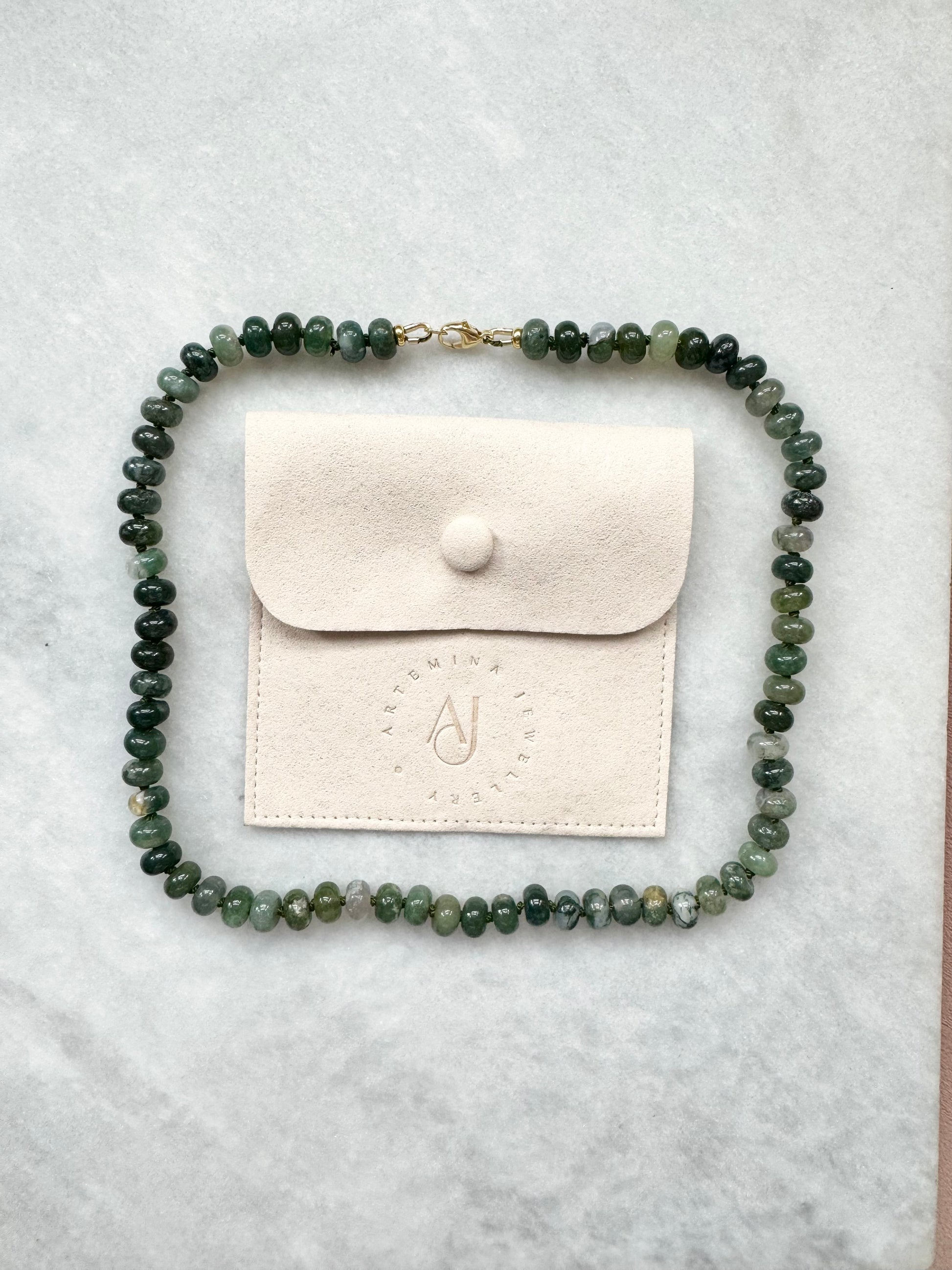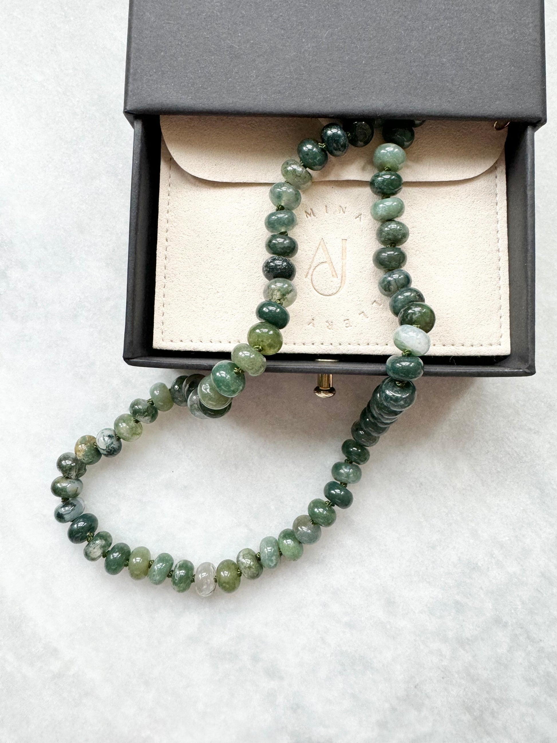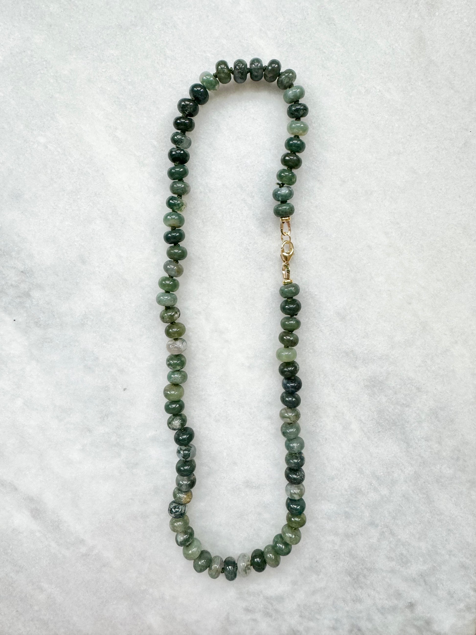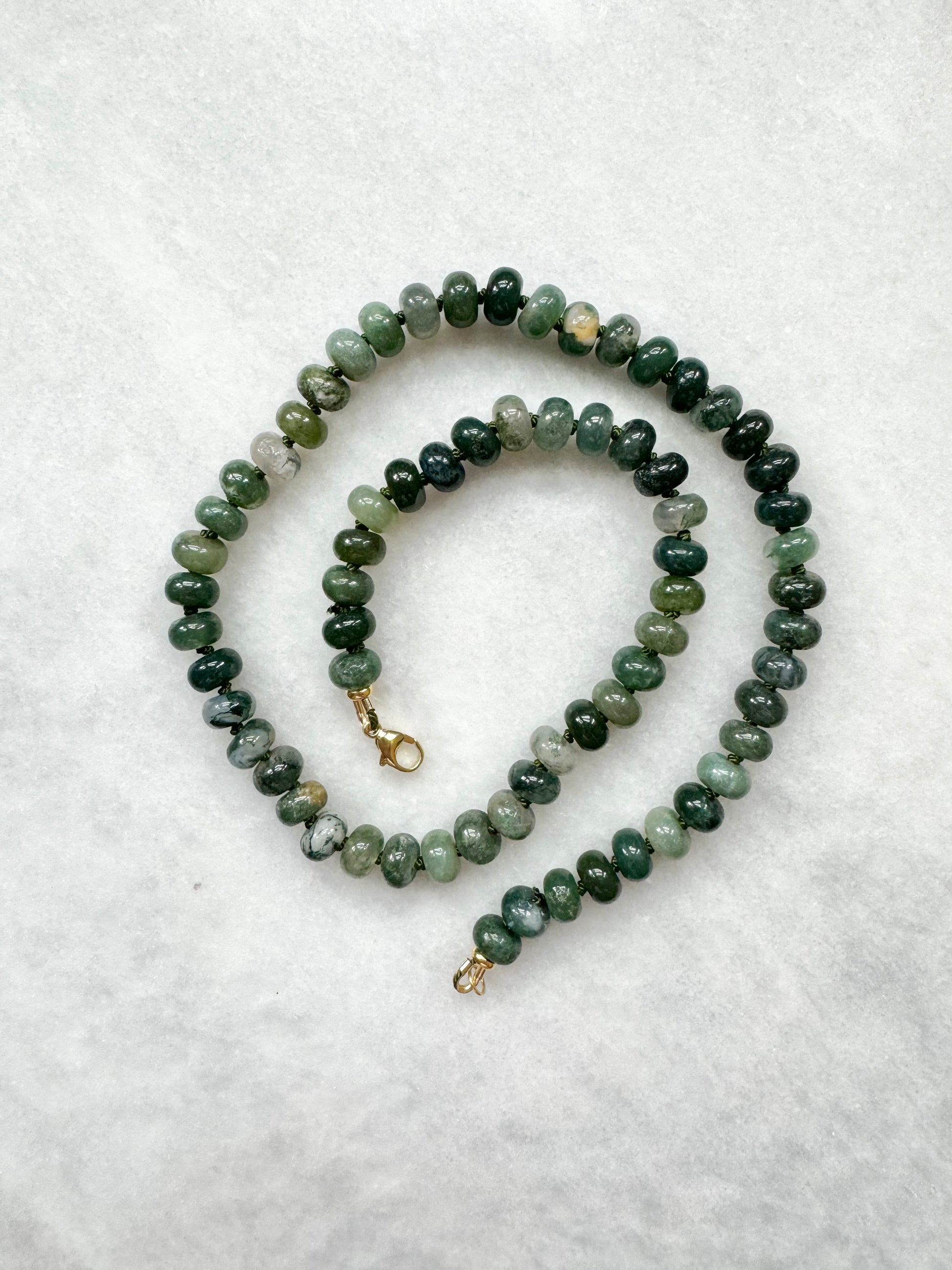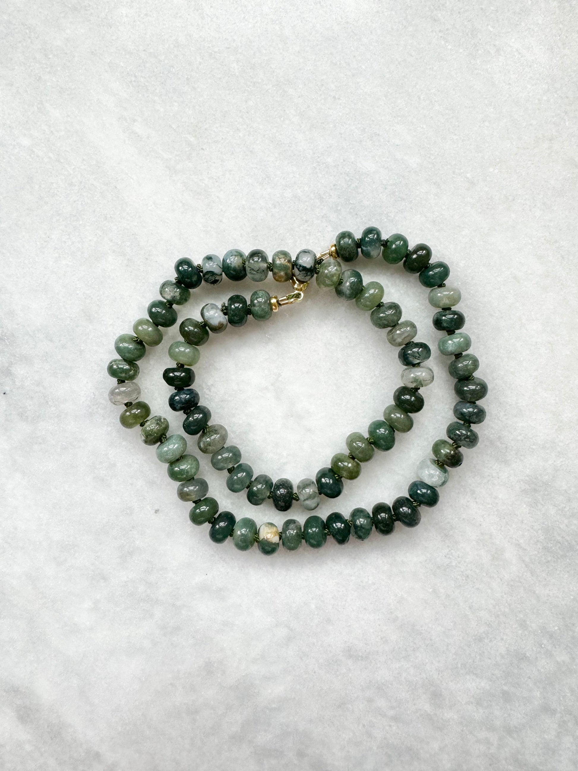 Moss Agate rondelles hand knotted on dark green silk thread, finished with a gold vermeil lobster clasp.