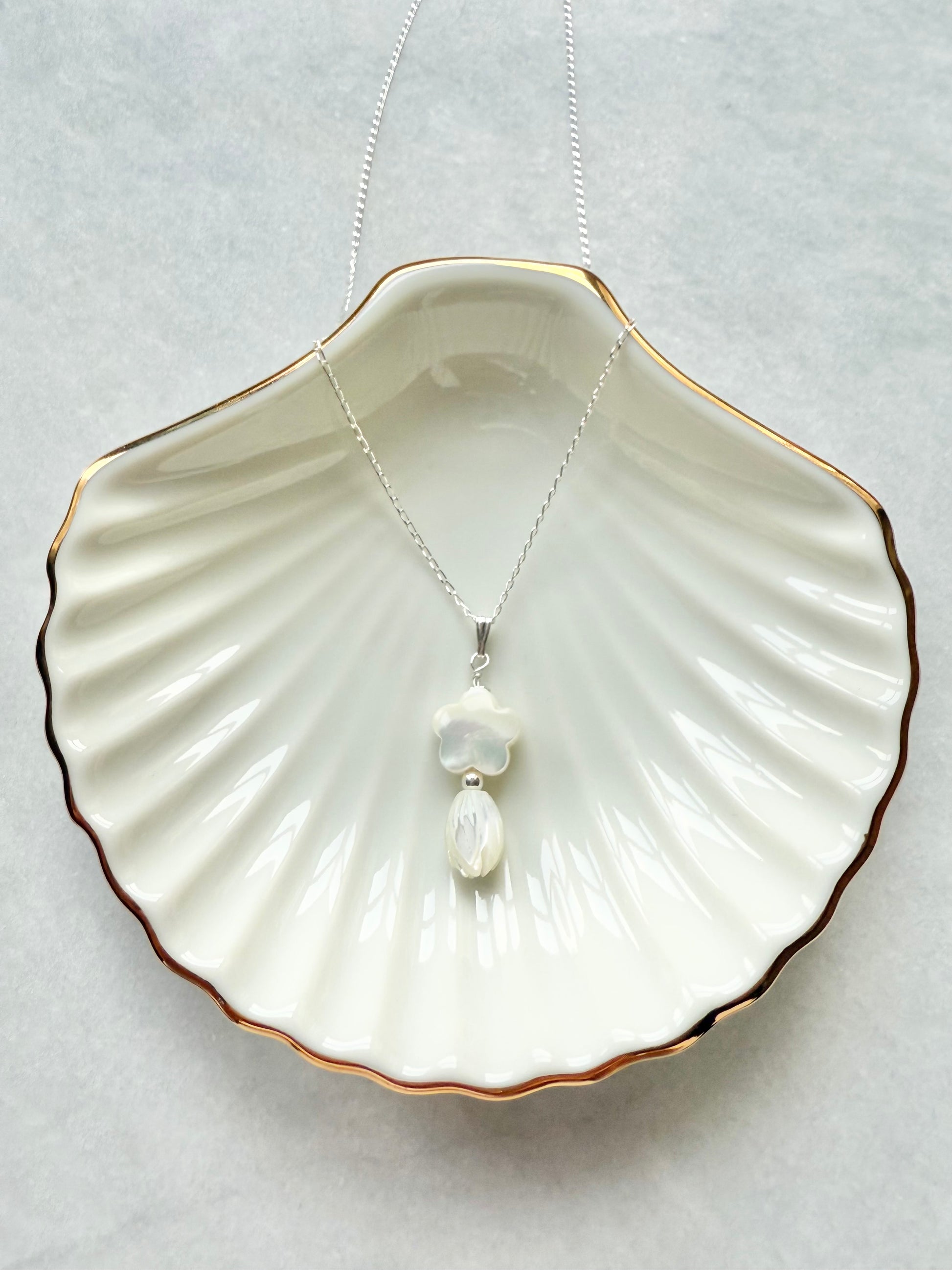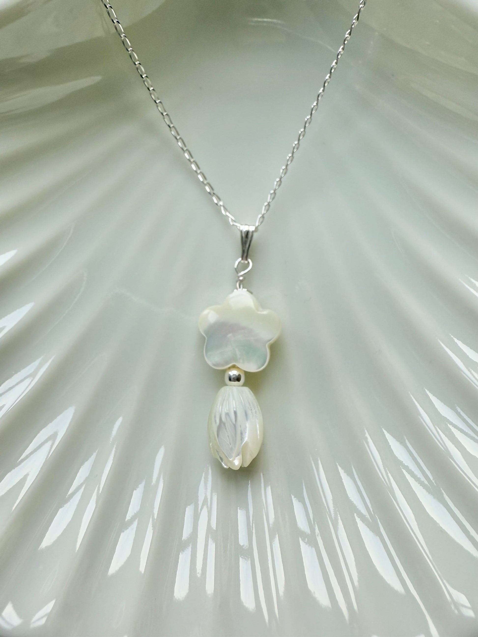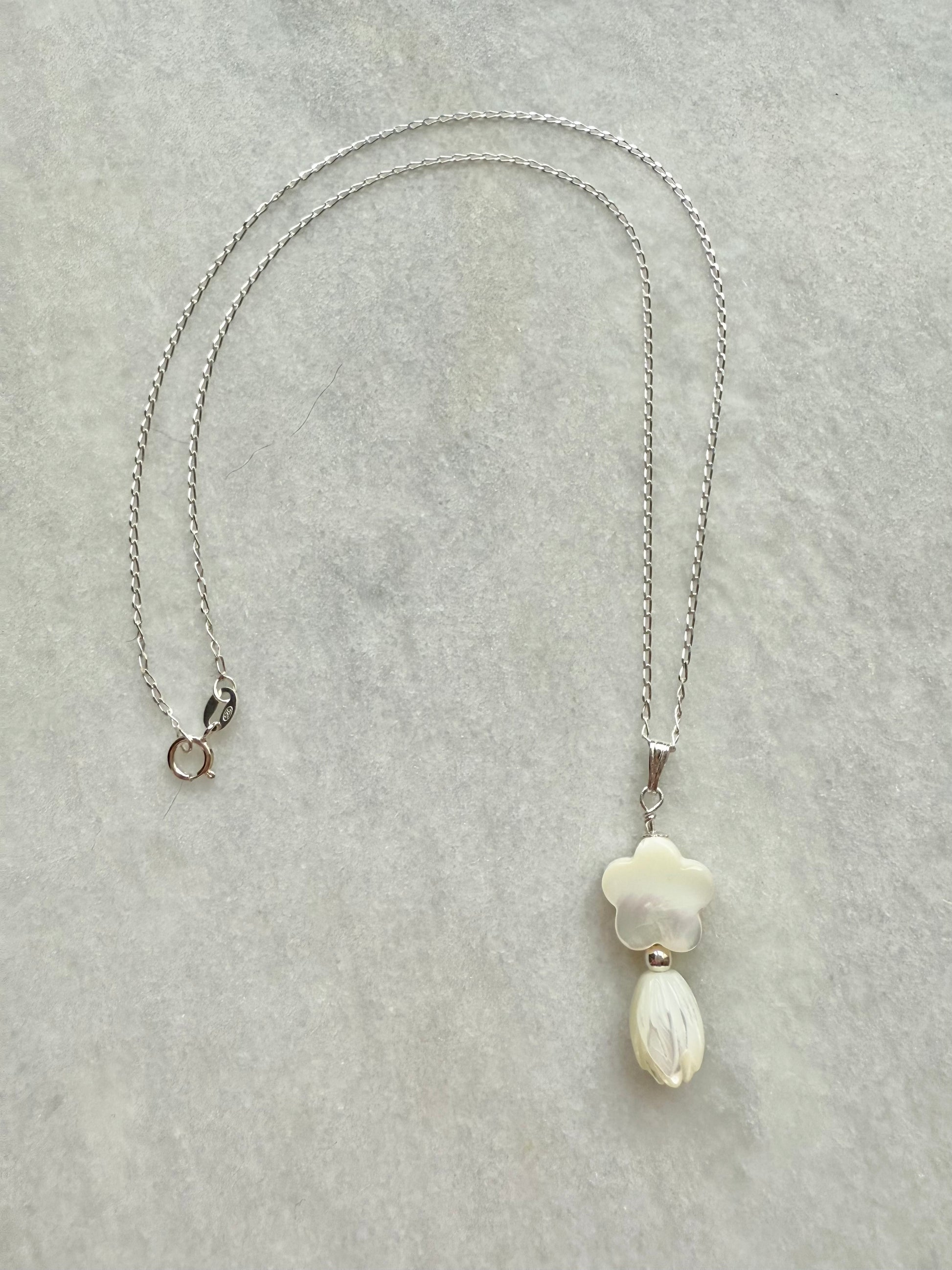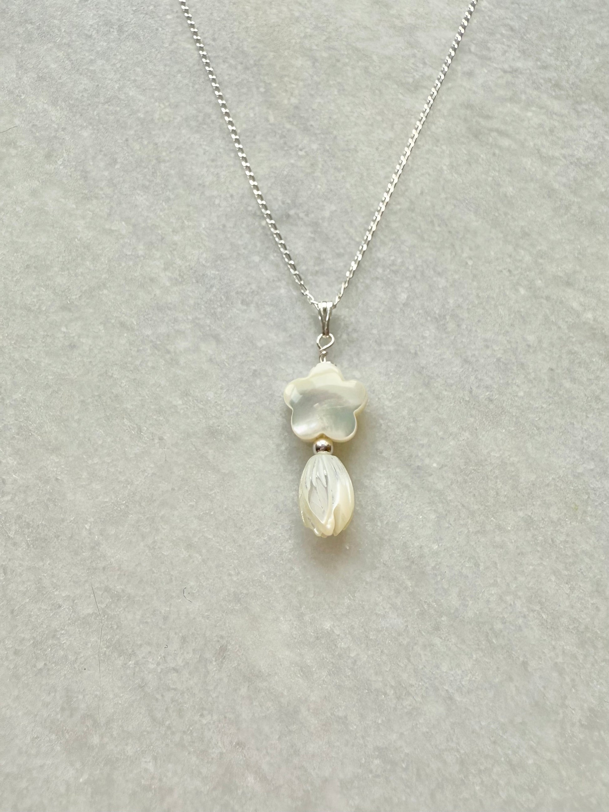 Mother-of-pearl flower pendant on a delicate sterling silver trace chain.