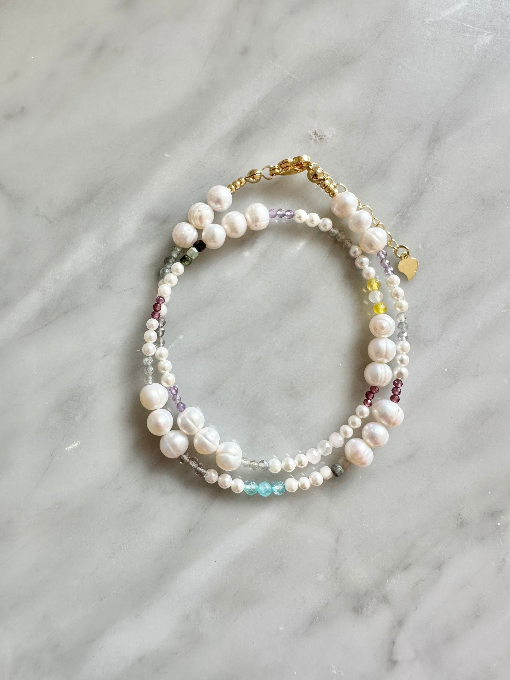 clear quartz, apatite, labradorite and tourmaline, finished with a gold vermeil clasp.