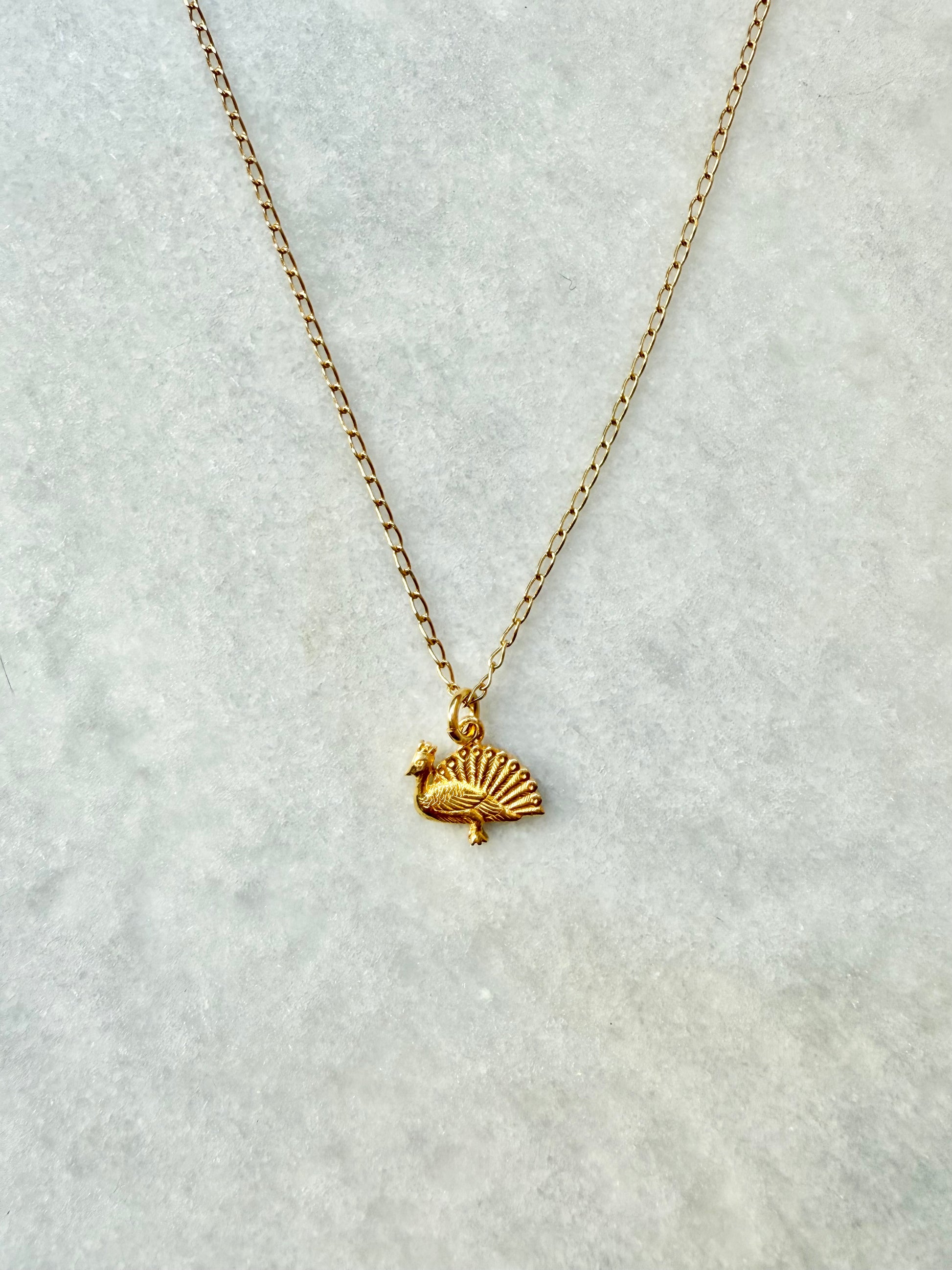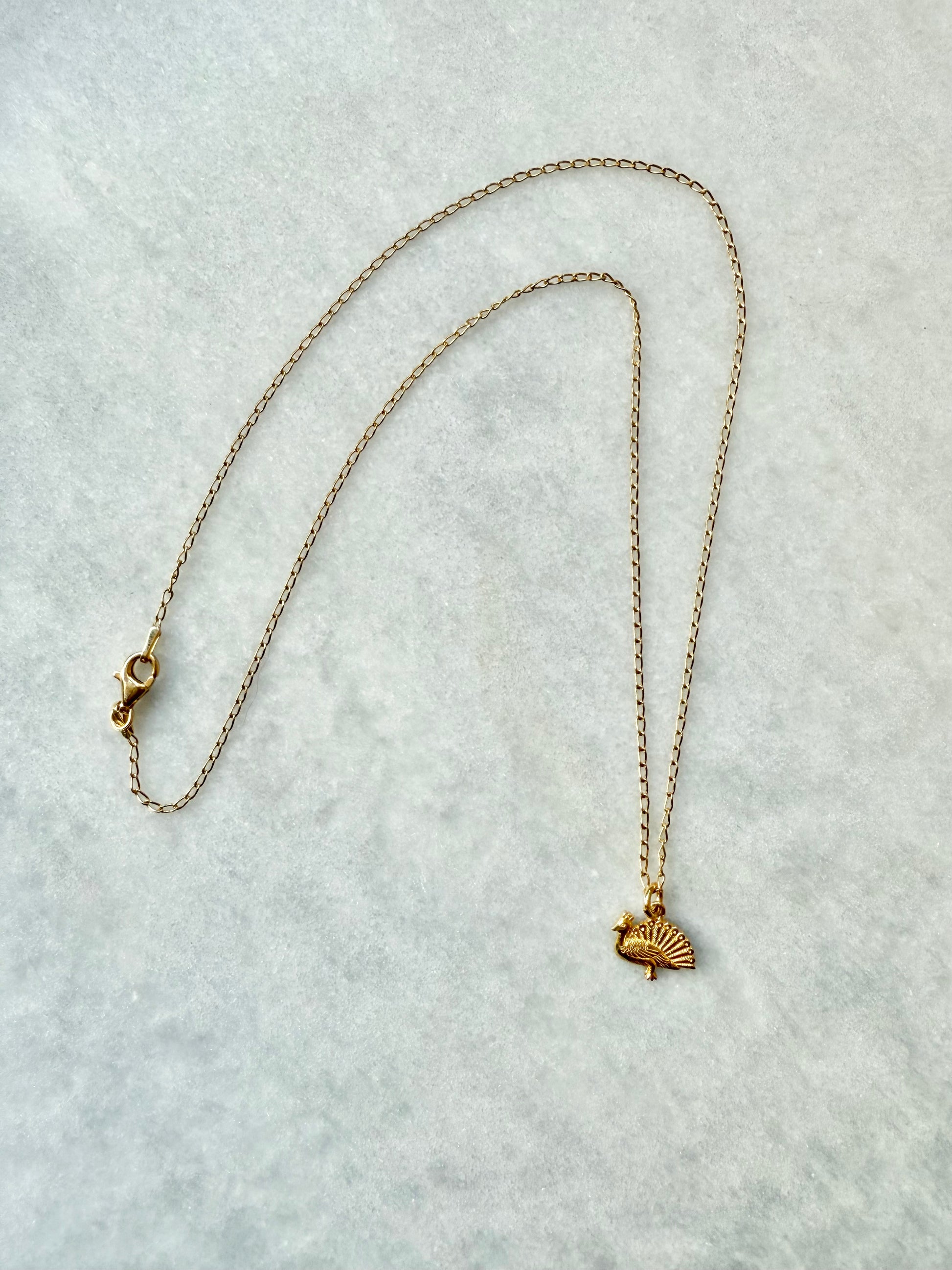 This beautifully detailed peacock charm hangs delicately from a classic curb chain, making it a versatile piece for everyday wear or special occassions.
