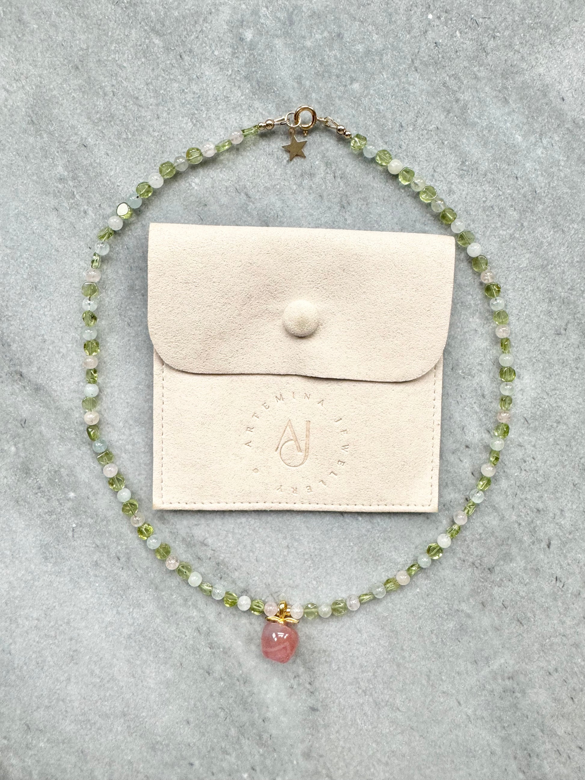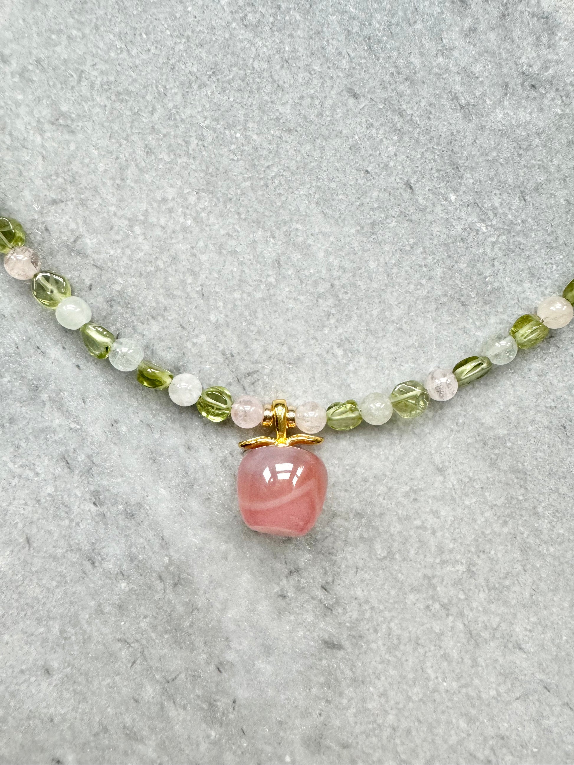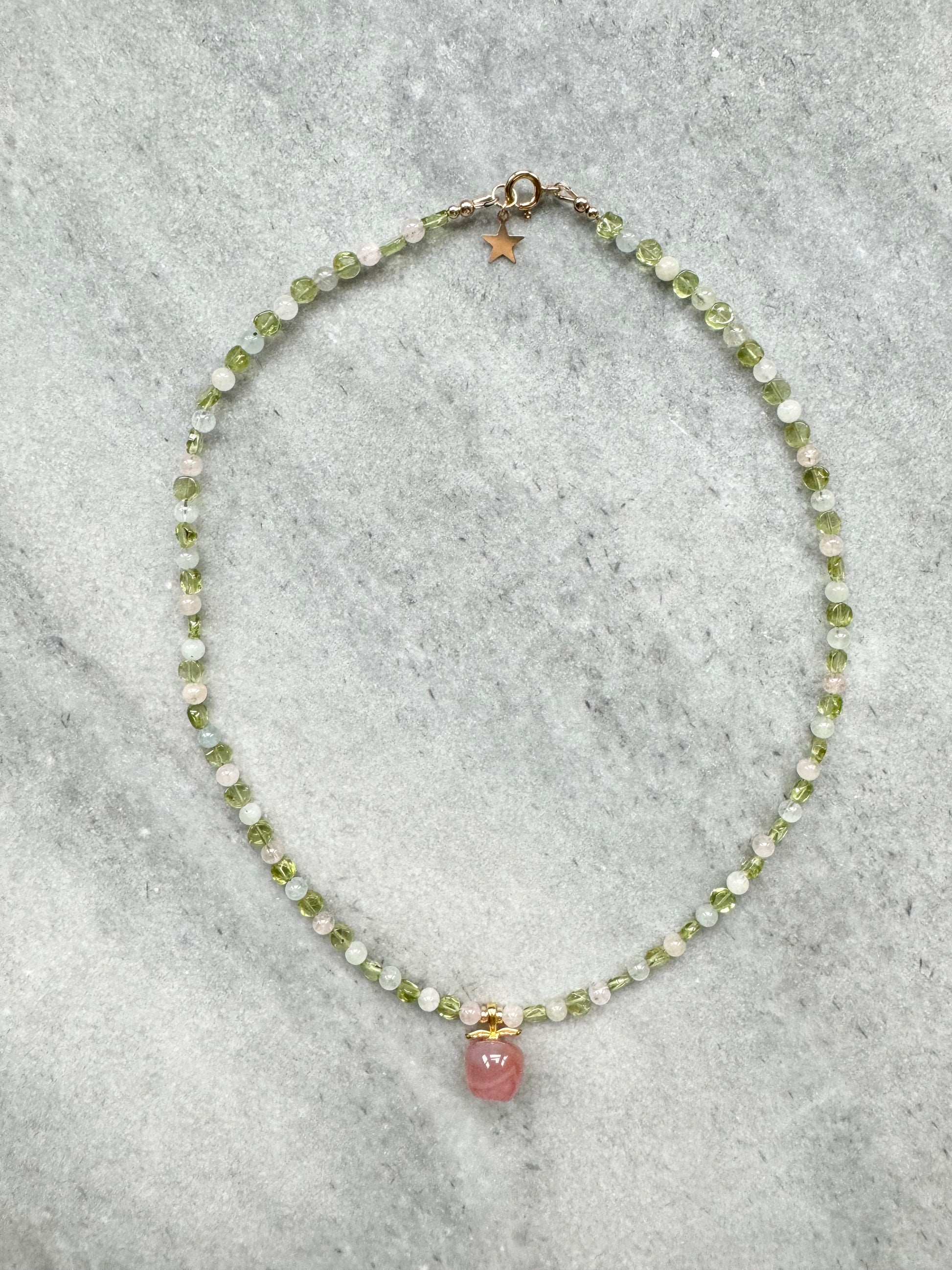 This beaded necklace features the vibrant mix of lush peridot and delicate morganite beads. Accented with a charming agate apple pendant and a gold-filled clasp.