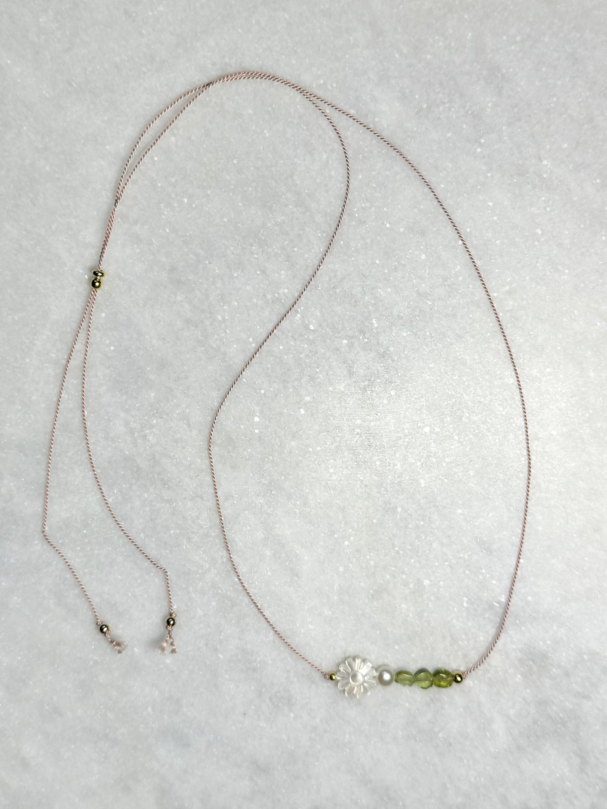 This pendant necklace highlights peridot, a pearl, and a mother of pearl flower, with peridot symbolising strength, happiness, and renewal for August. The pearl and mother of pearl flower enhance the design’s elegance.