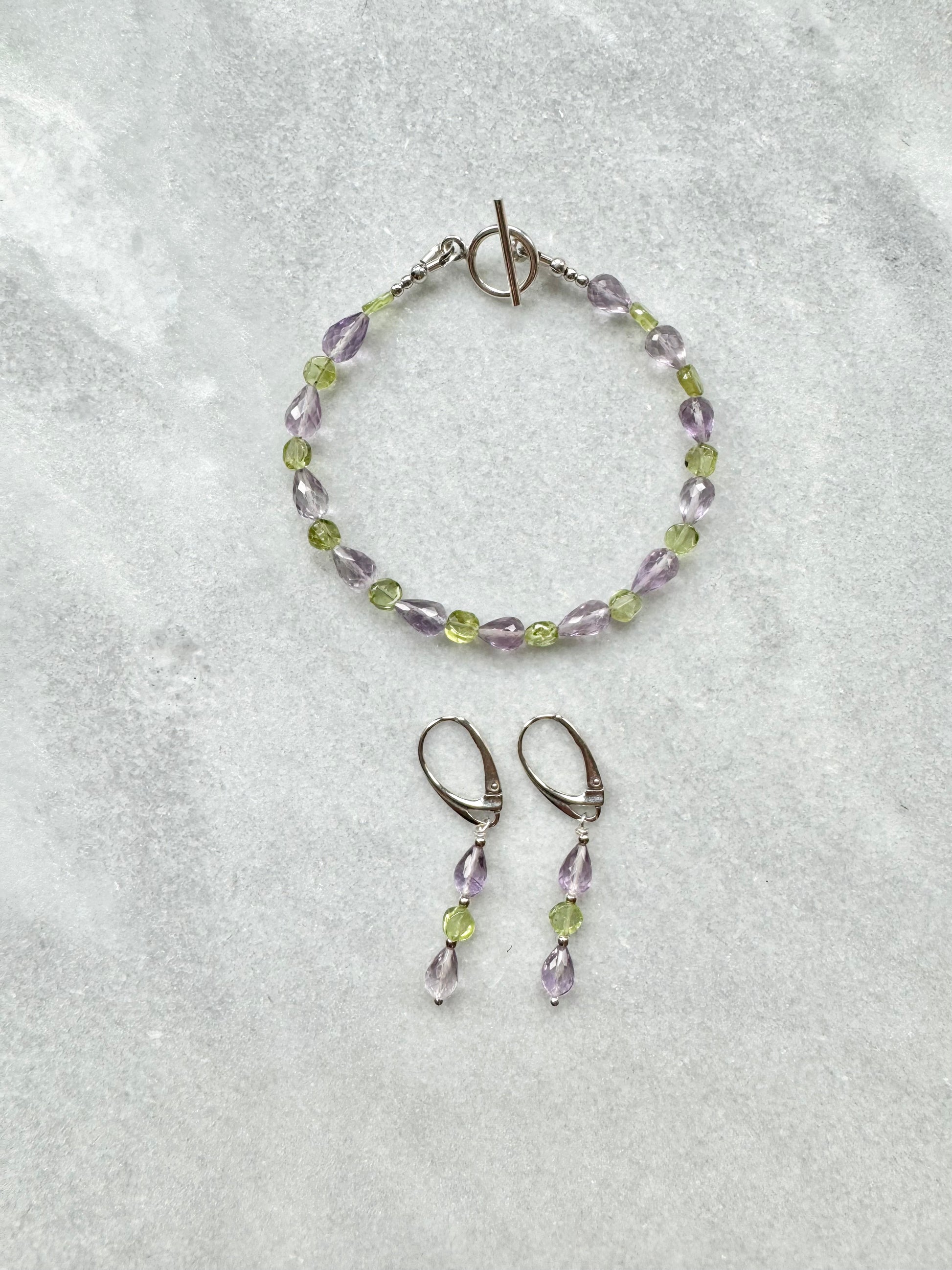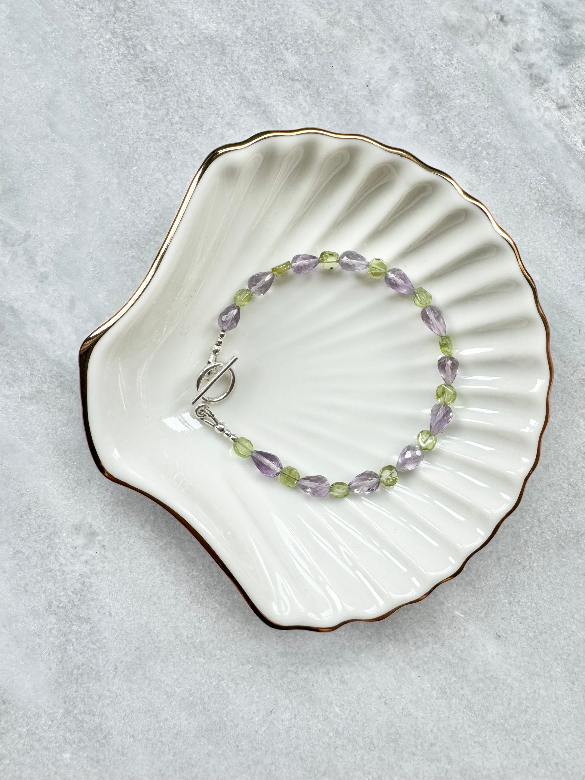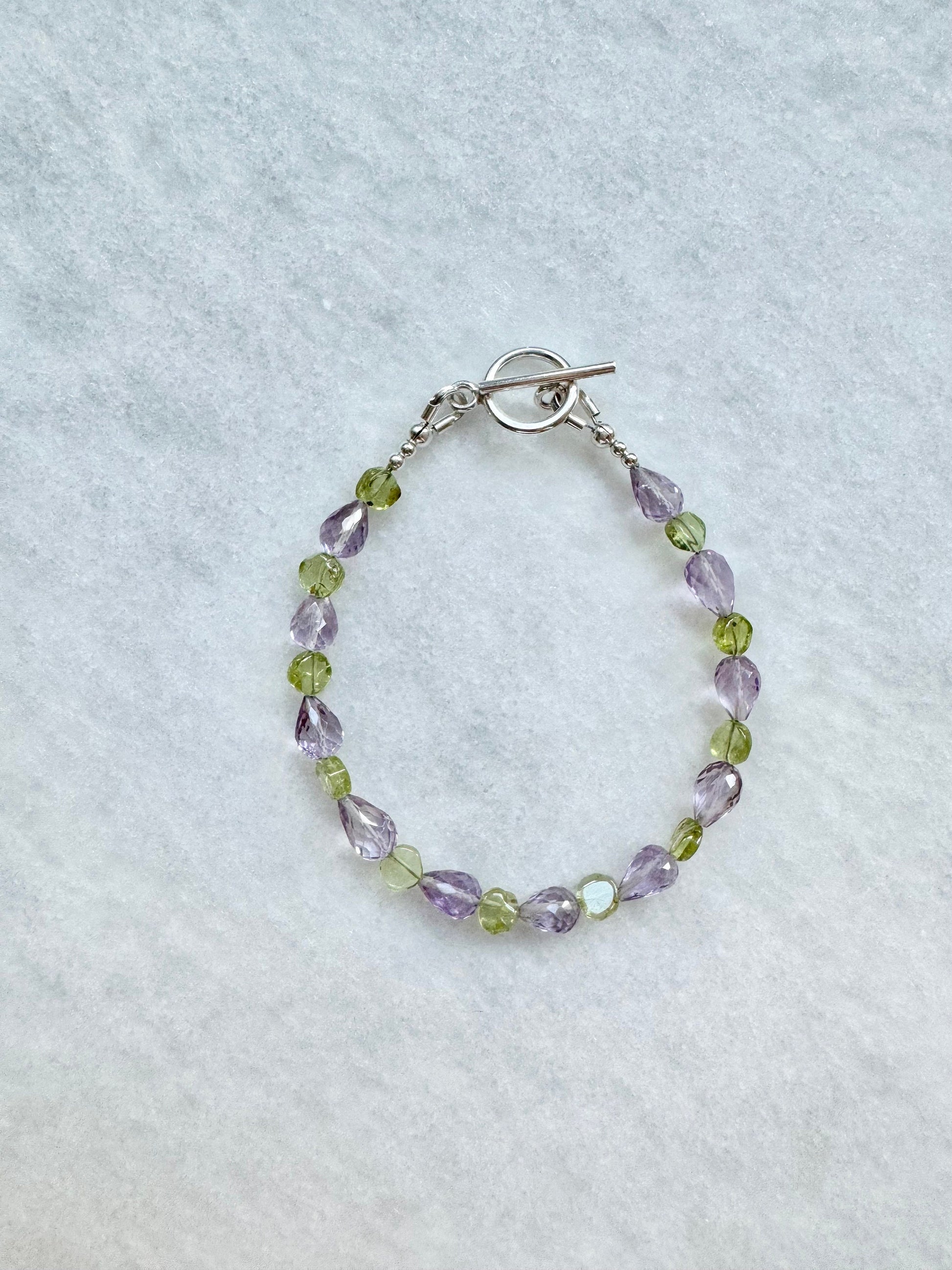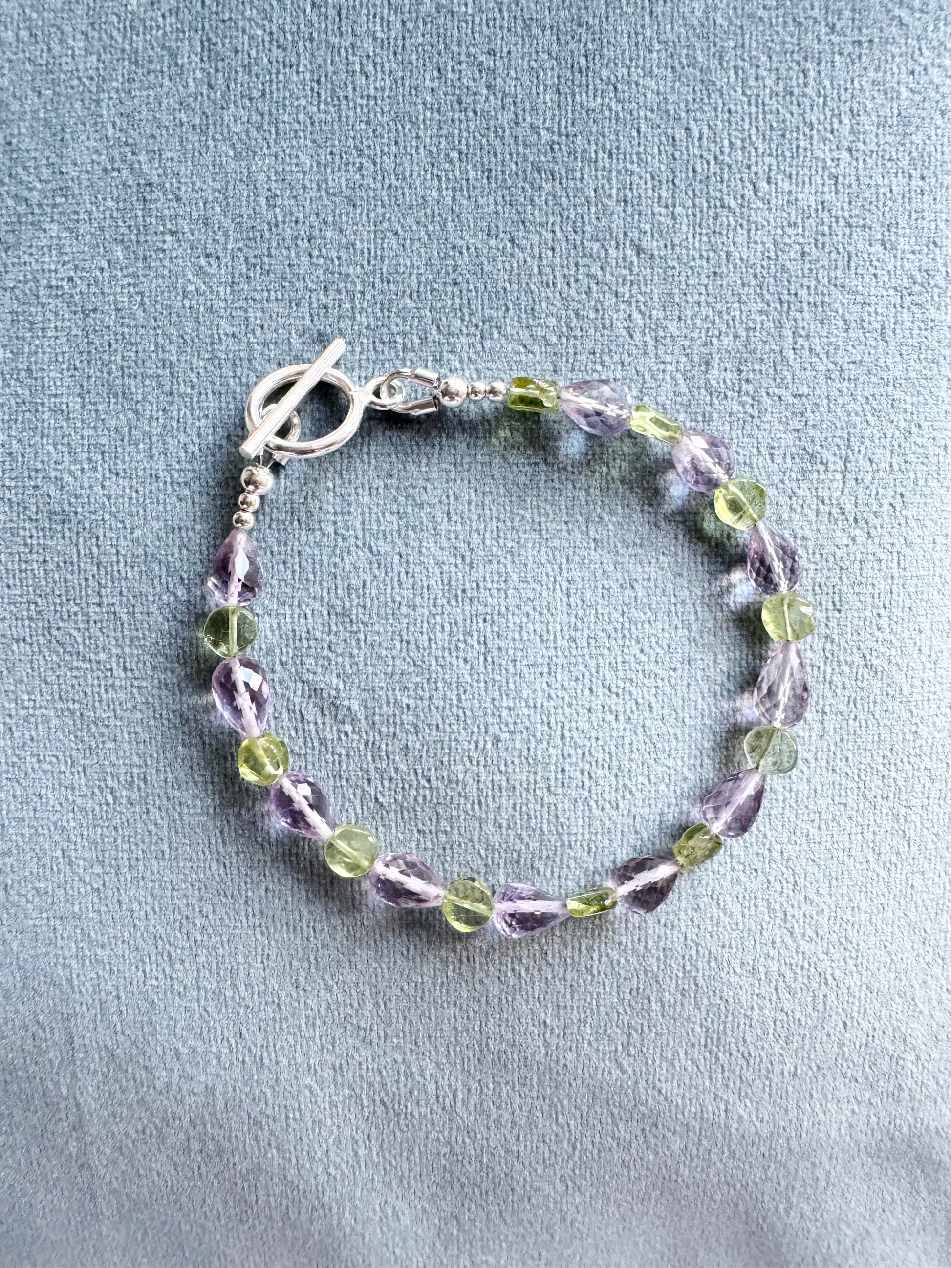 This bracelet has been made of pink amethyst teardrops and peridot coins, finished with a sterling silver toggle clasp.