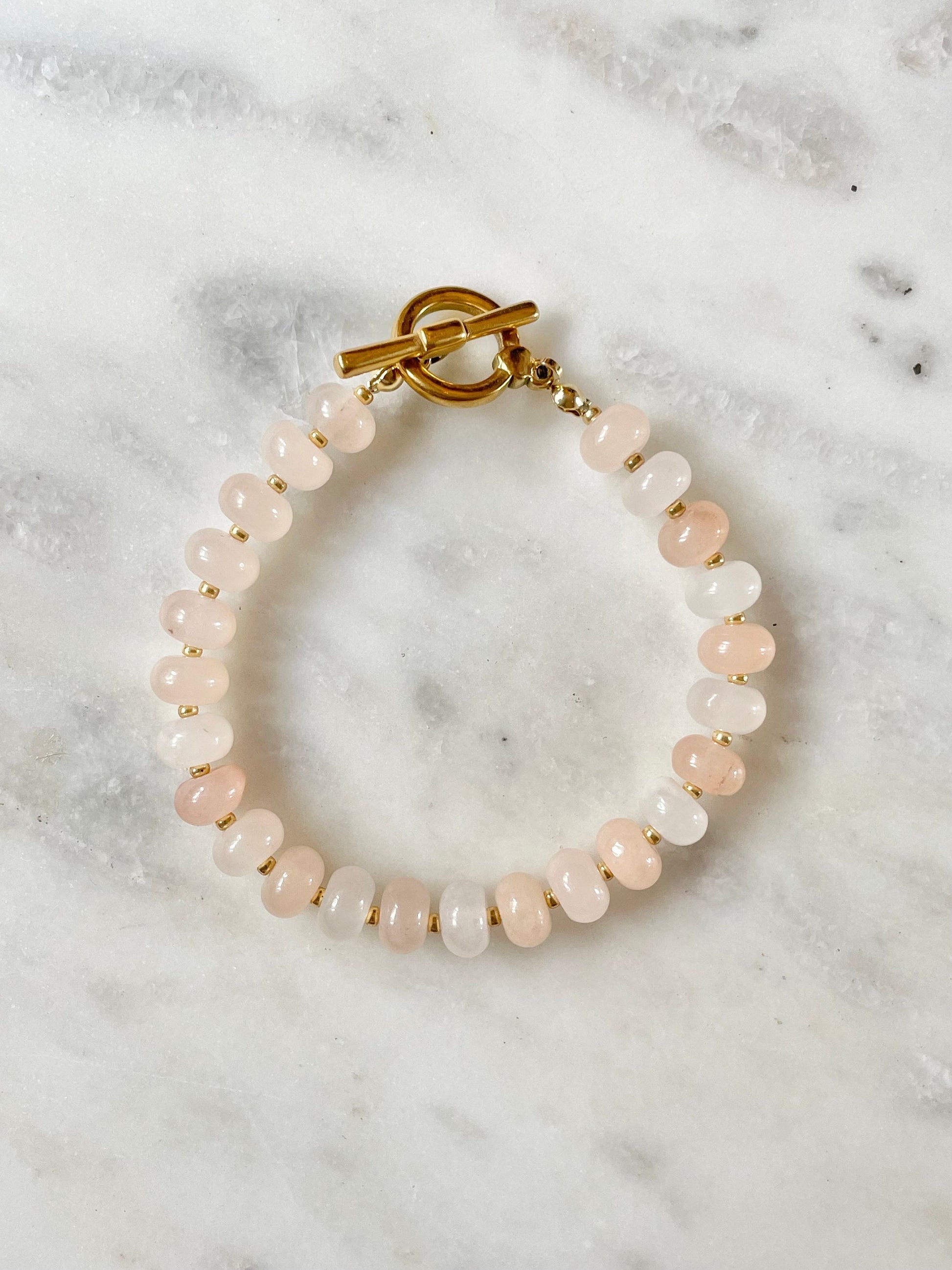 Pink aventurine rondelle bracelet with gold miyuki spacer beads and a gold filled /gold plated stainless steel toggle clasp.