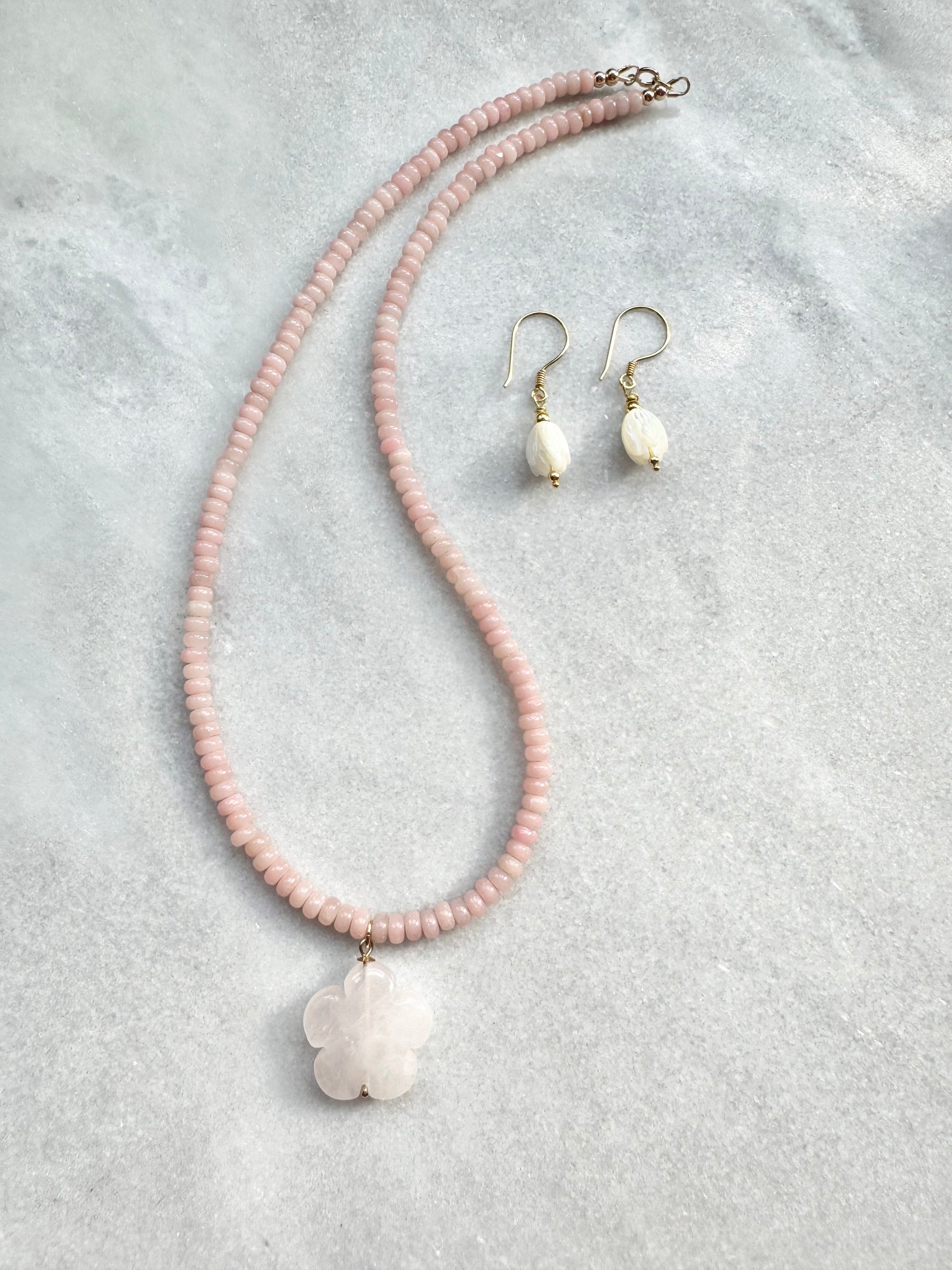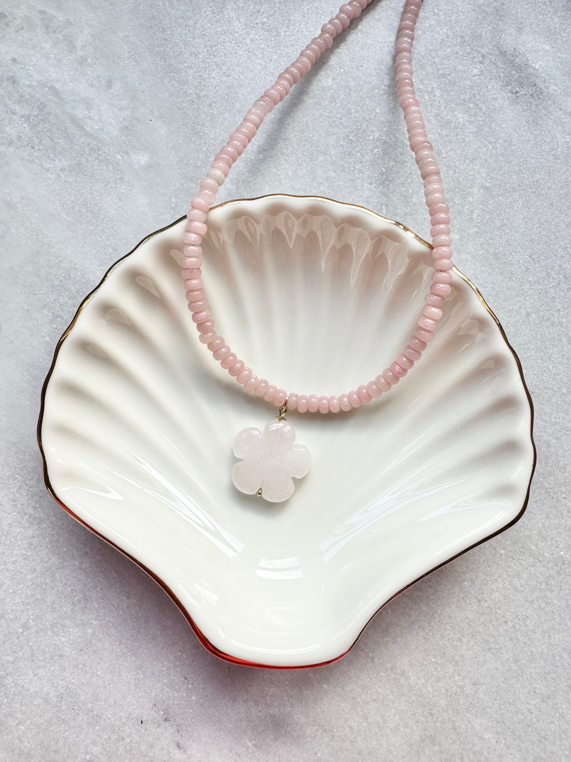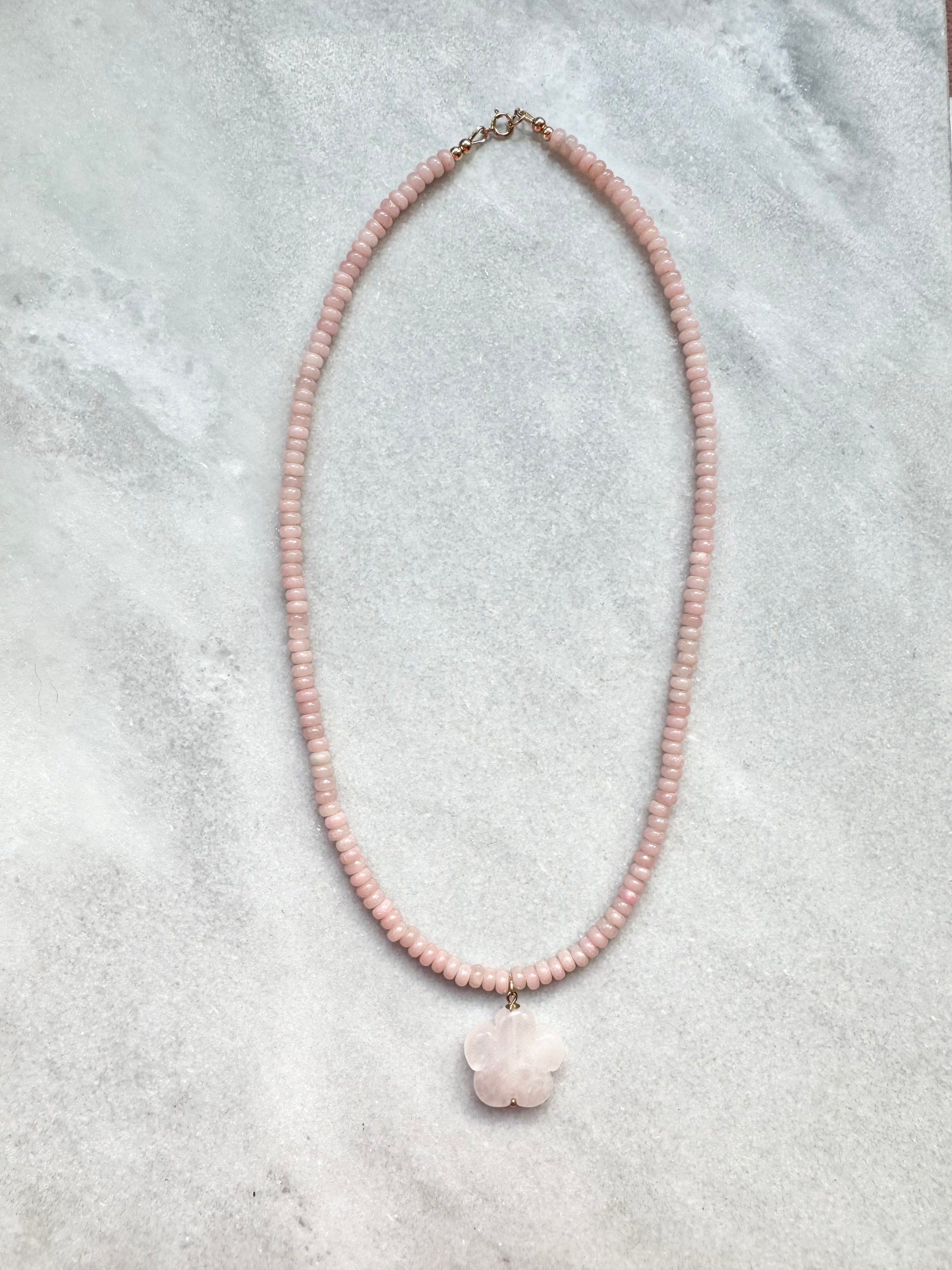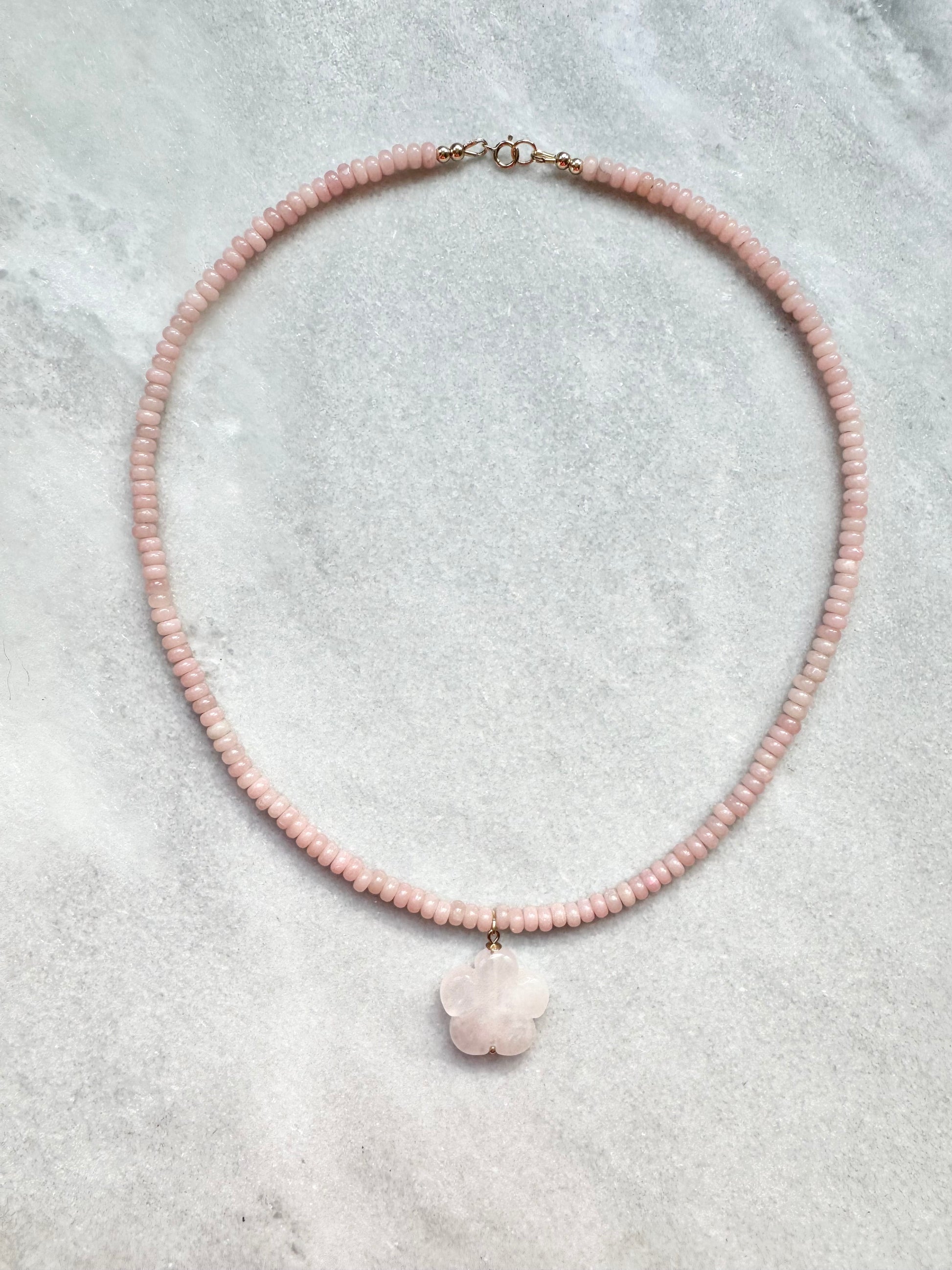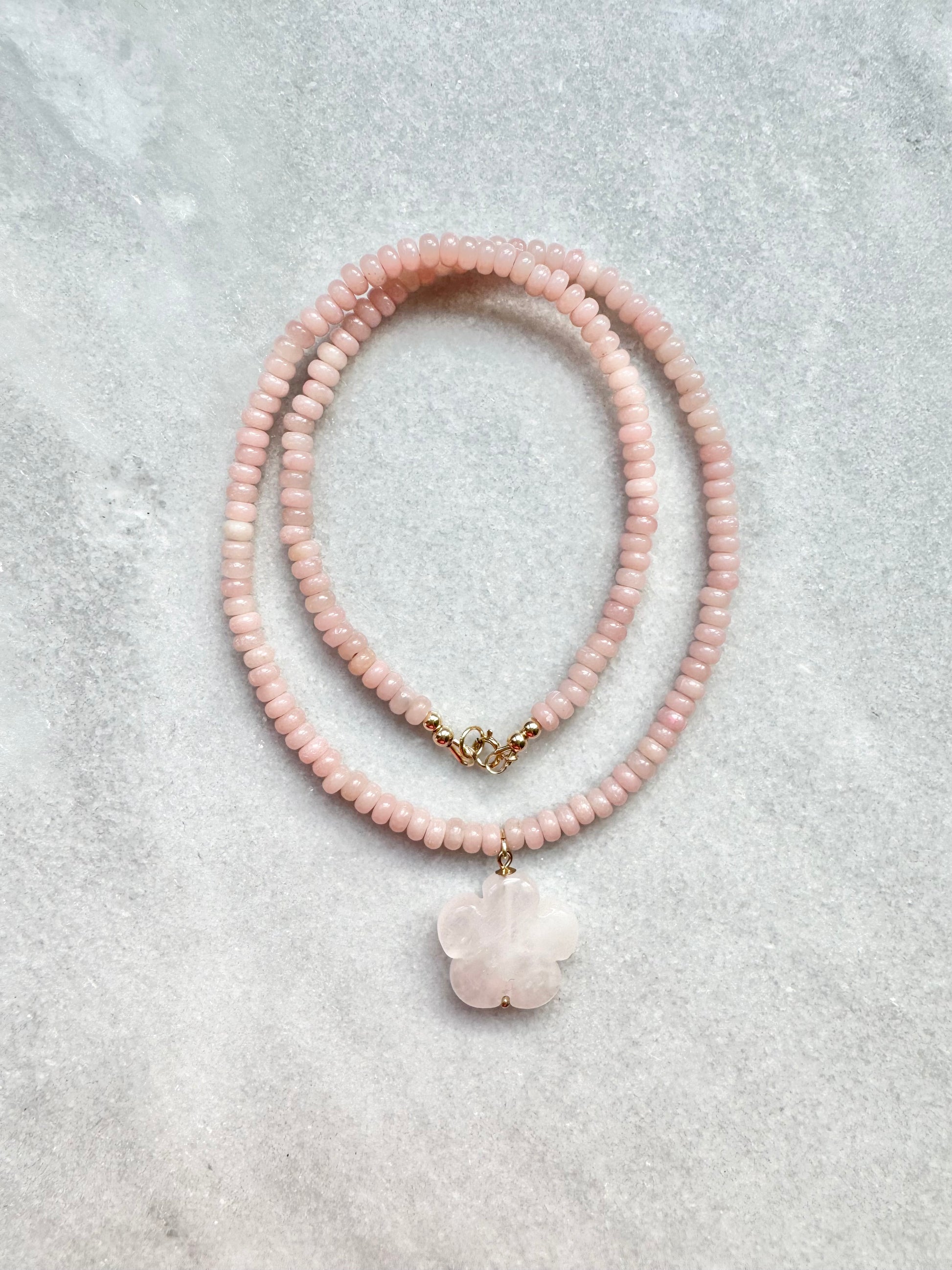 This necklace features Pink Opal rondelles and a Rose Quartz flower pendant, finished with a gold-filled clasp.