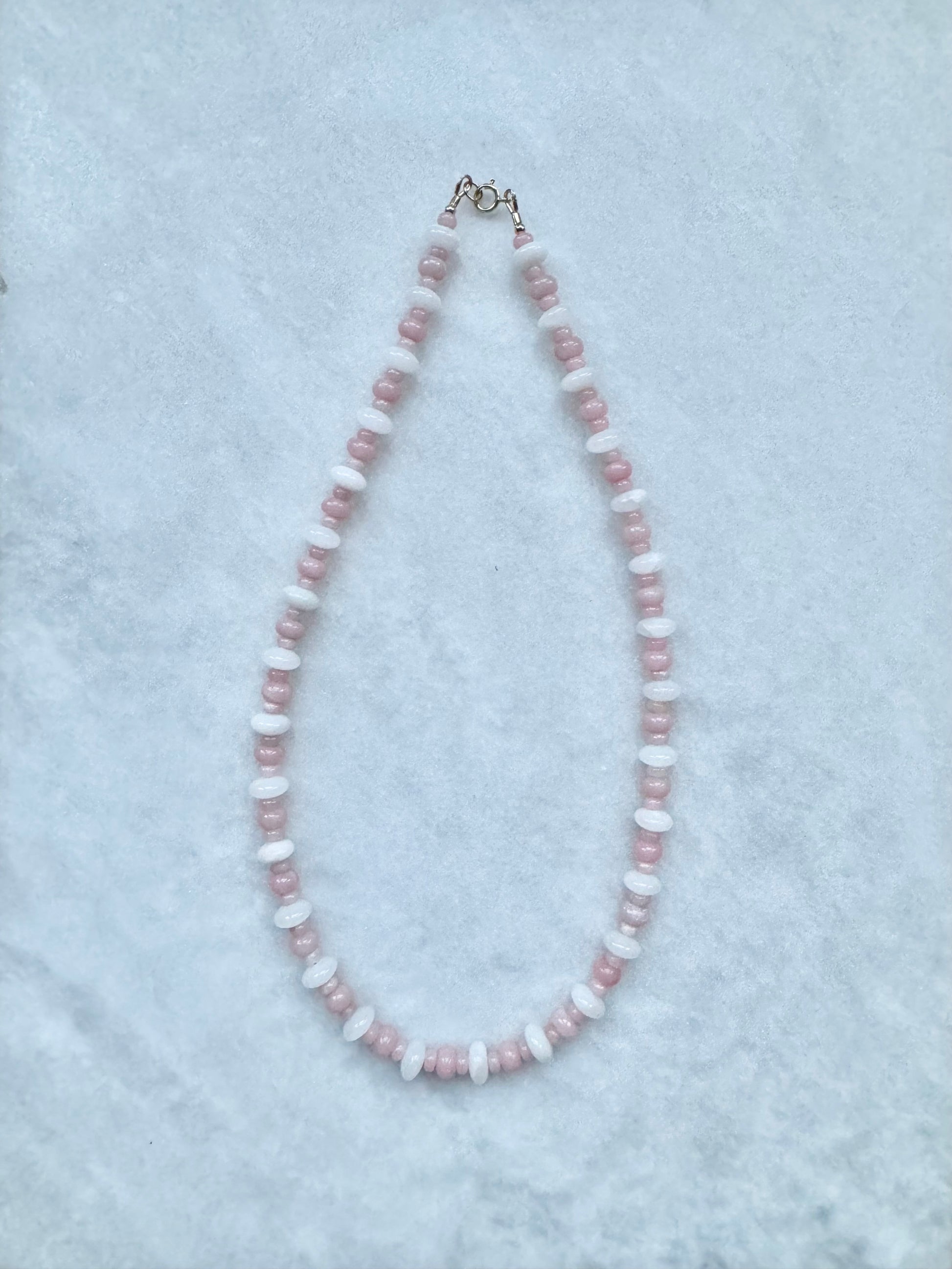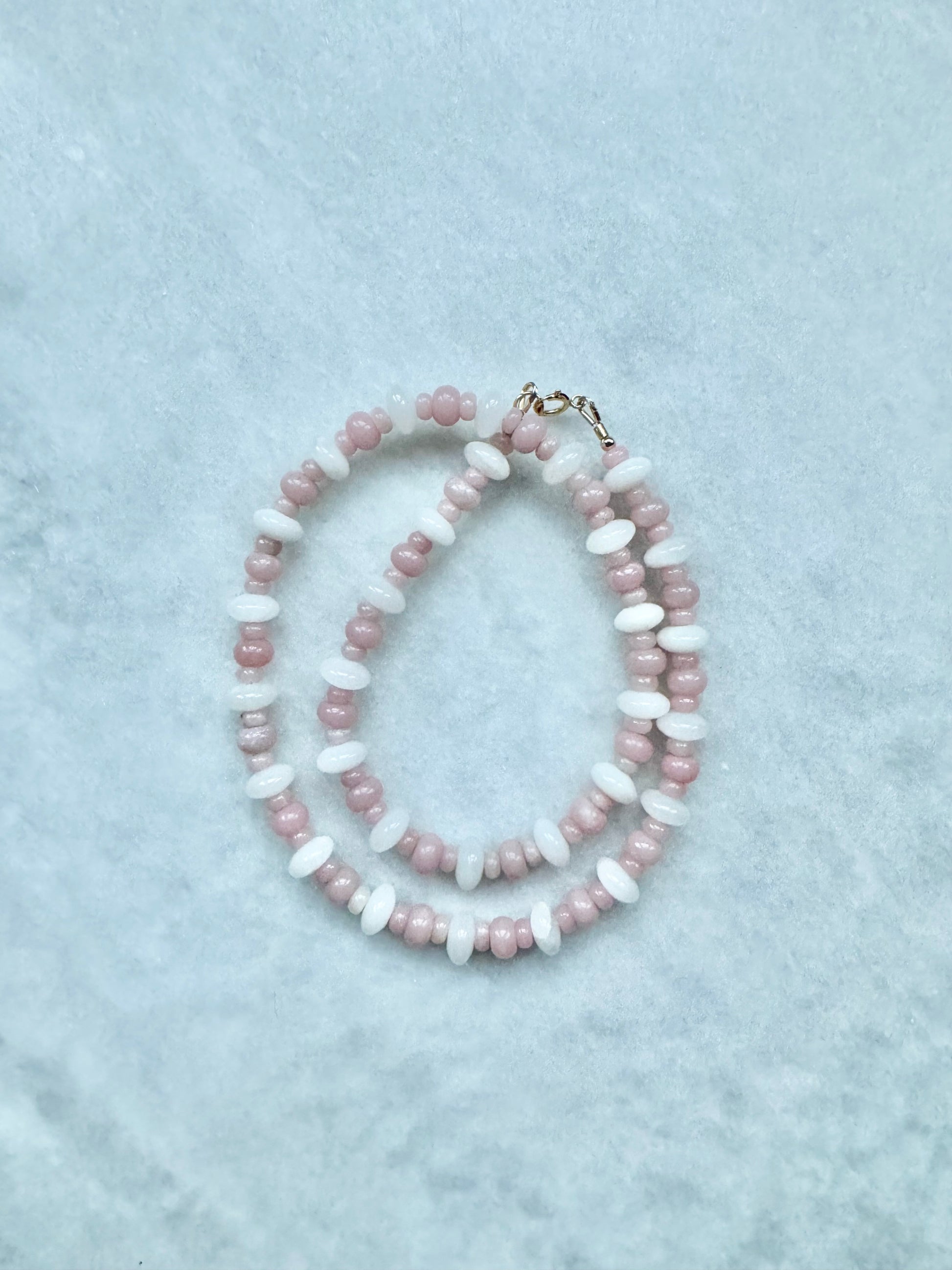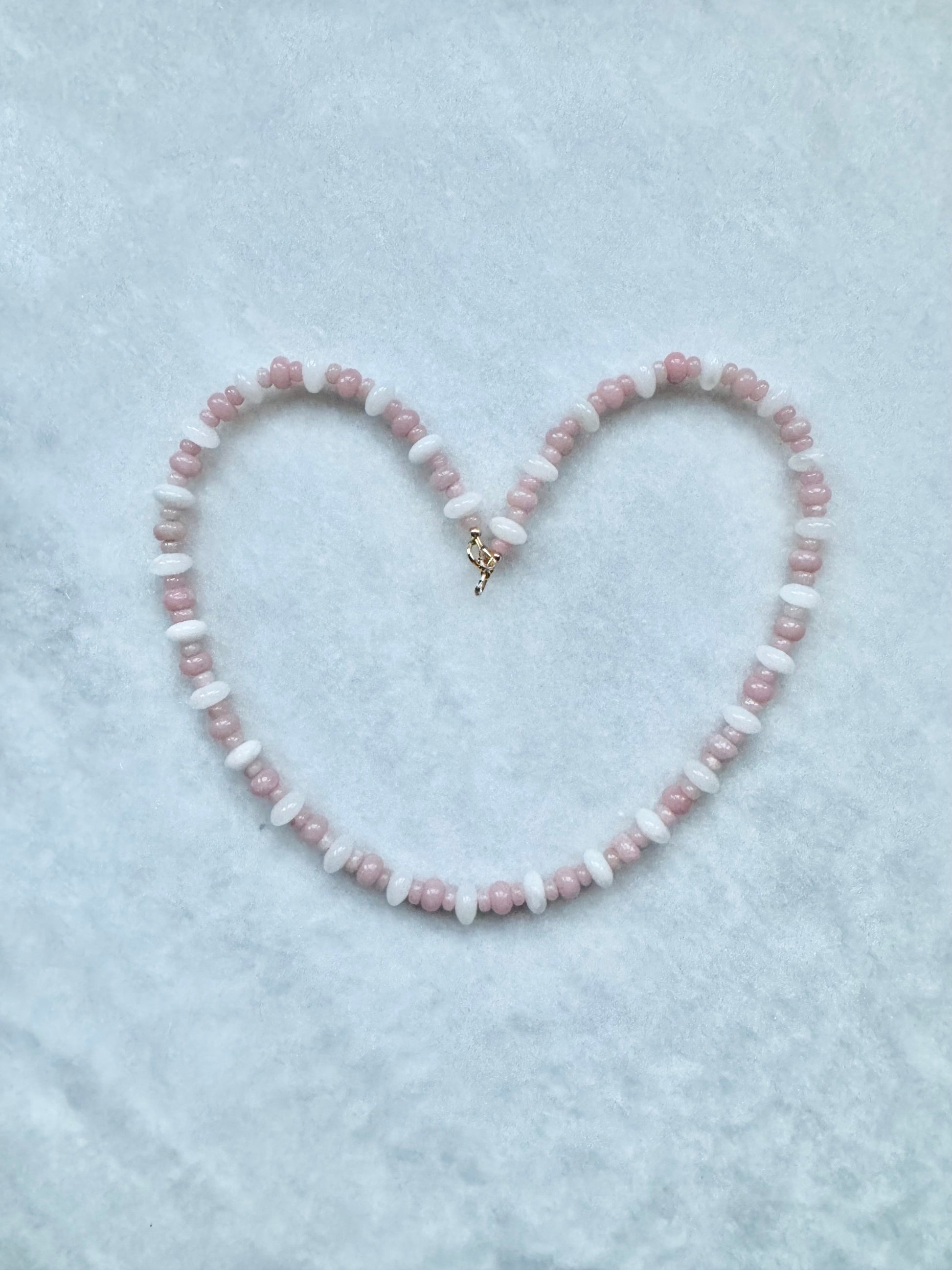 This necklace combines the delicate hues of Pink Opal and White Jade rondelle beads with a gold-filled clasp.