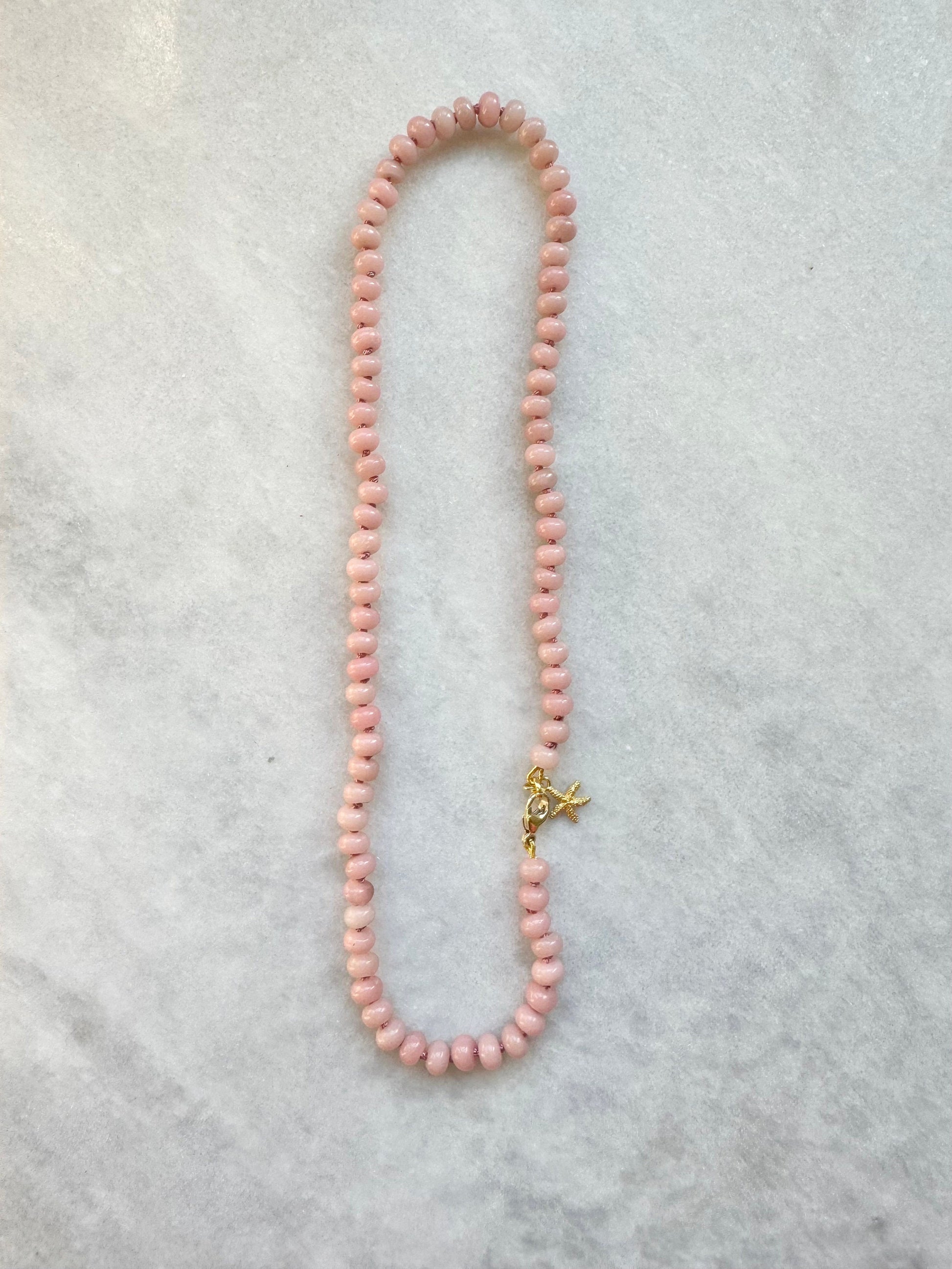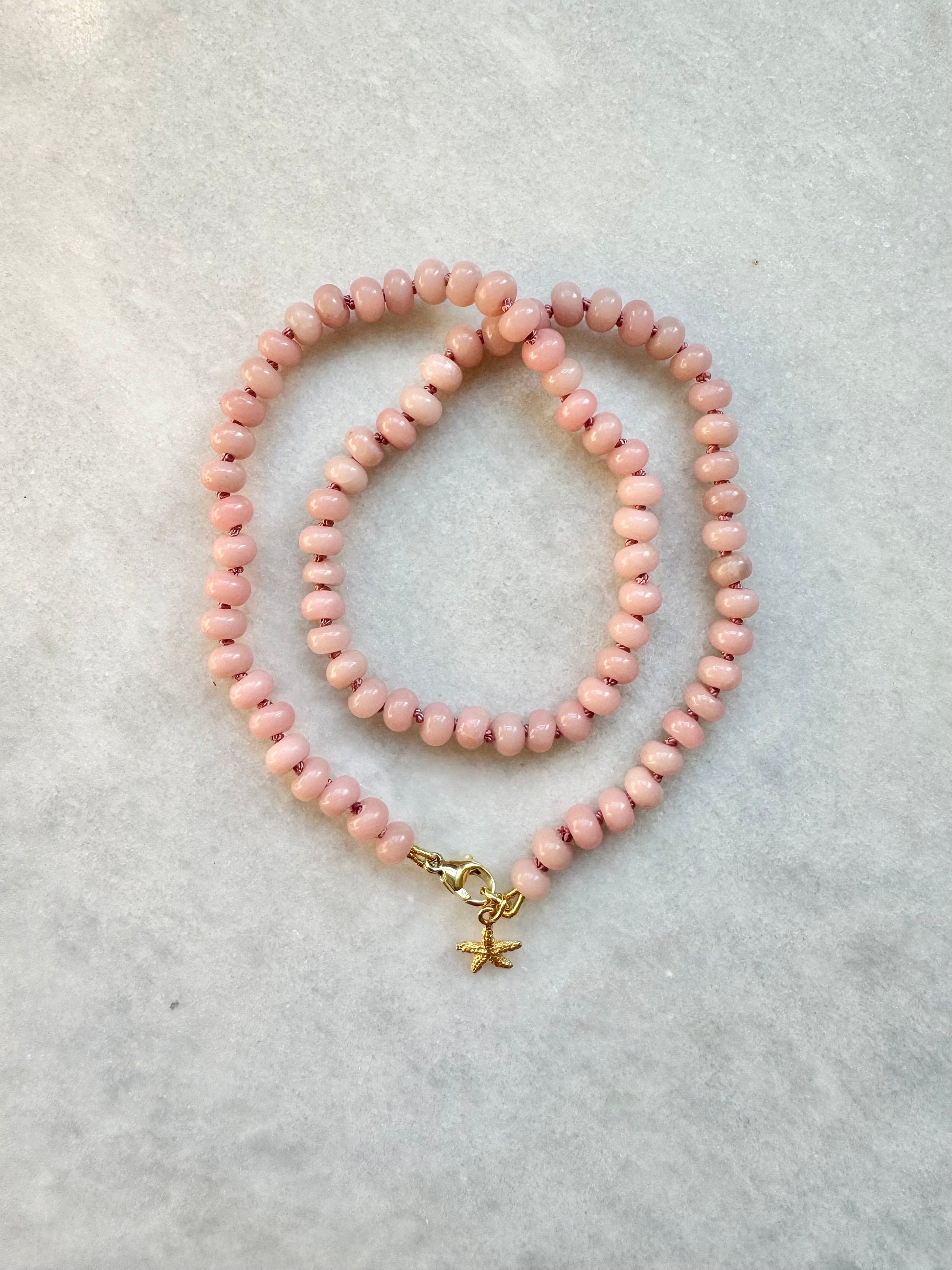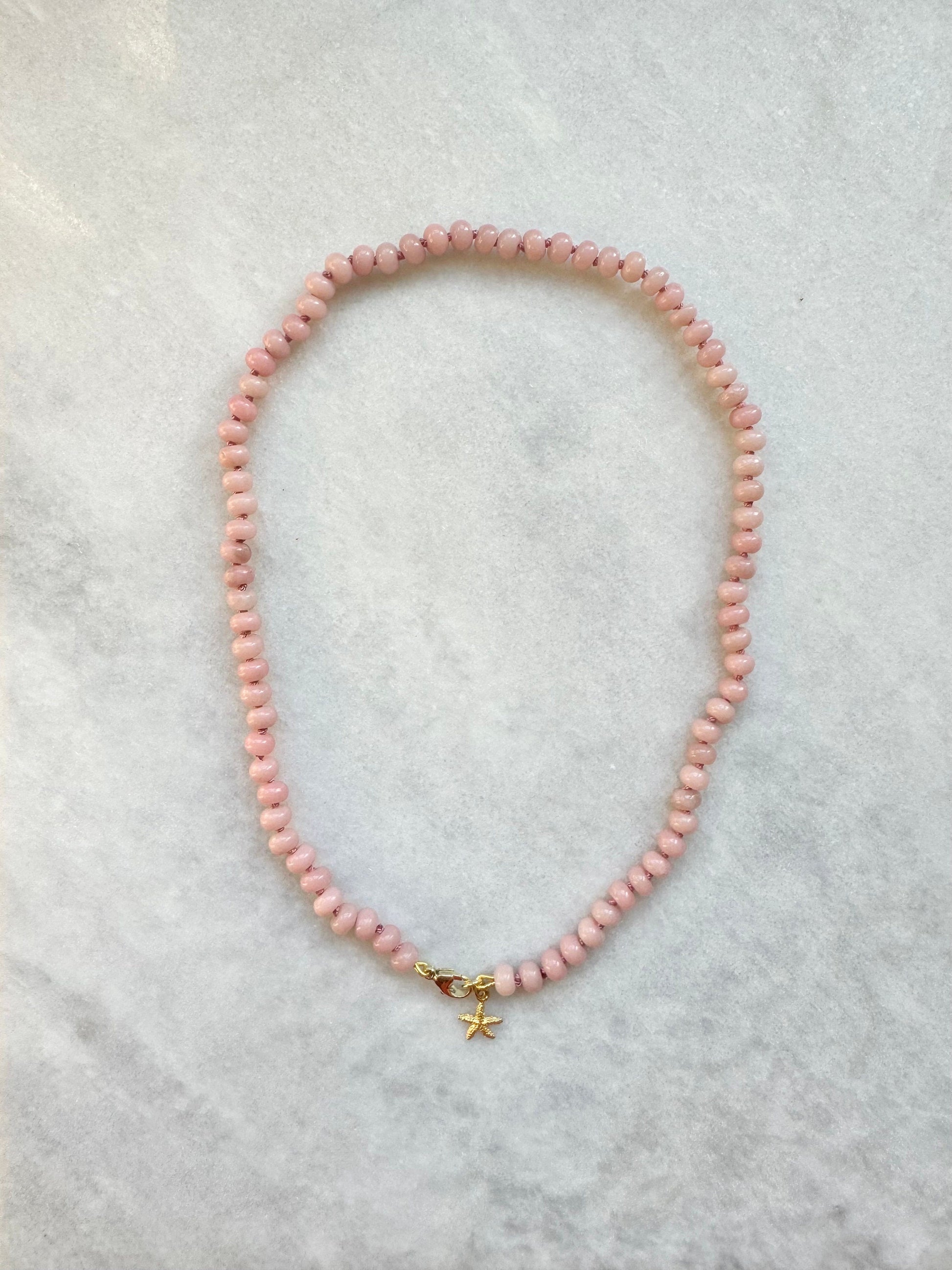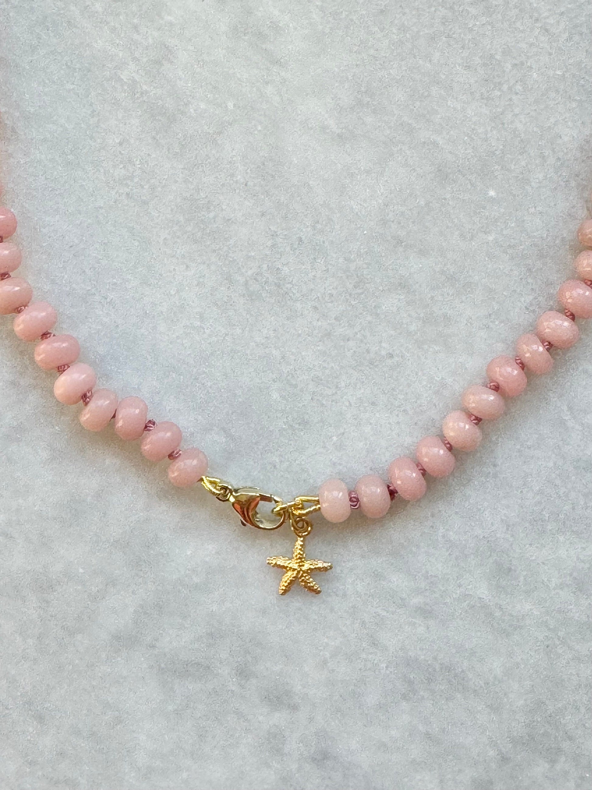 This necklace has been made of pink opal rondelles hand knotted on dusty pink silk thread, finished with a gold vermeil lobster clasp and a tiny starfish charm.