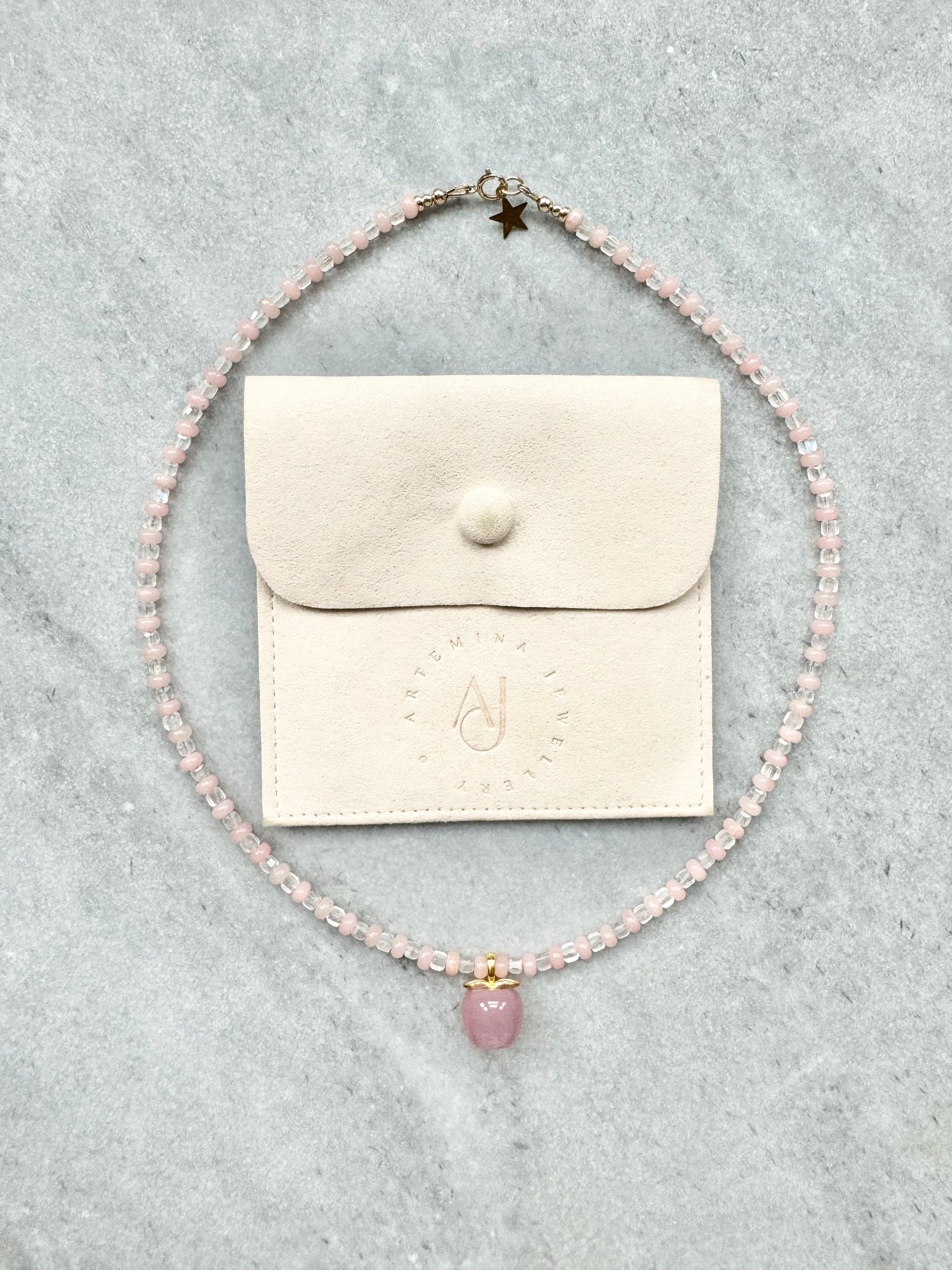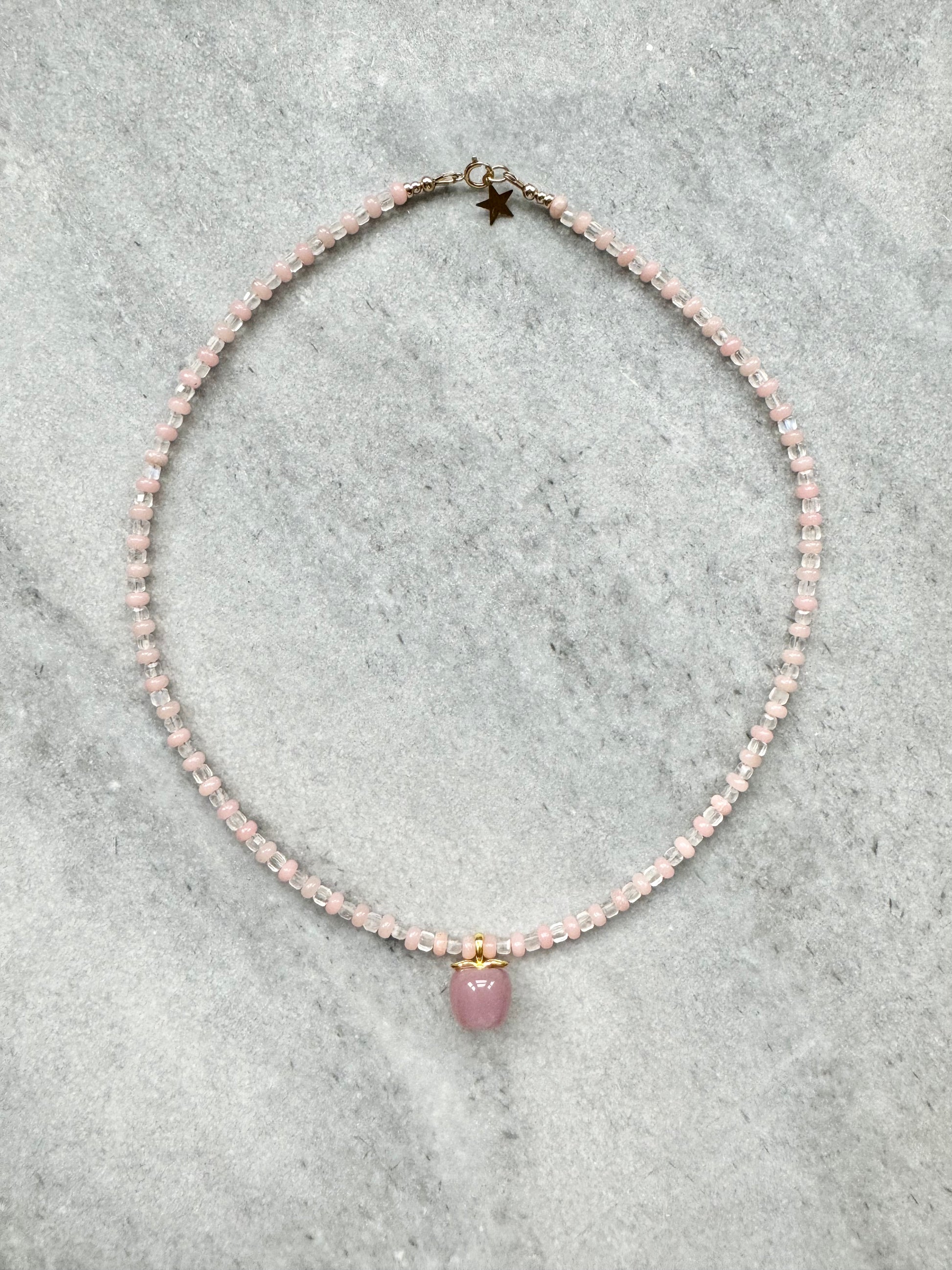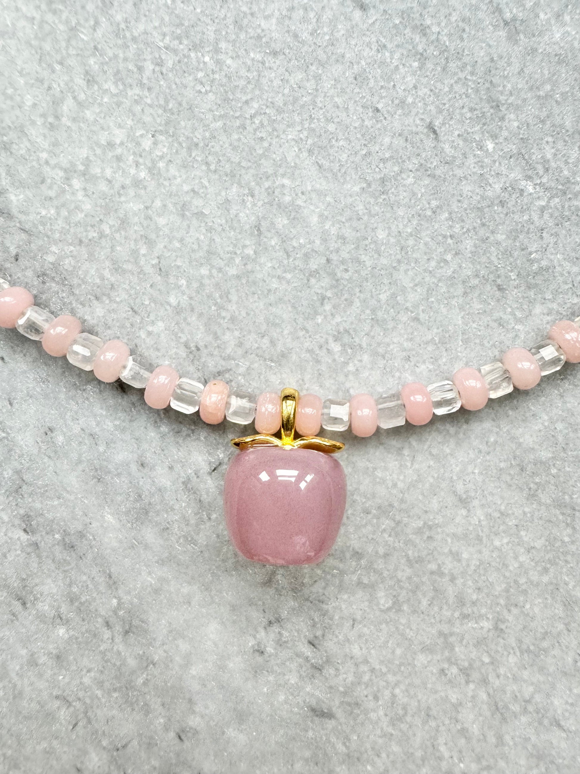 This beaded necklace features the light pink opal and radiant topaz cubes, and is finished with a unique agate apple pendant and a gold-filled clasp.