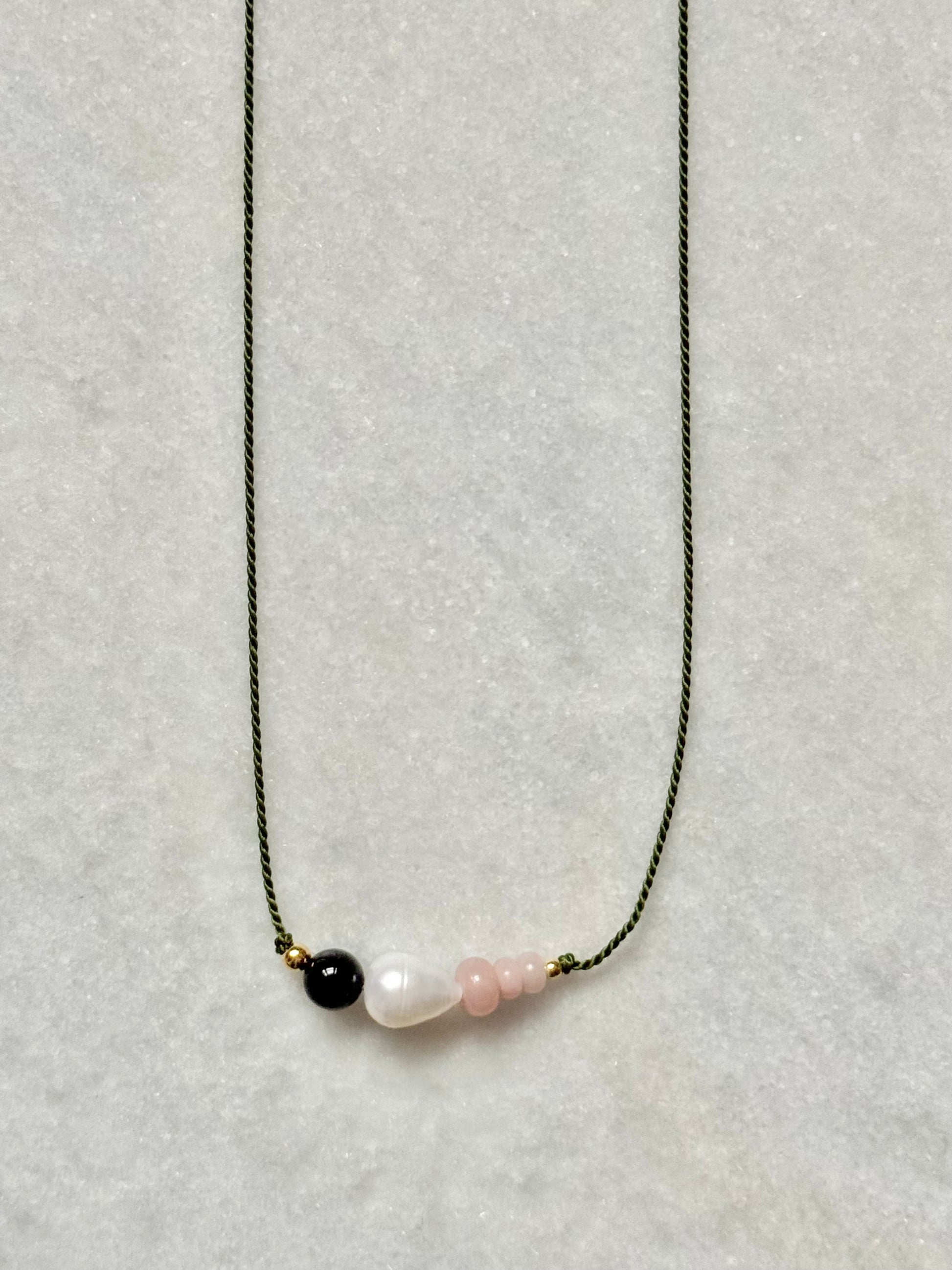 This pendant necklace features pink opal, black tourmaline, and a pearl, symbolising love, healing, and self-acceptance for October. The added pearl lends a graceful accent to the design.
