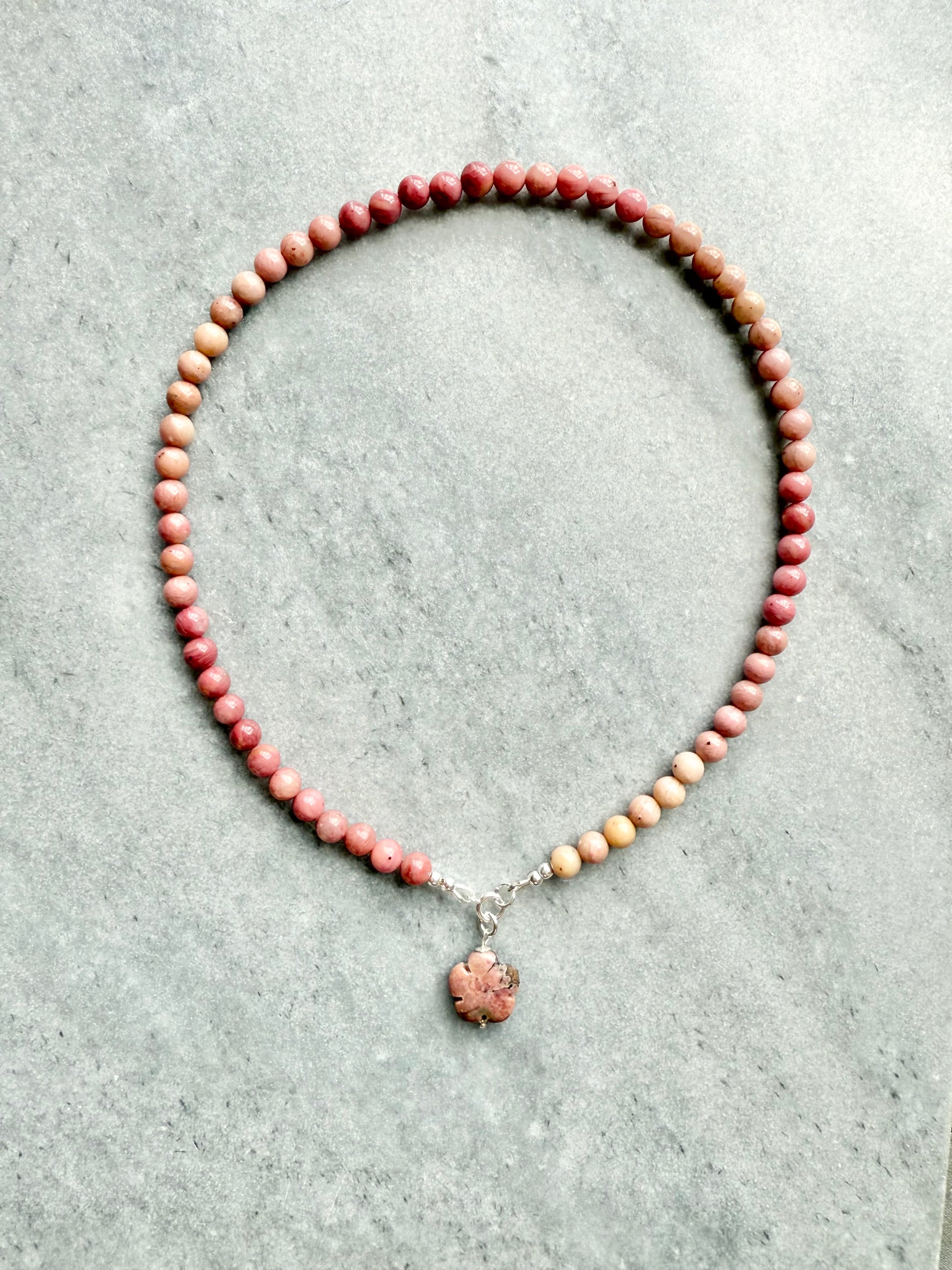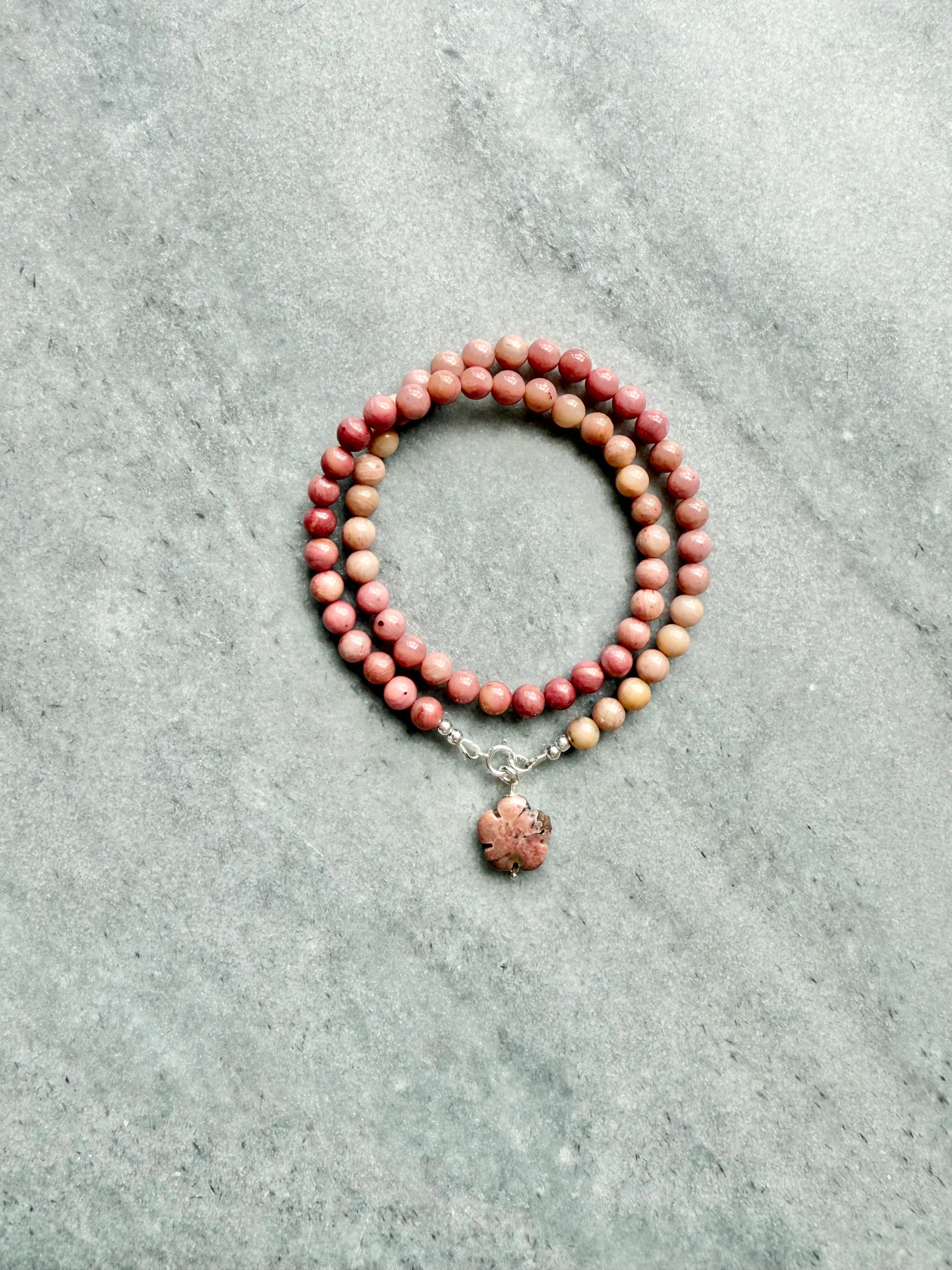 It features a secure sterling silver clasp and a detachable Rhodonite flower charm, giving you the option to personalise your look.