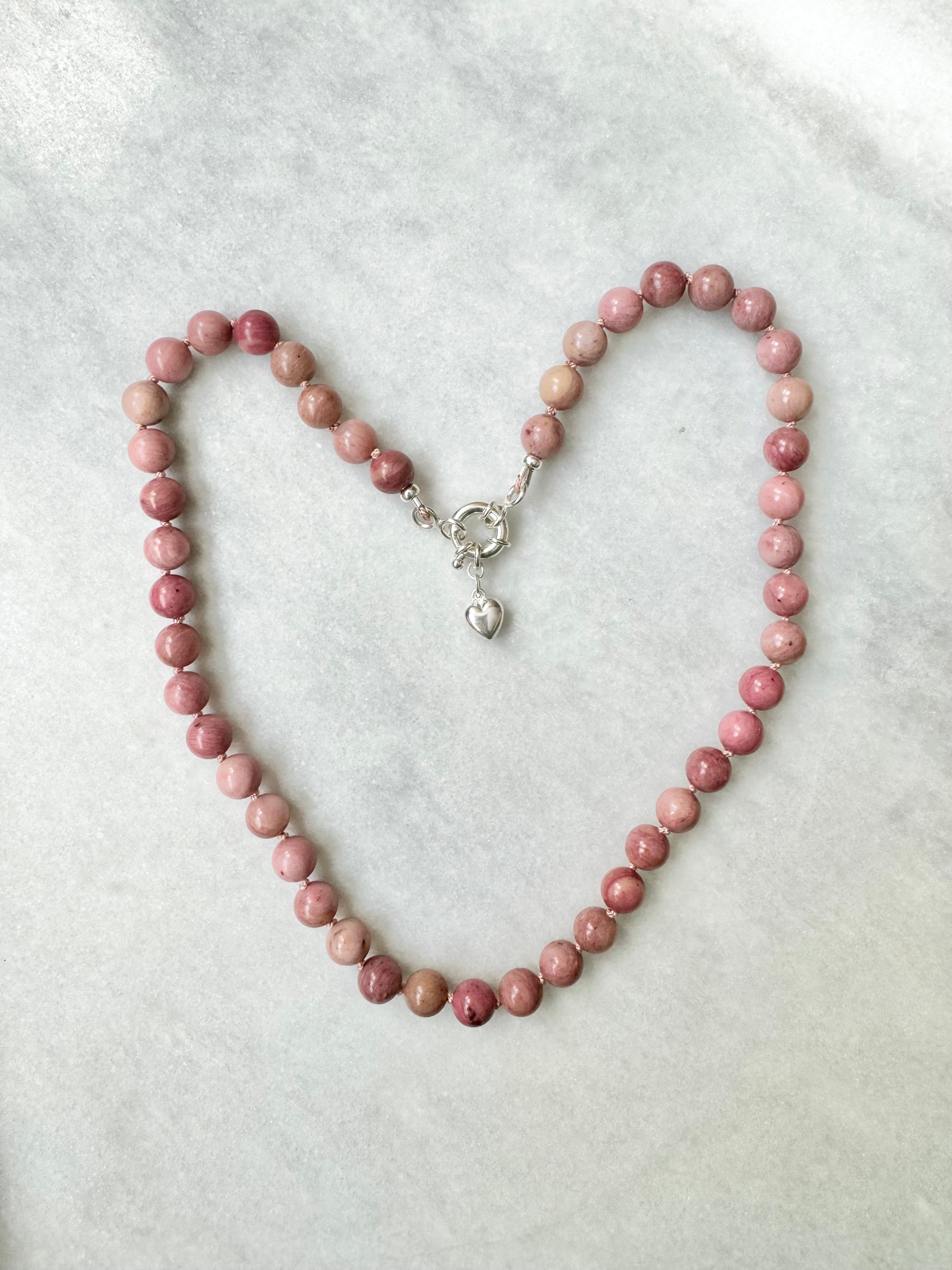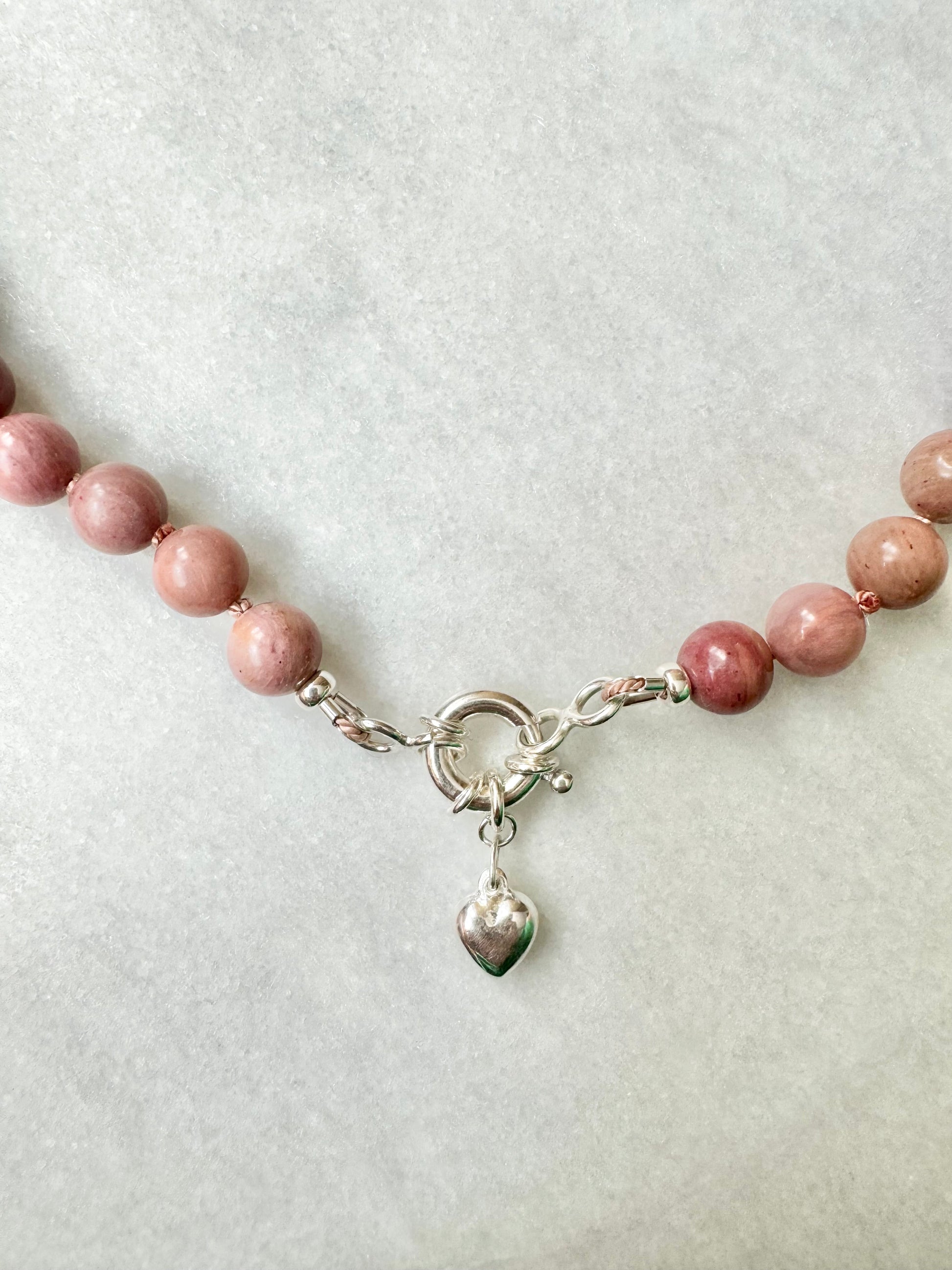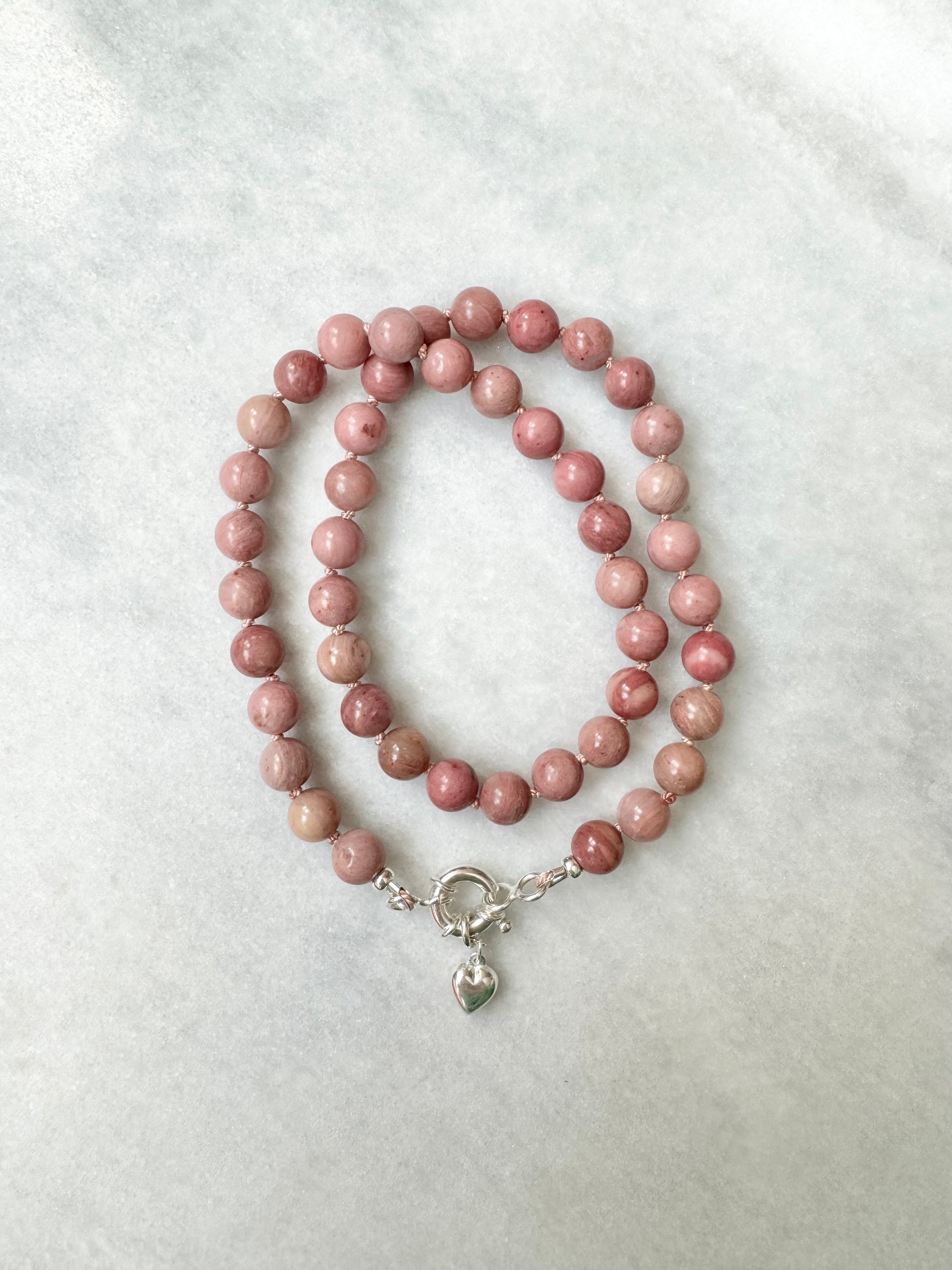 Round Pink Rhodonite beads, hand-knotted on light pink silk thread are finished with a sterling silver sailor clasp and accented by a heart charm.