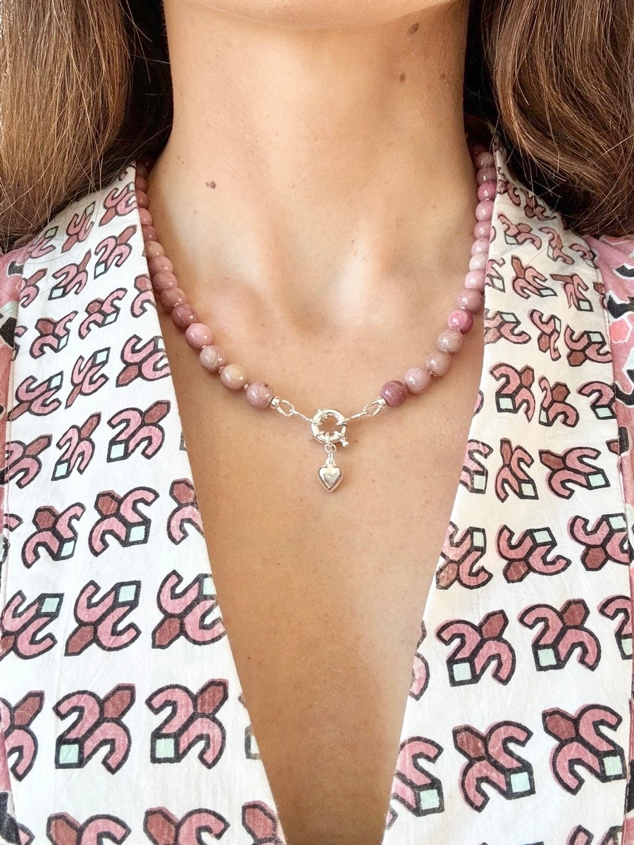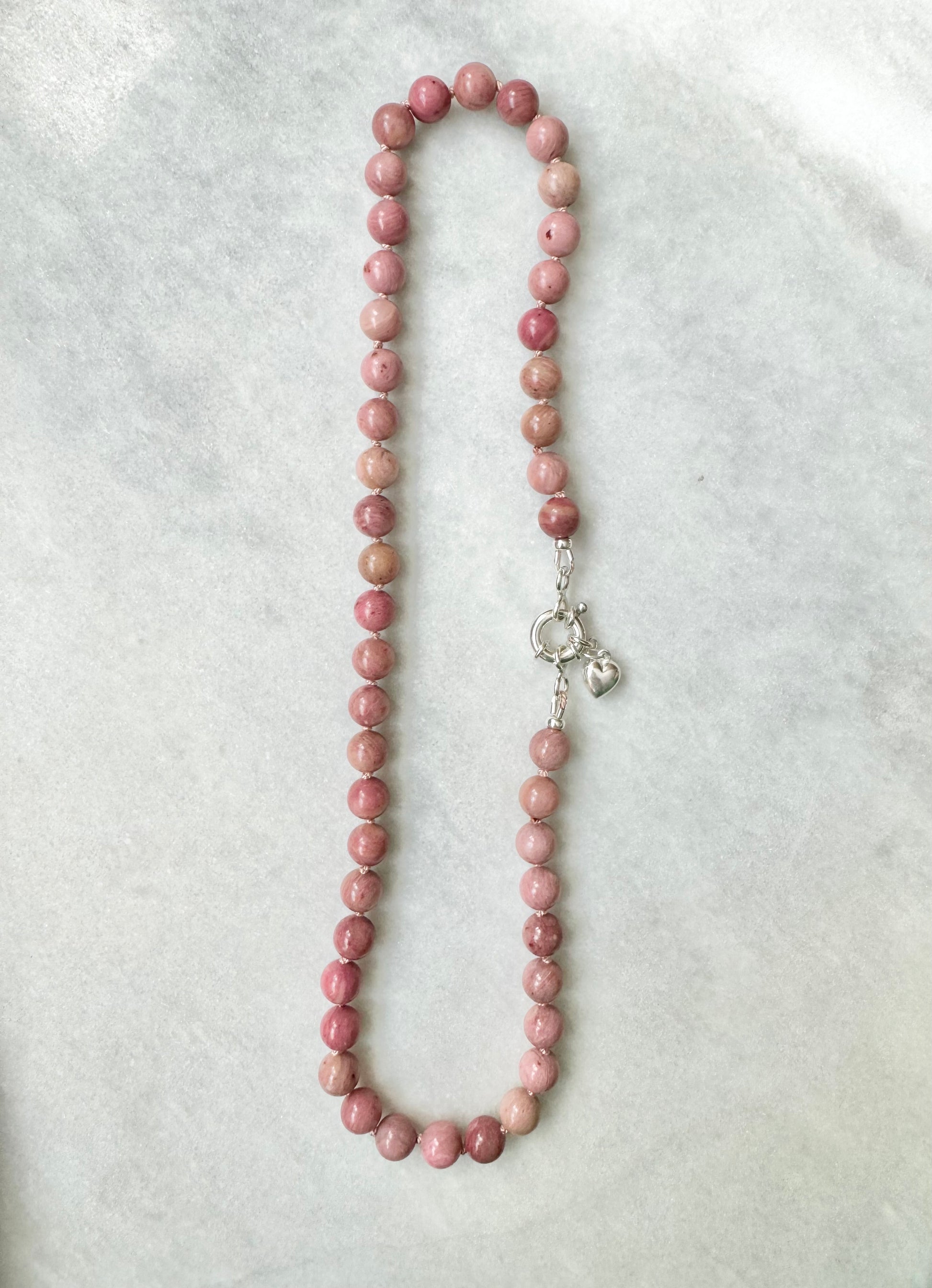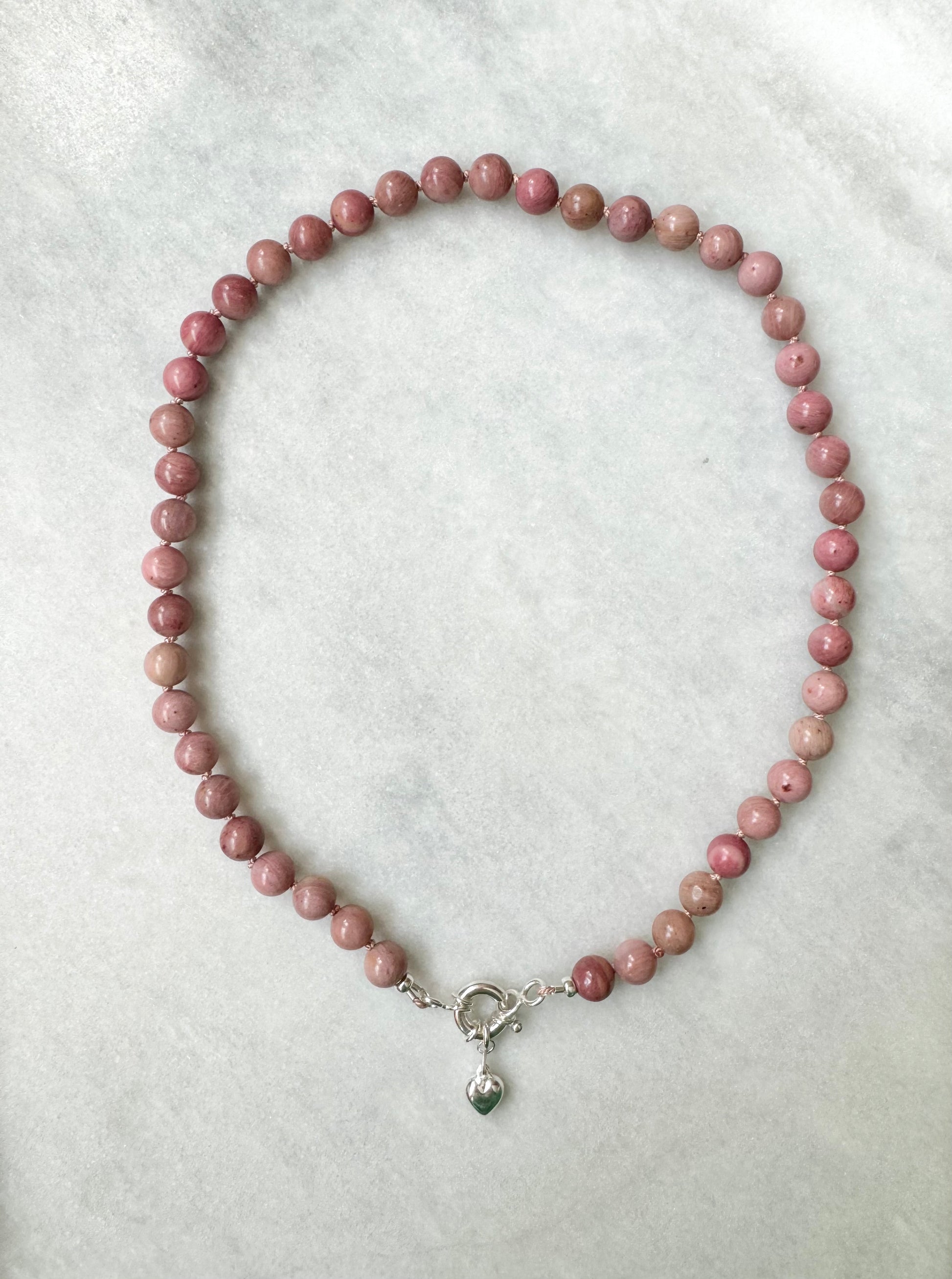 Round Pink Rhodonite beads, hand-knotted on light pink silk thread are finished with a sterling silver sailor clasp and accented by a heart charm.