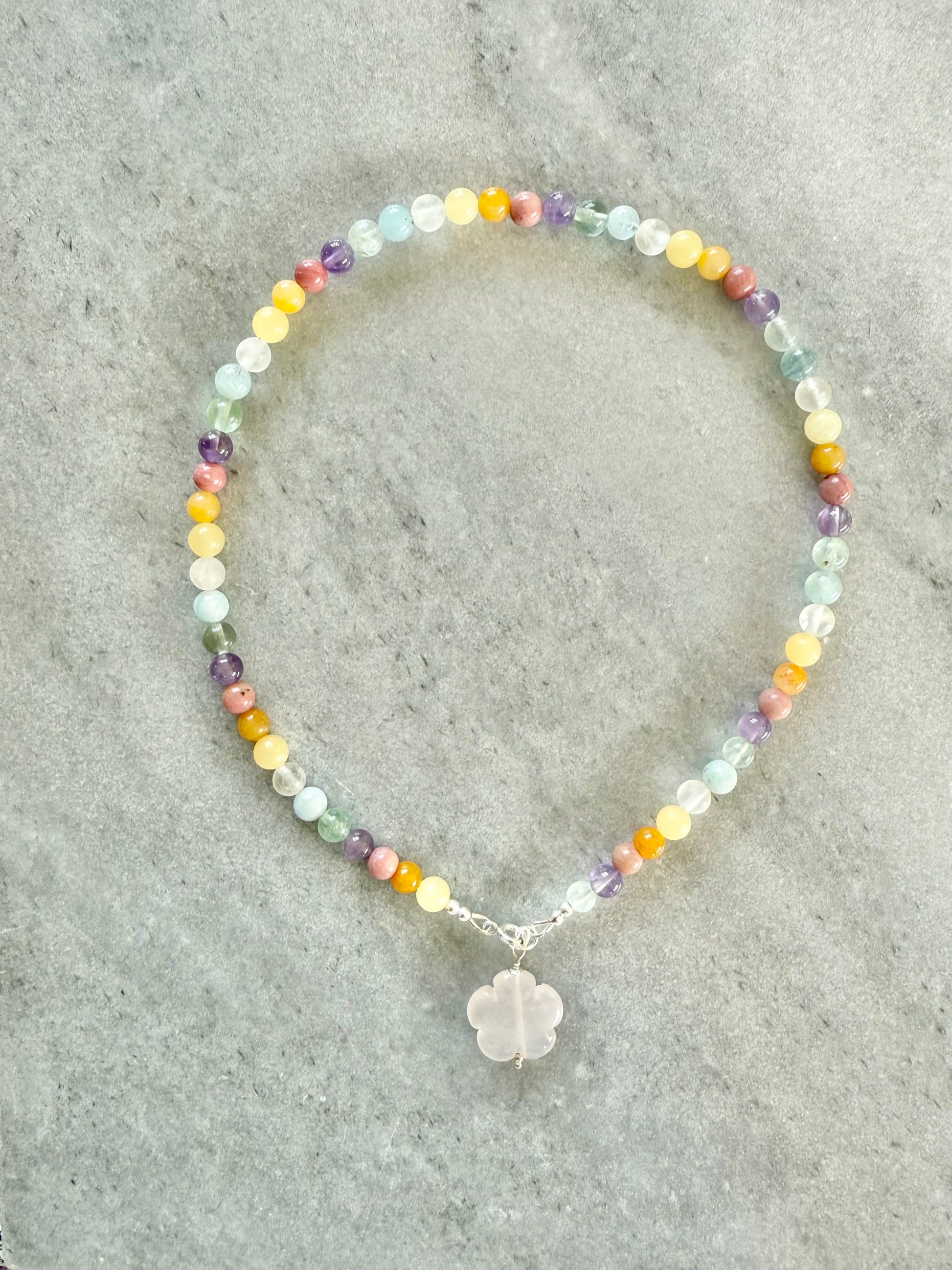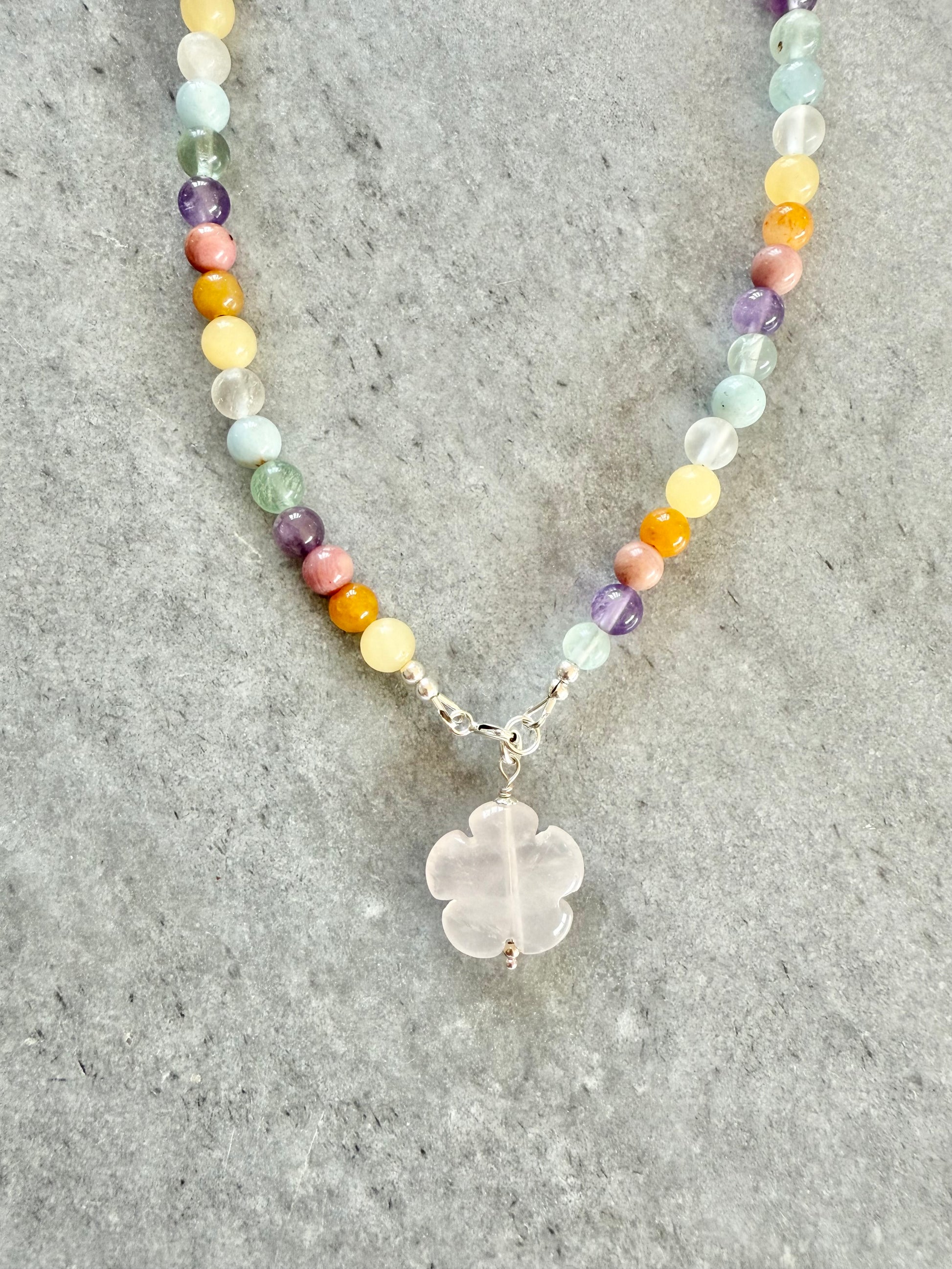 It features a secure sterling silver clasp and a detachable Rose Quartz flower charm, giving you the option to personalise your look.