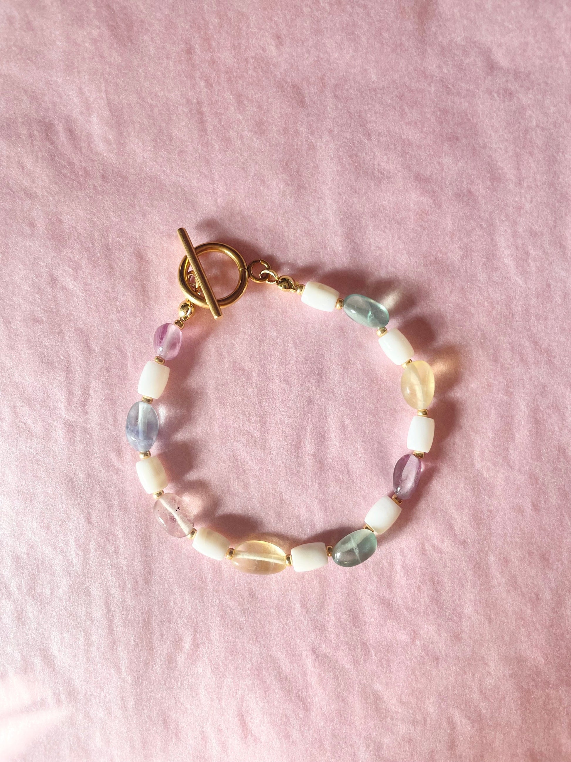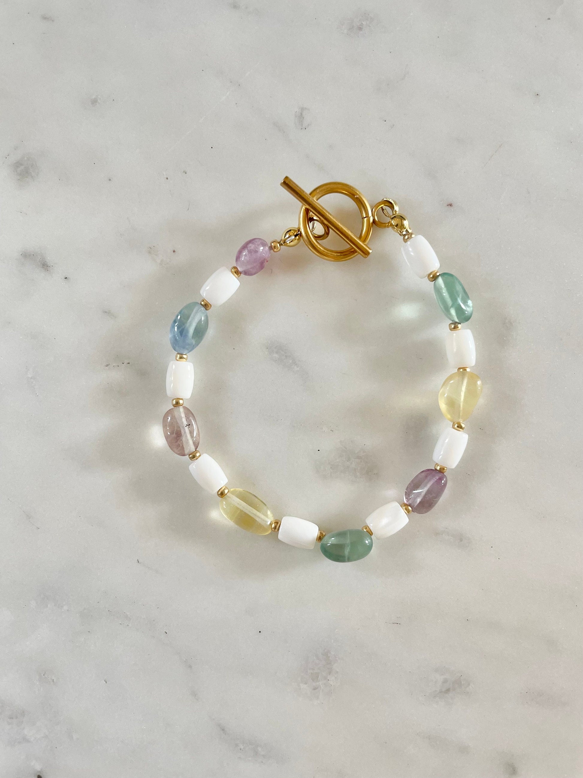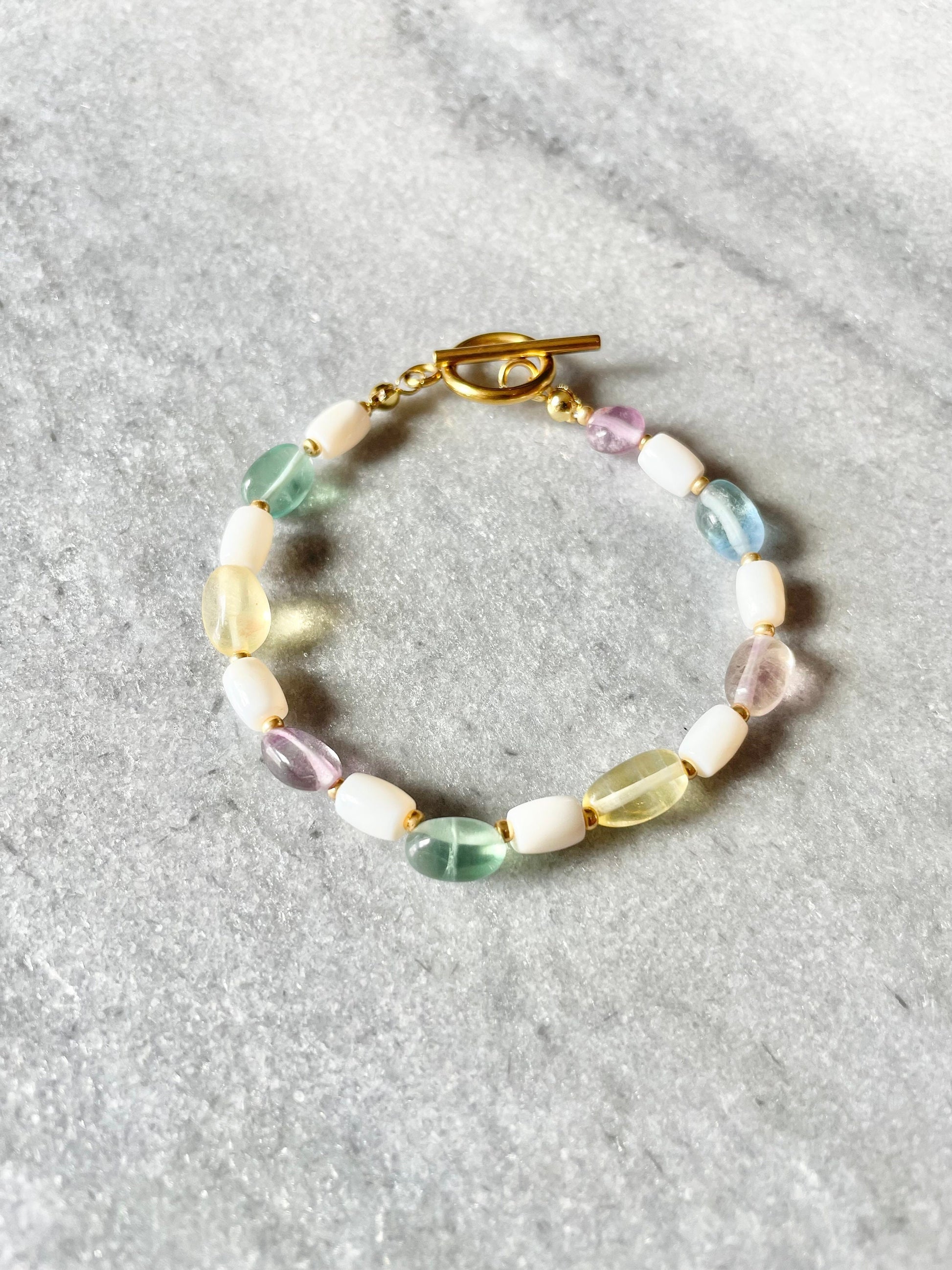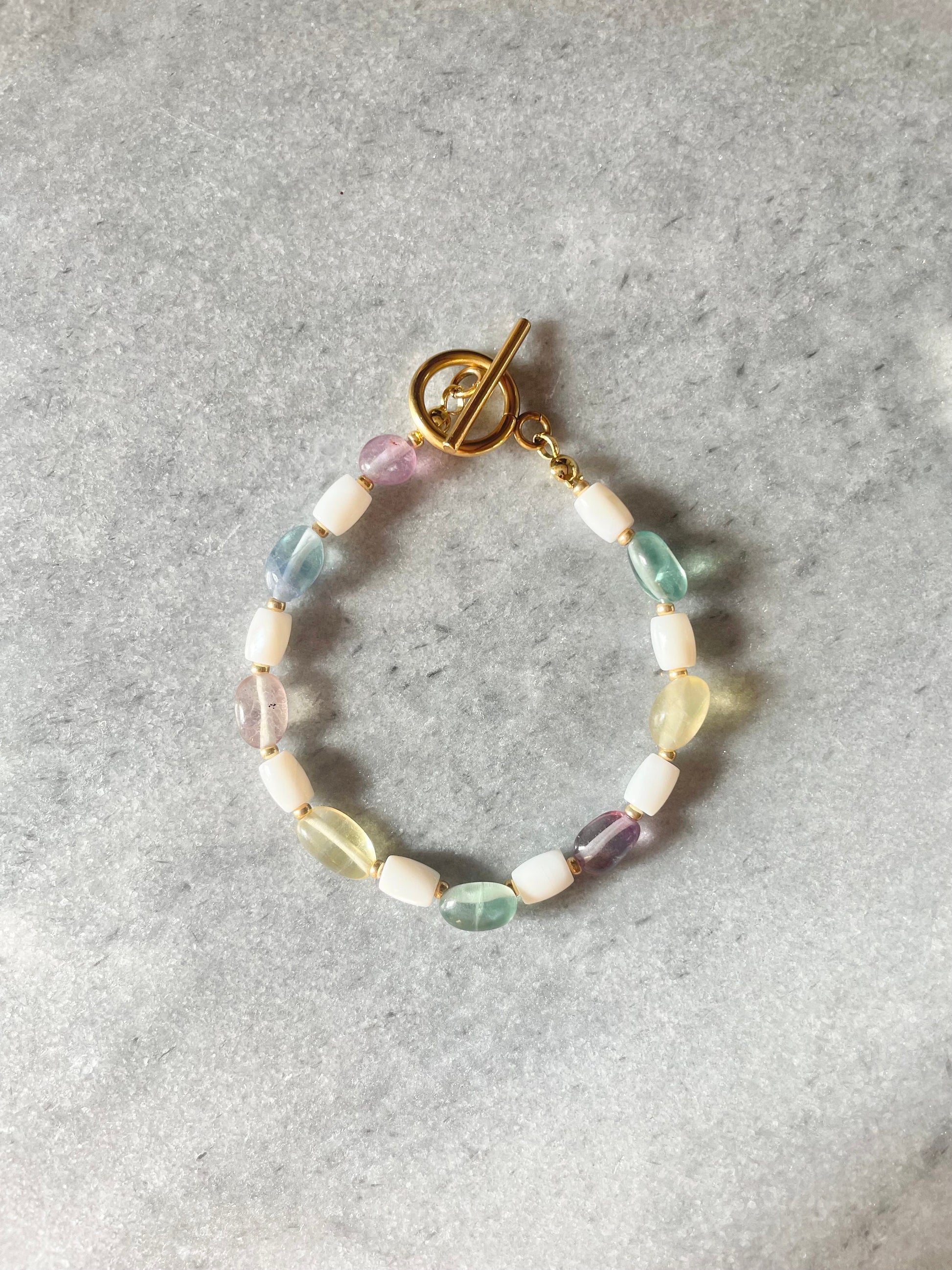 Rainbow fluorite and trochus shell beaded bracelet with gold miyuki spacer beads and a gold plated / gold vermeil toggle clasp.