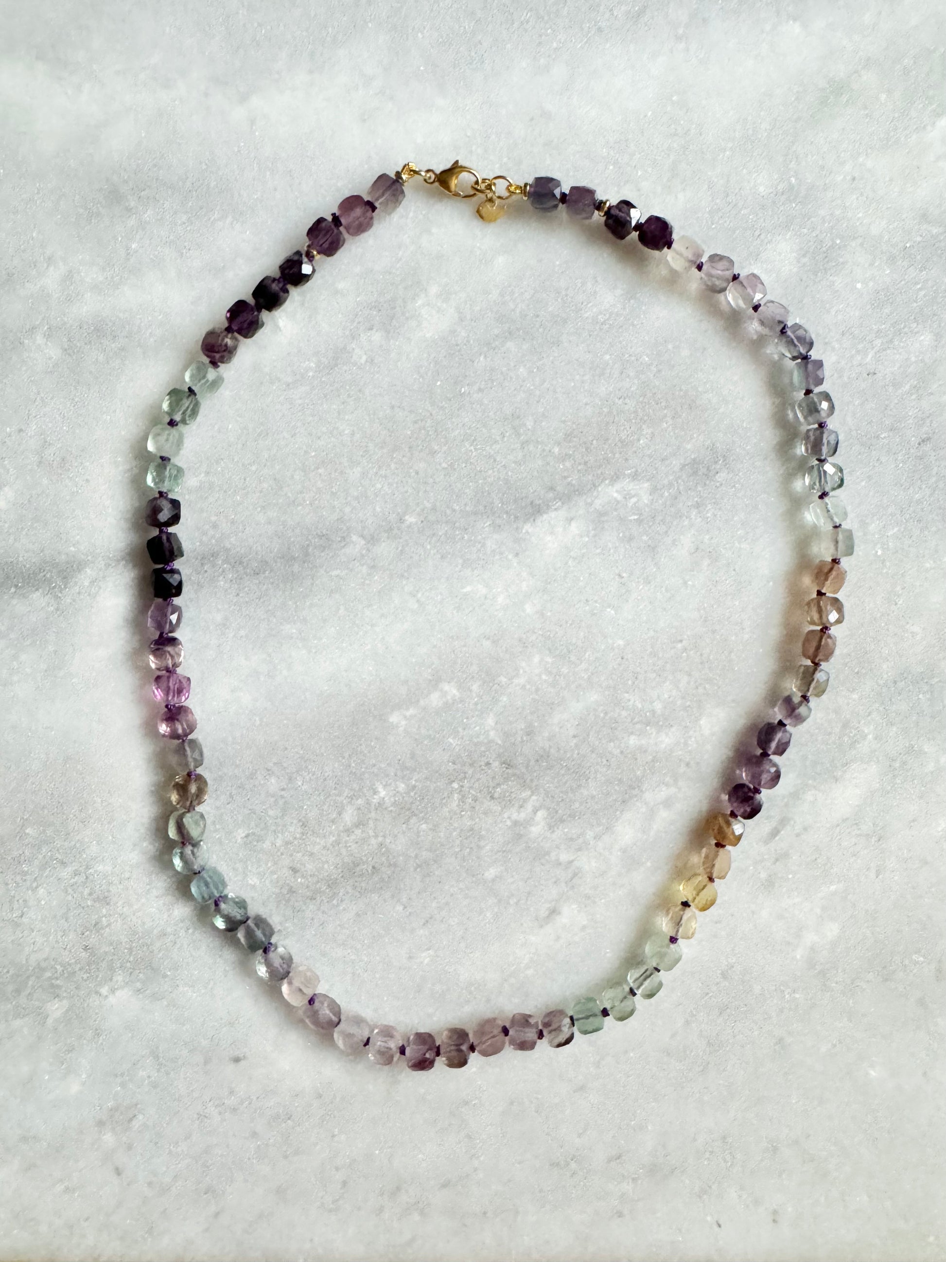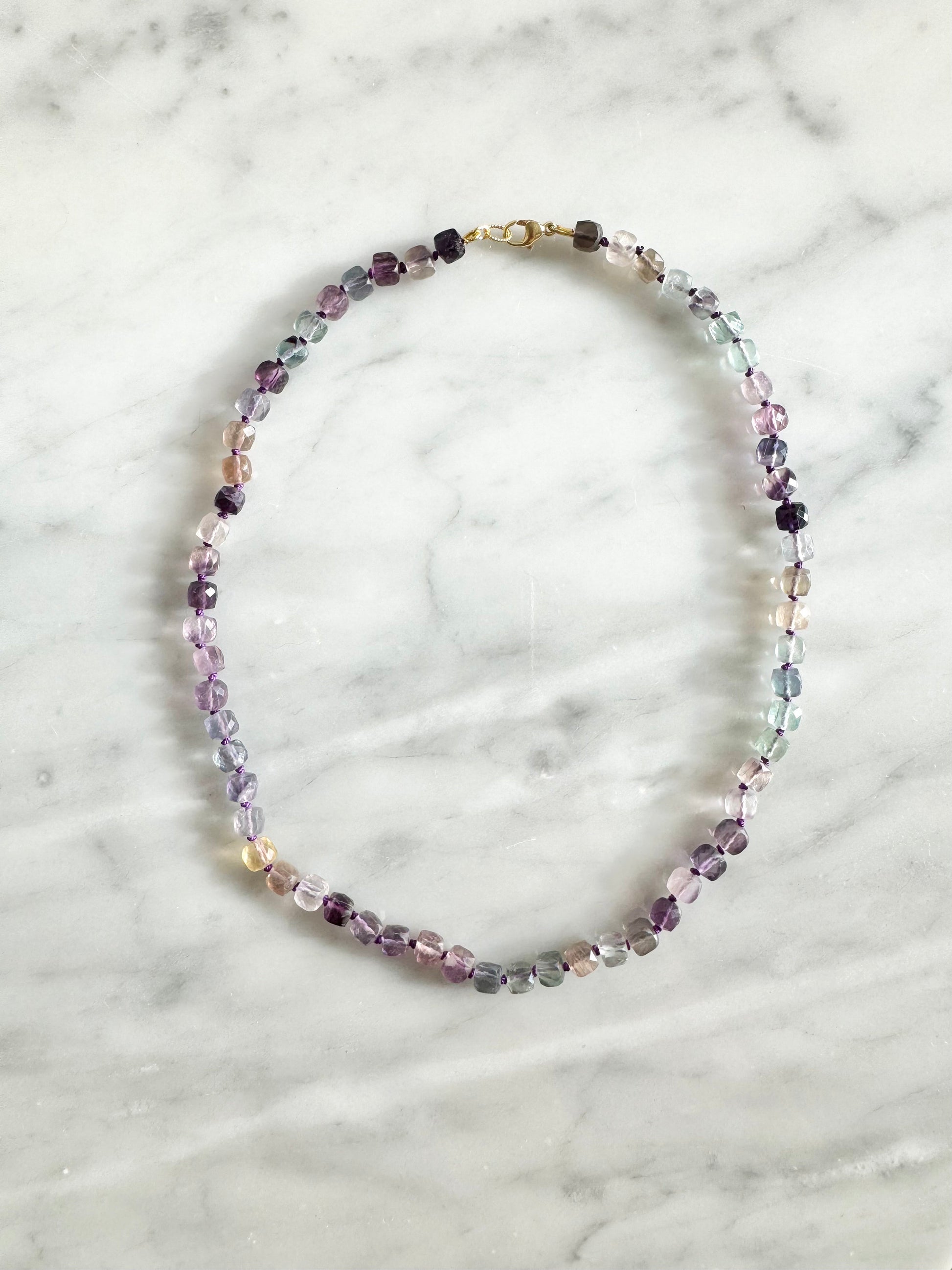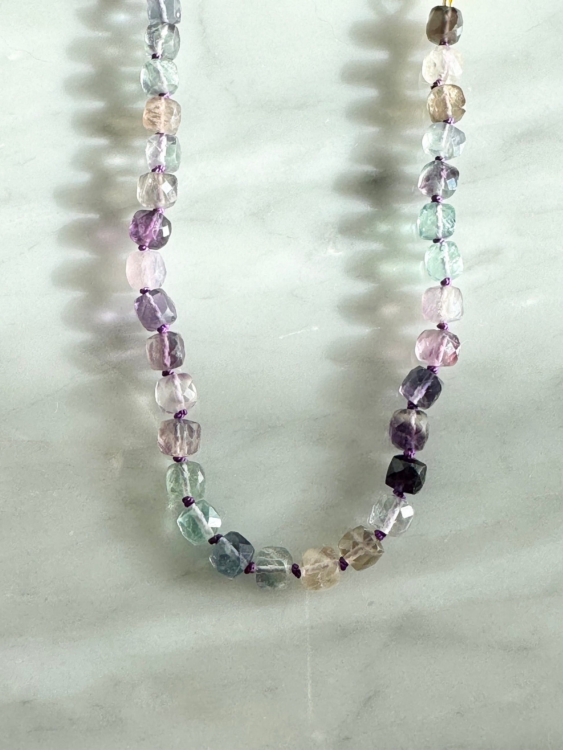 This necklace has been made of rainbow fluorite cubes hand knotted on purple silk thread and finished with a gold vermeil lobster clasp.