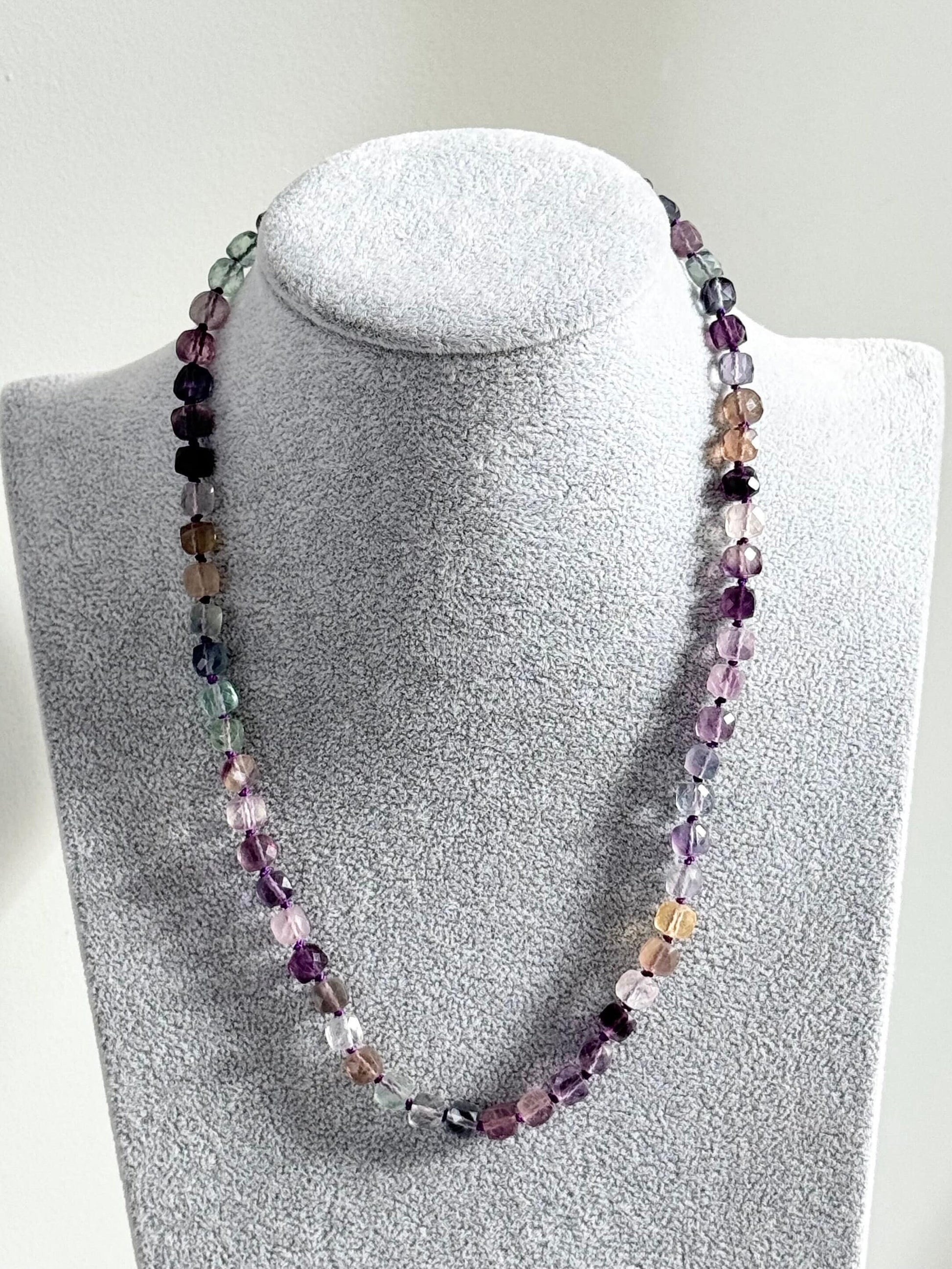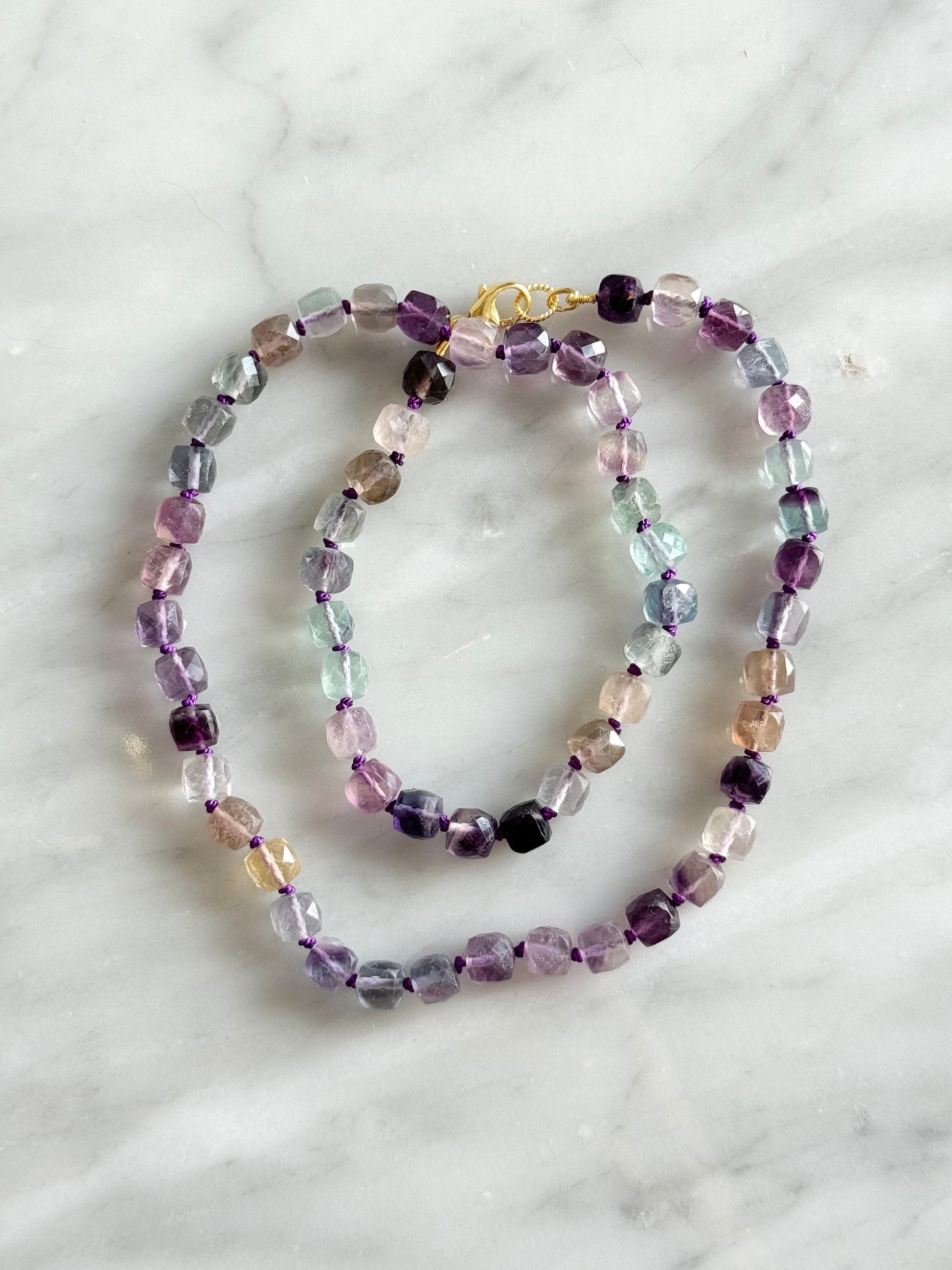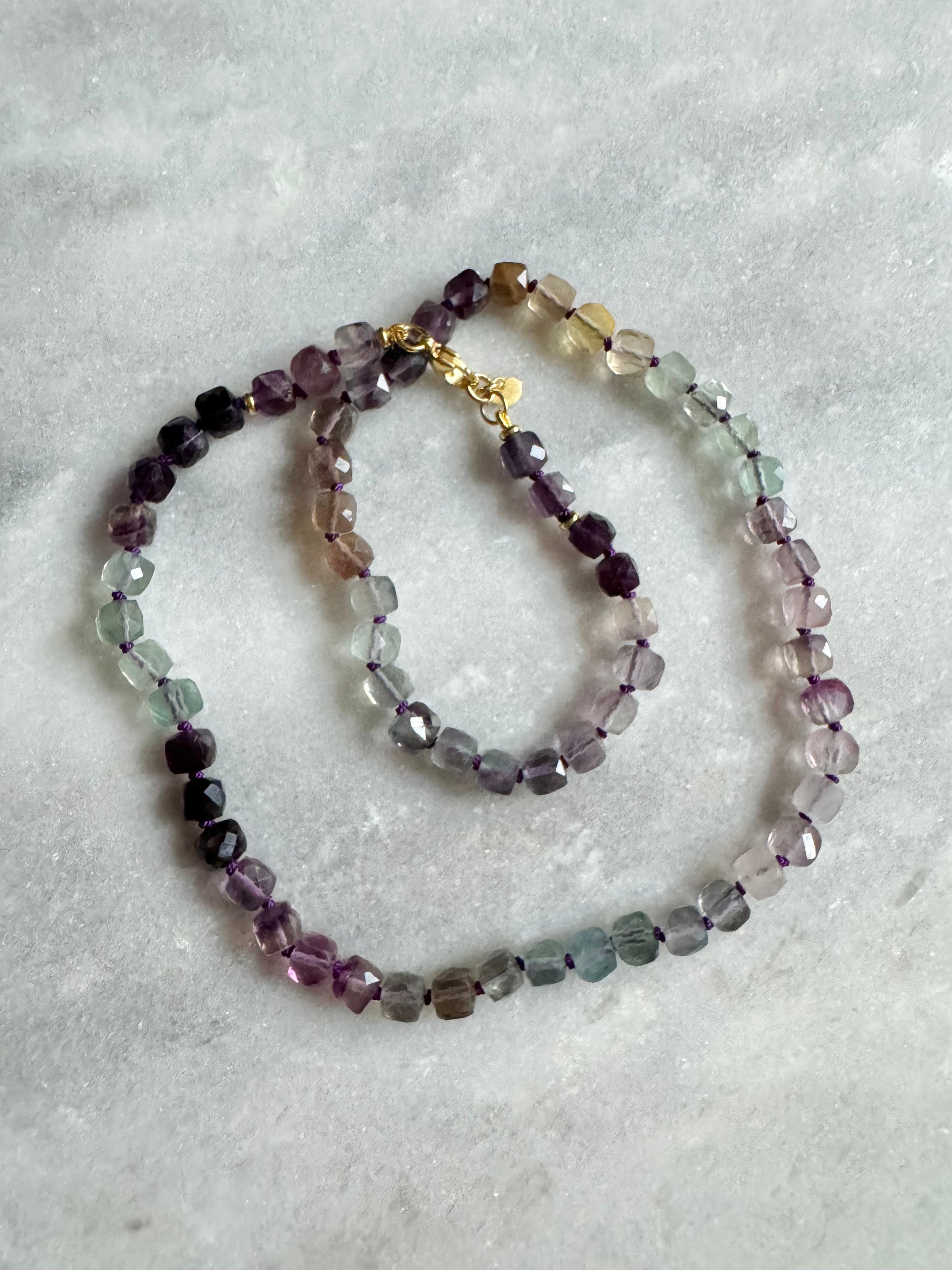 This necklace has been made of rainbow fluorite cubes hand knotted on purple silk thread and finished with a gold vermeil lobster clasp.