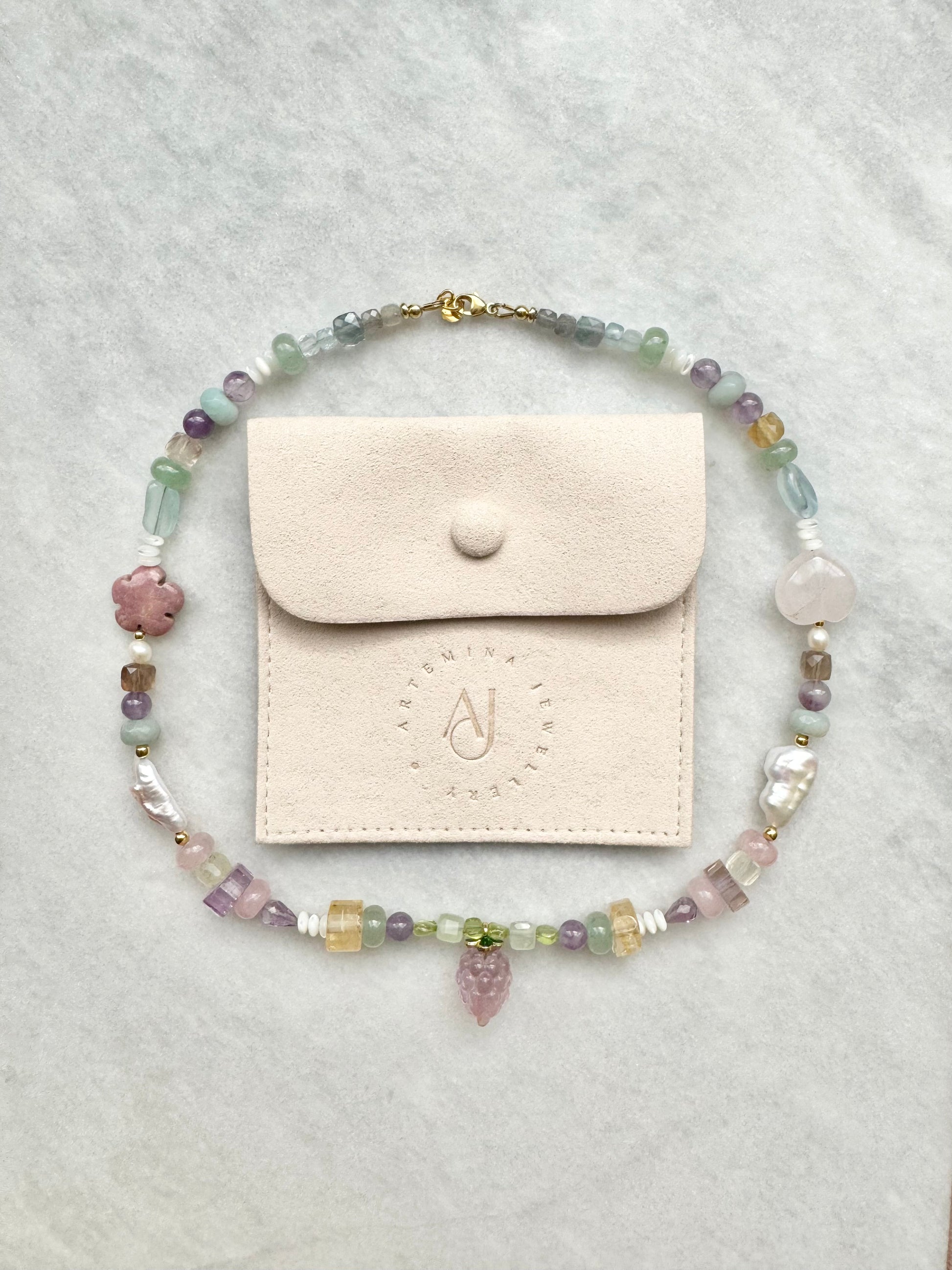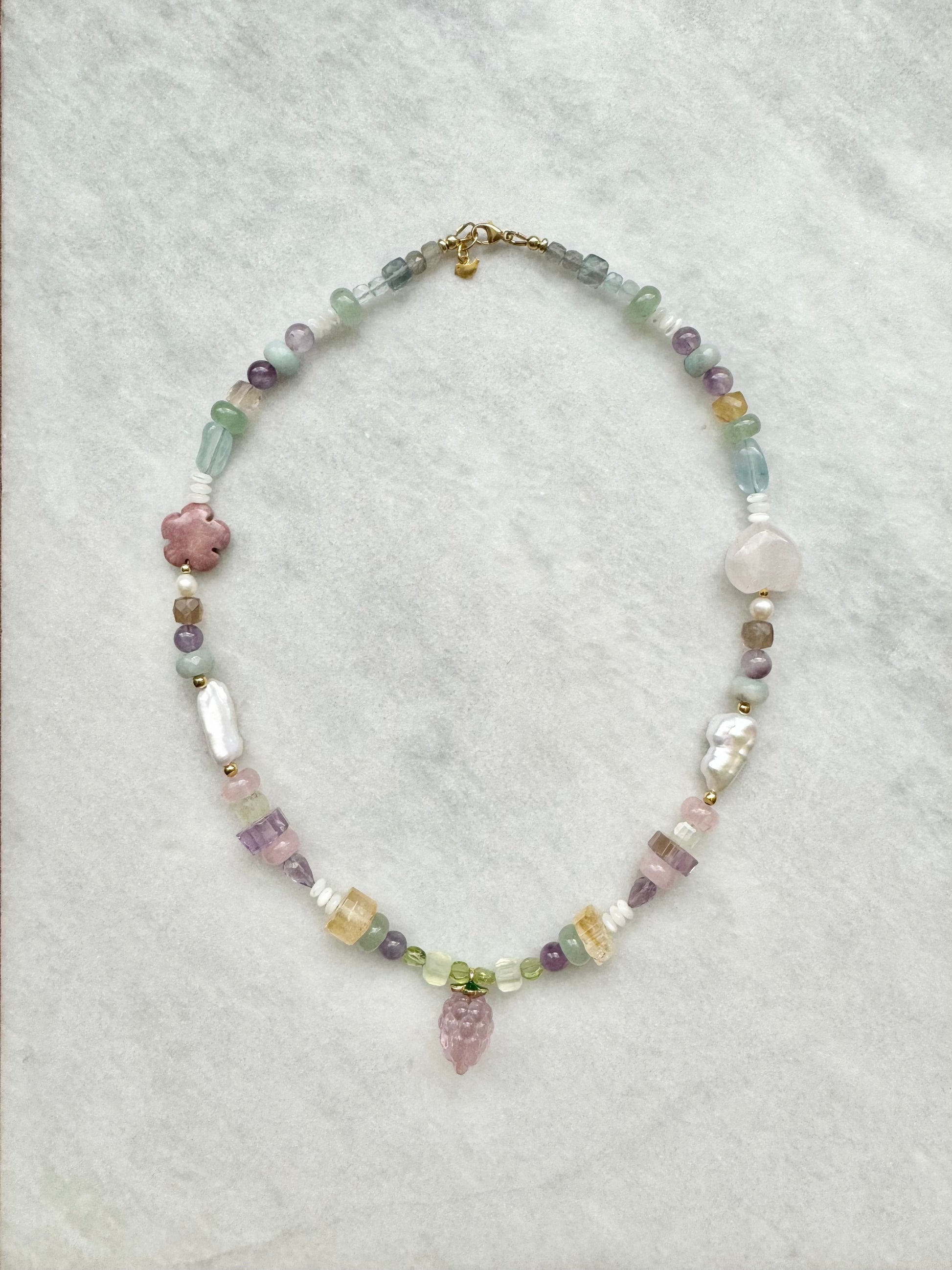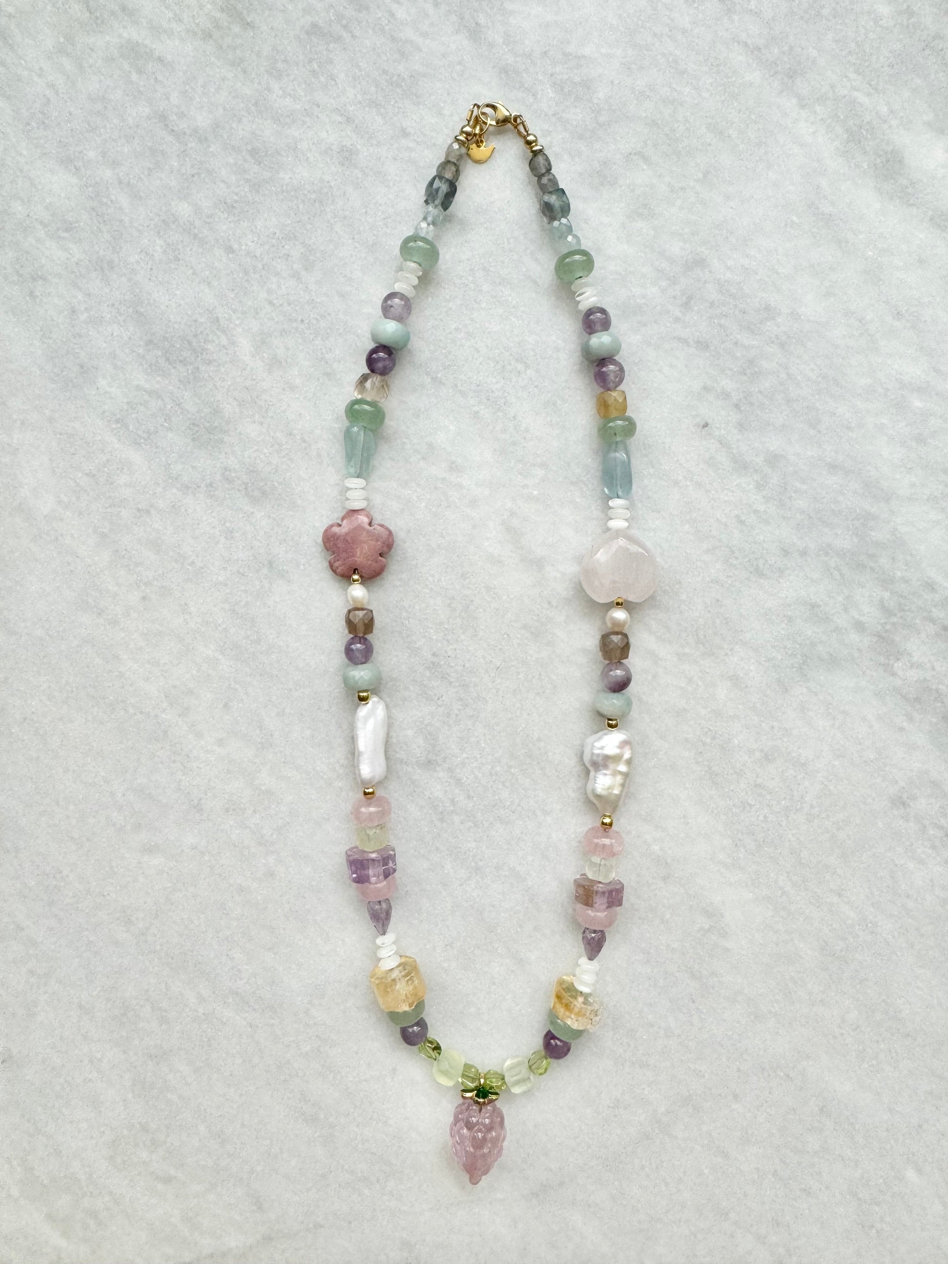 amethyst, ametrine, aquamarine, prehnite, fluorite, labradorite, rhodonite & rose quartz, finished with fluorite fruit charm and gold vermeil clasp