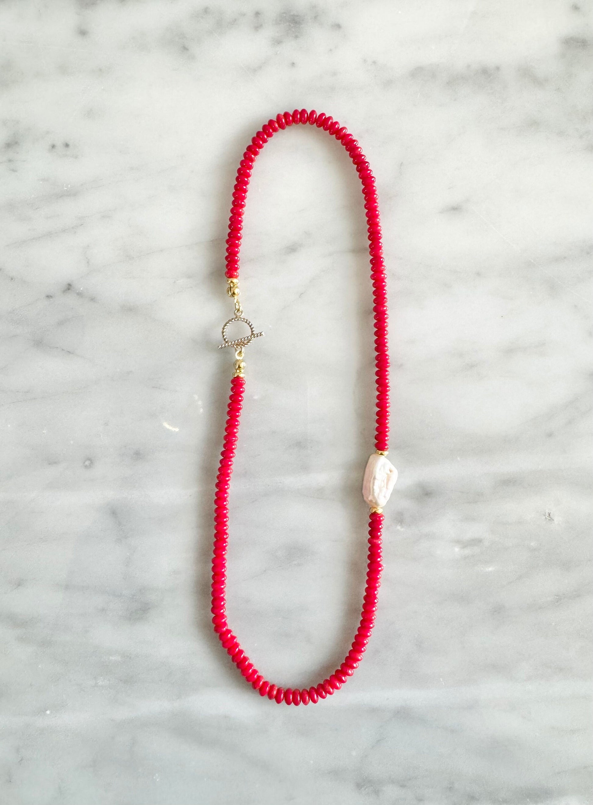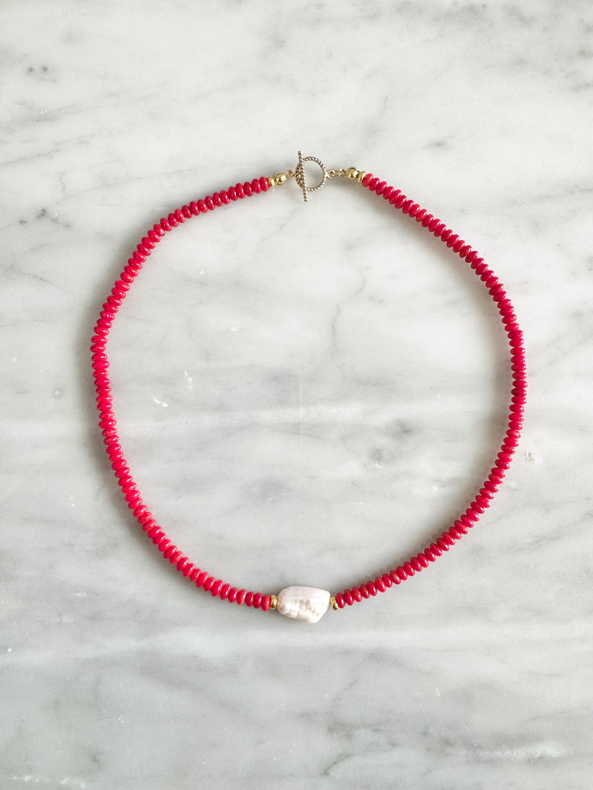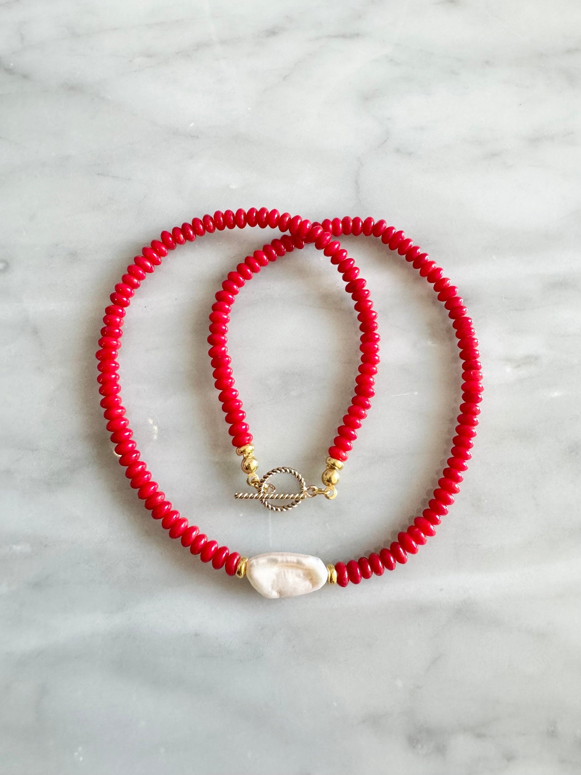 Rich Red Coral and the gentle shimmer of a Biwa pearl combine in this necklace, completed with gold-filled accents.