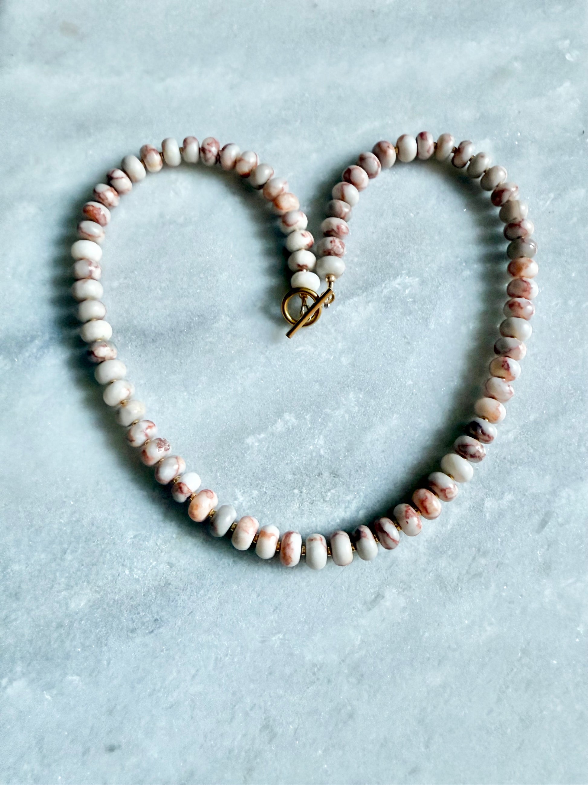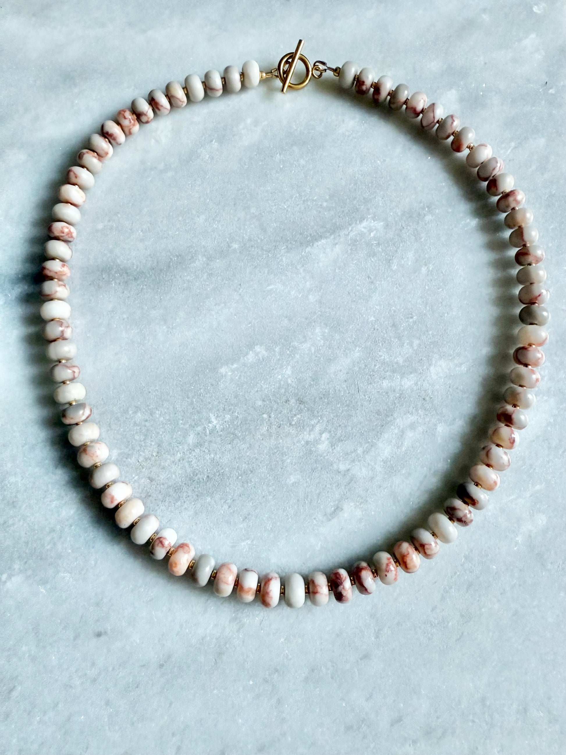 This necklace features Red Vein Jasper gemstone rondelles, accented with delicate Japanese Miyuki seed beads for a subtle contrast in texture and tone. Finished with a gold-plated stainless steel toggle clasp, it’s both elegant and easy to wear.