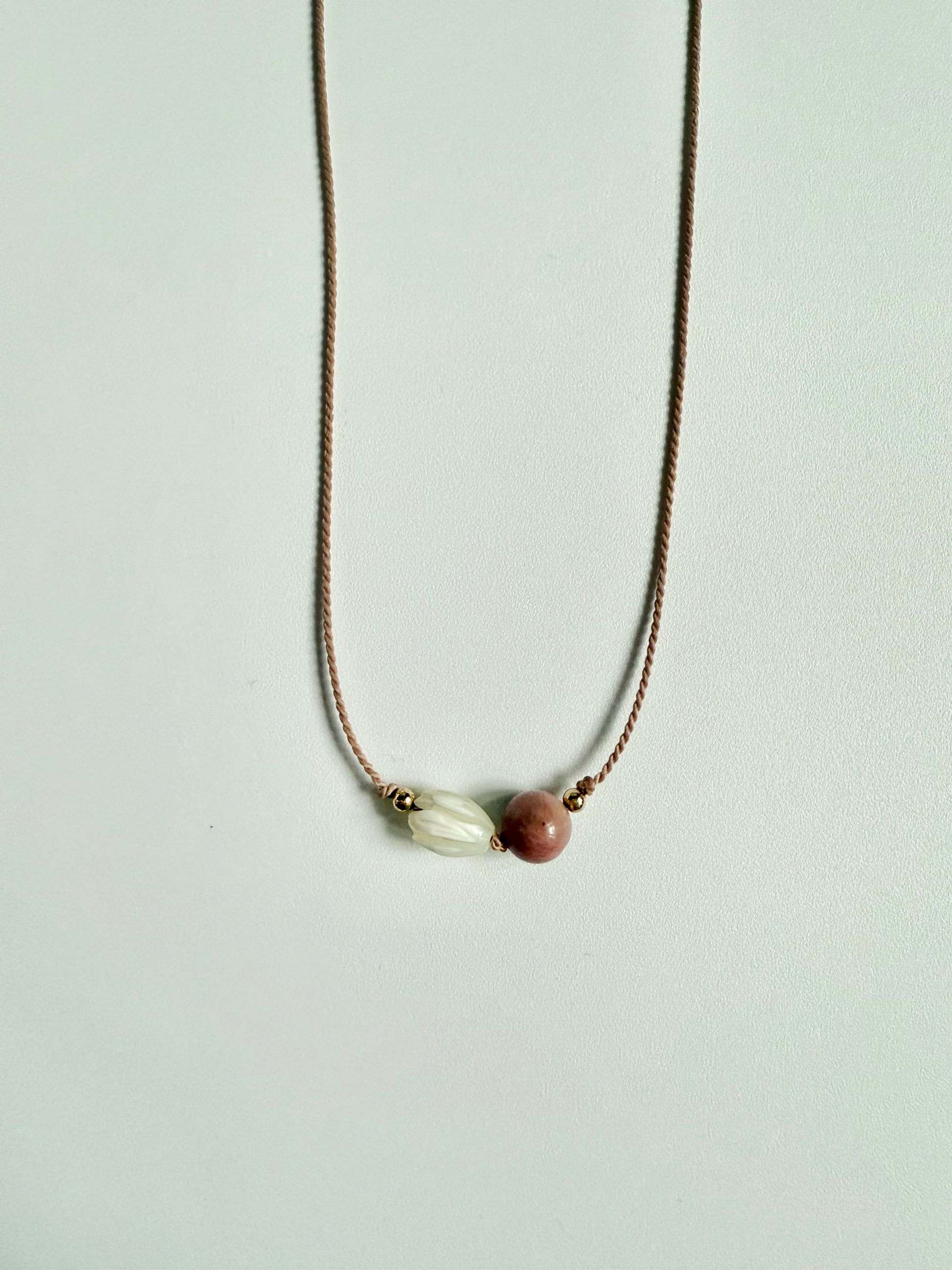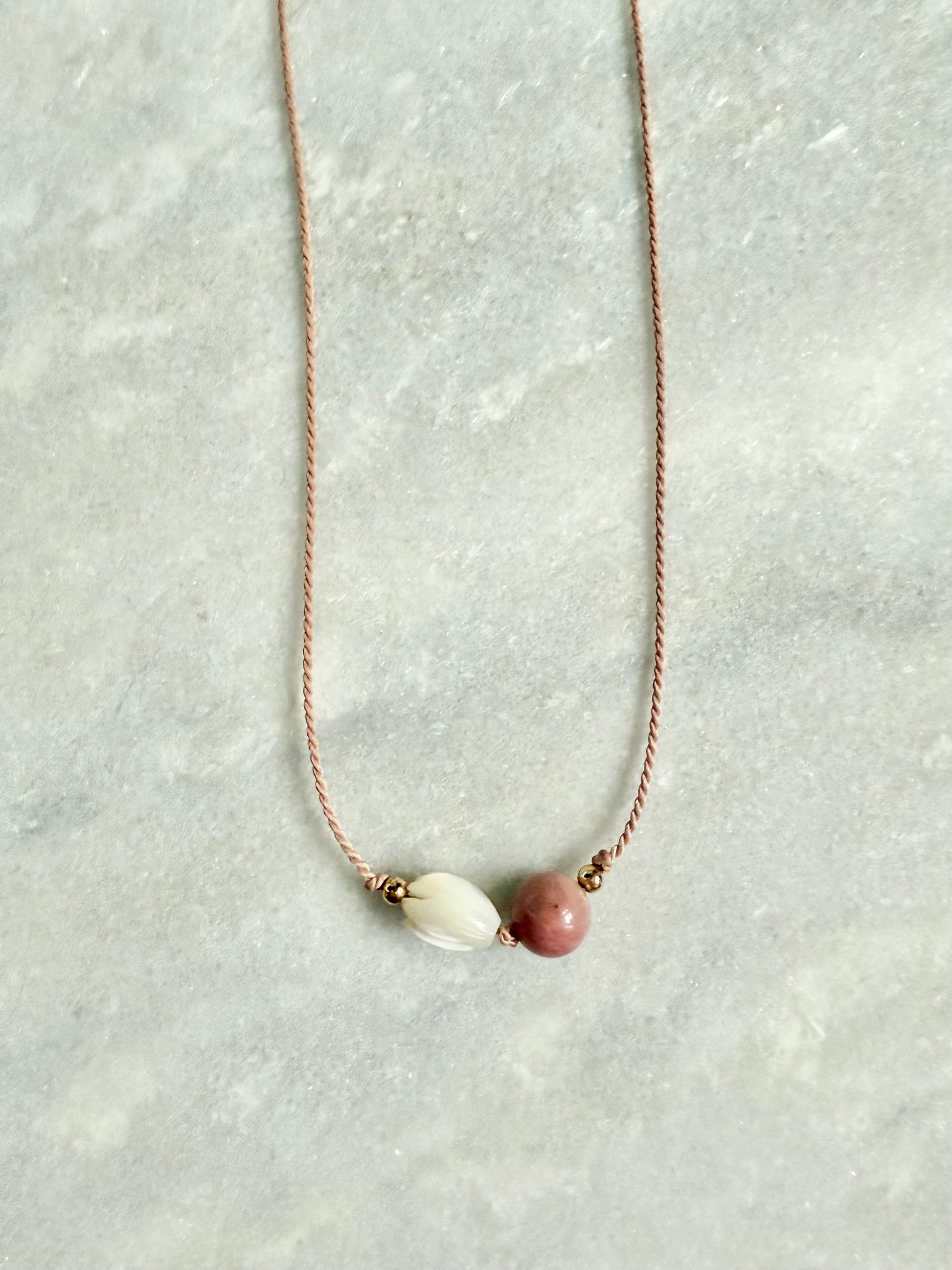 This pendant necklace features a pink rhodonite bead and a mother-of-pearl flower.