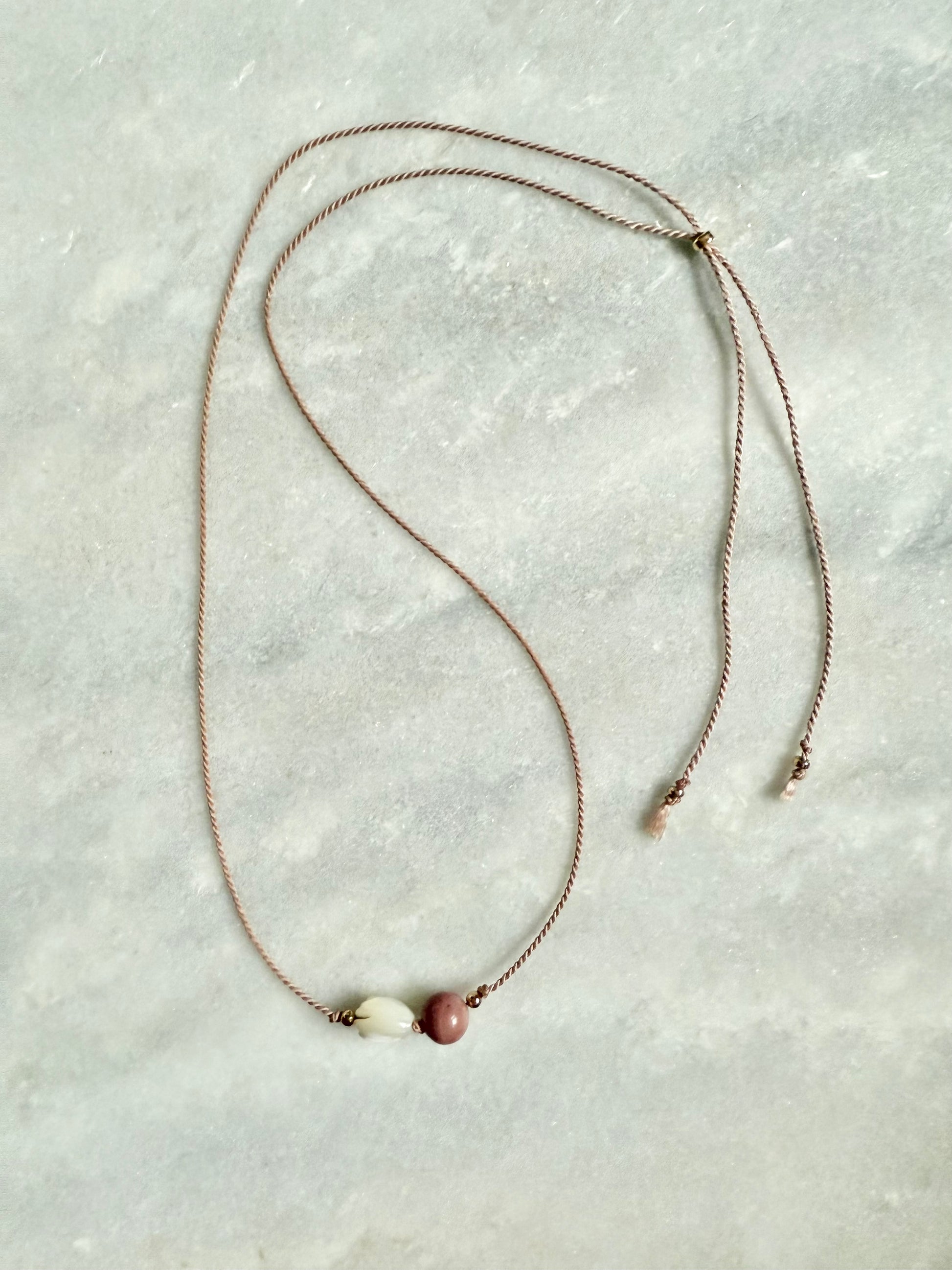 Each necklace is meticulously accented with gold filled beads and threaded on a soft, adjustable silk cord, allowing for versatile styling and a comfortable fit.