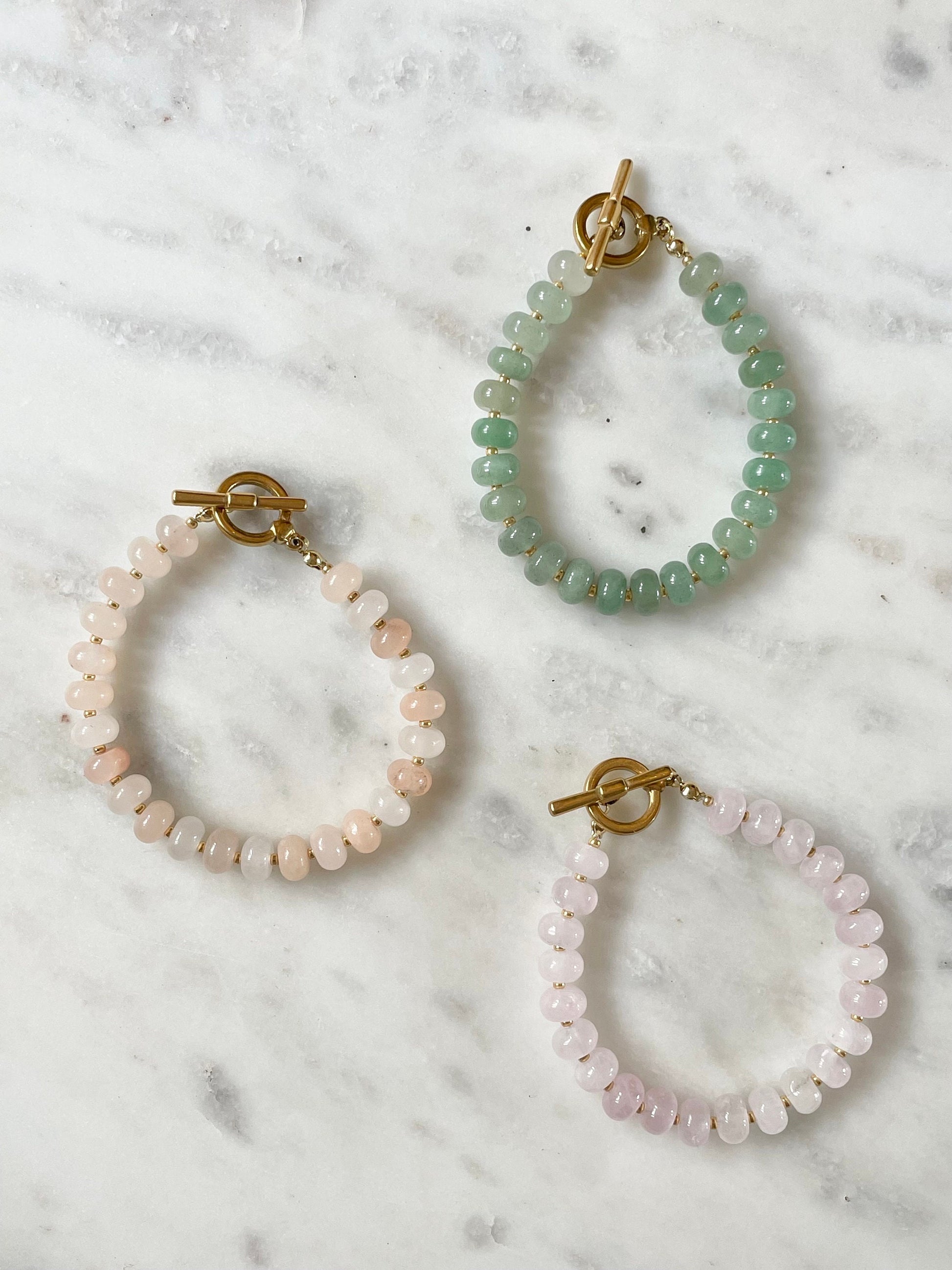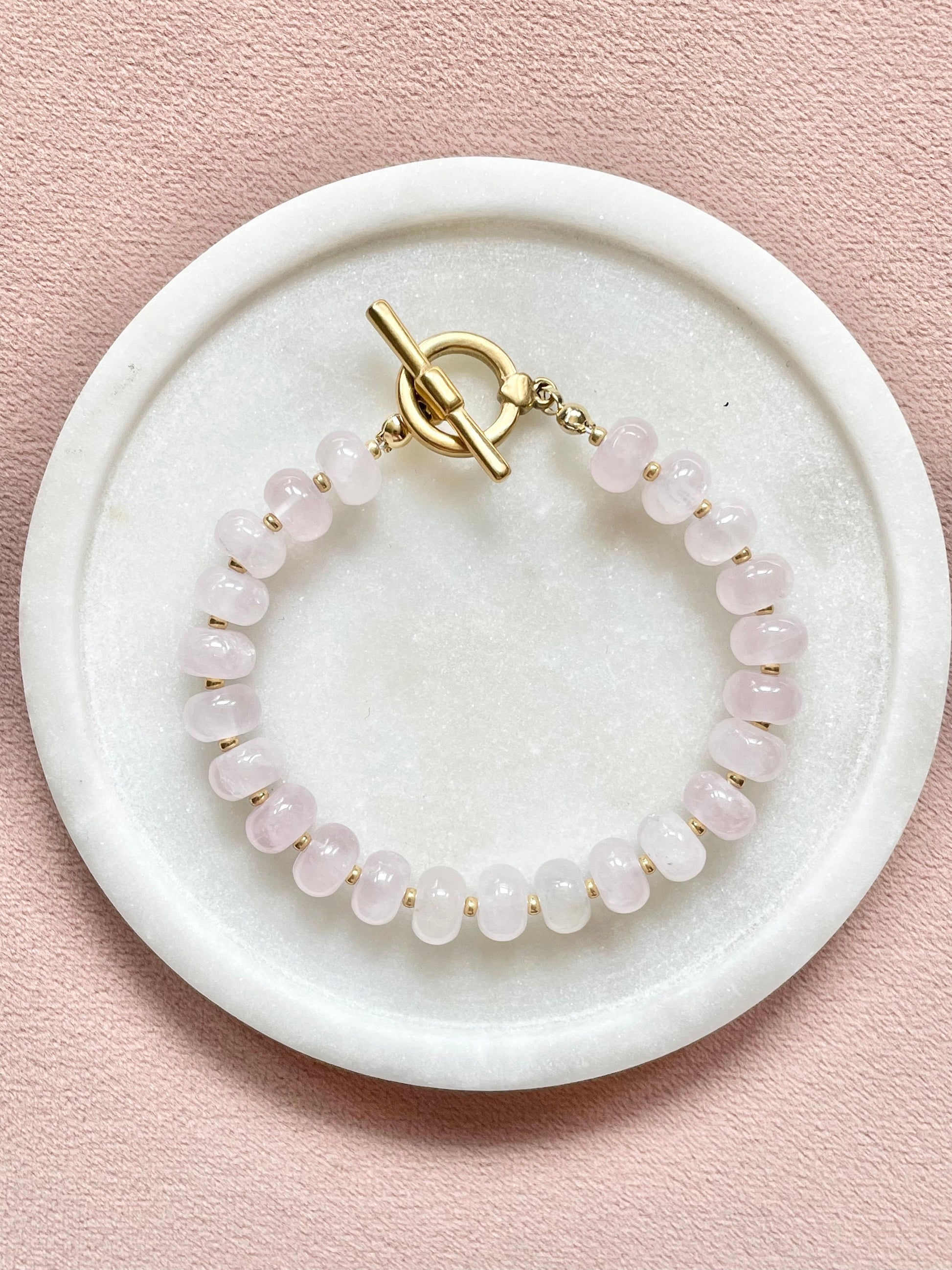 Rose Quartz rondelle beaded bracelet with gold miyuki spacer beads and a gold filled / gold plated stainless steel toggle clasp.