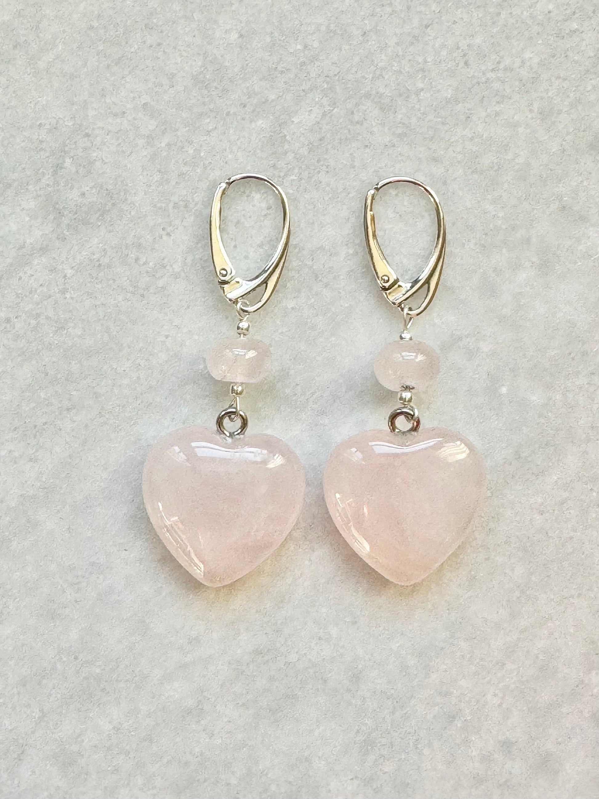 Rose quartz heart drop earrings on sterling silver leverback hooks.