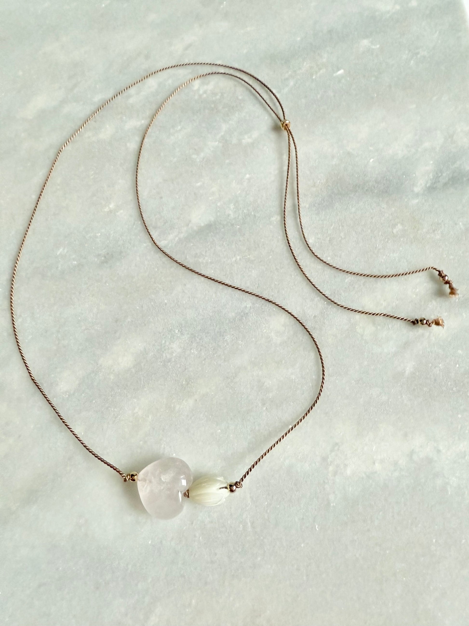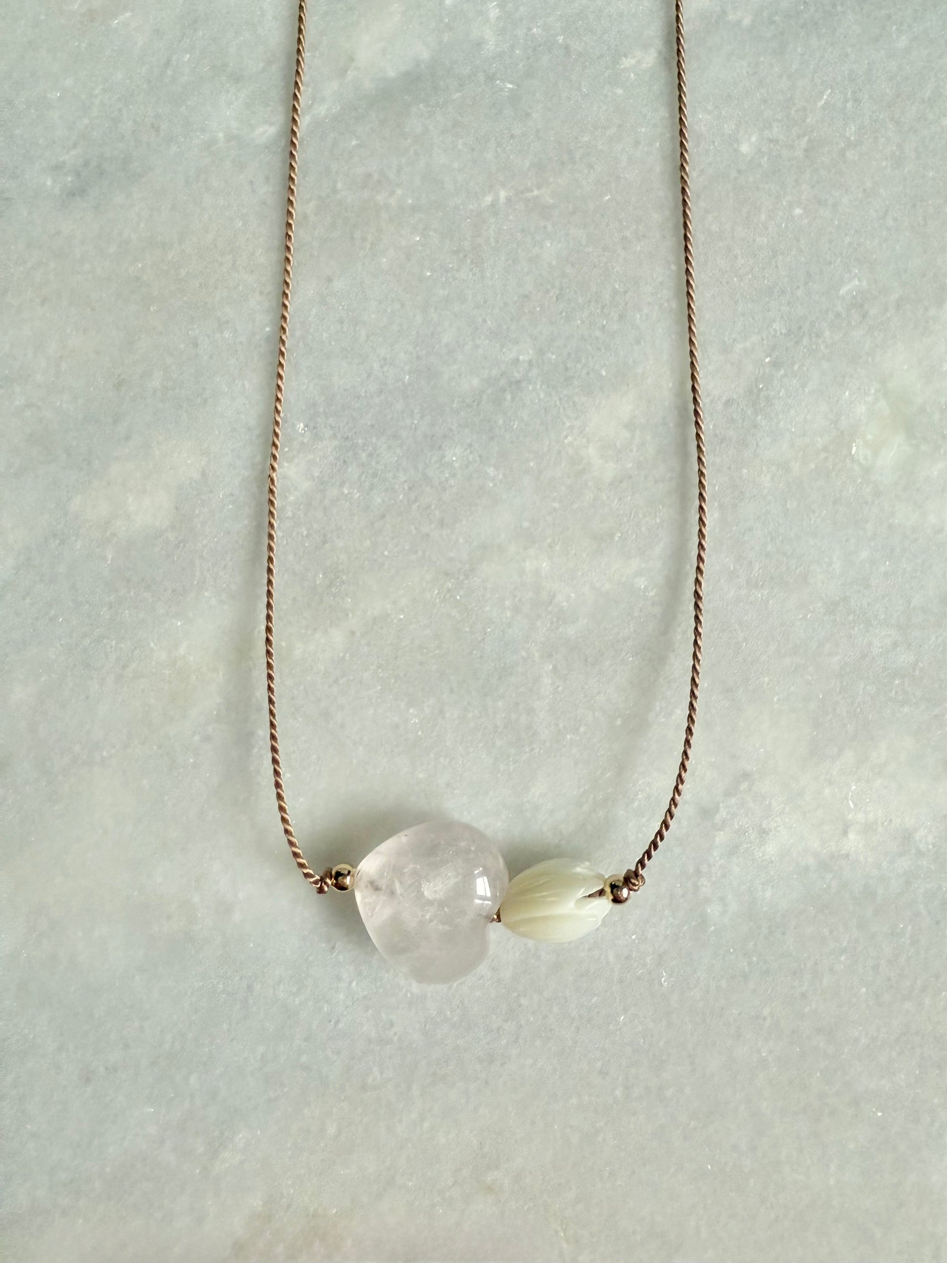 This pendant necklace features a rose quartz heart and a mother-of-pearl flower.