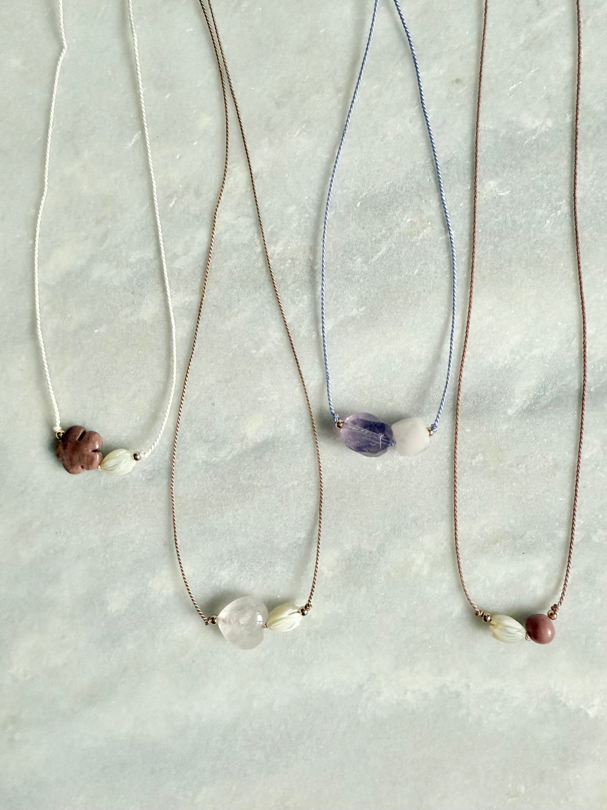 Each necklace is meticulously accented with gold filled beads and threaded on a soft, adjustable silk cord, allowing for versatile styling and a comfortable fit.
