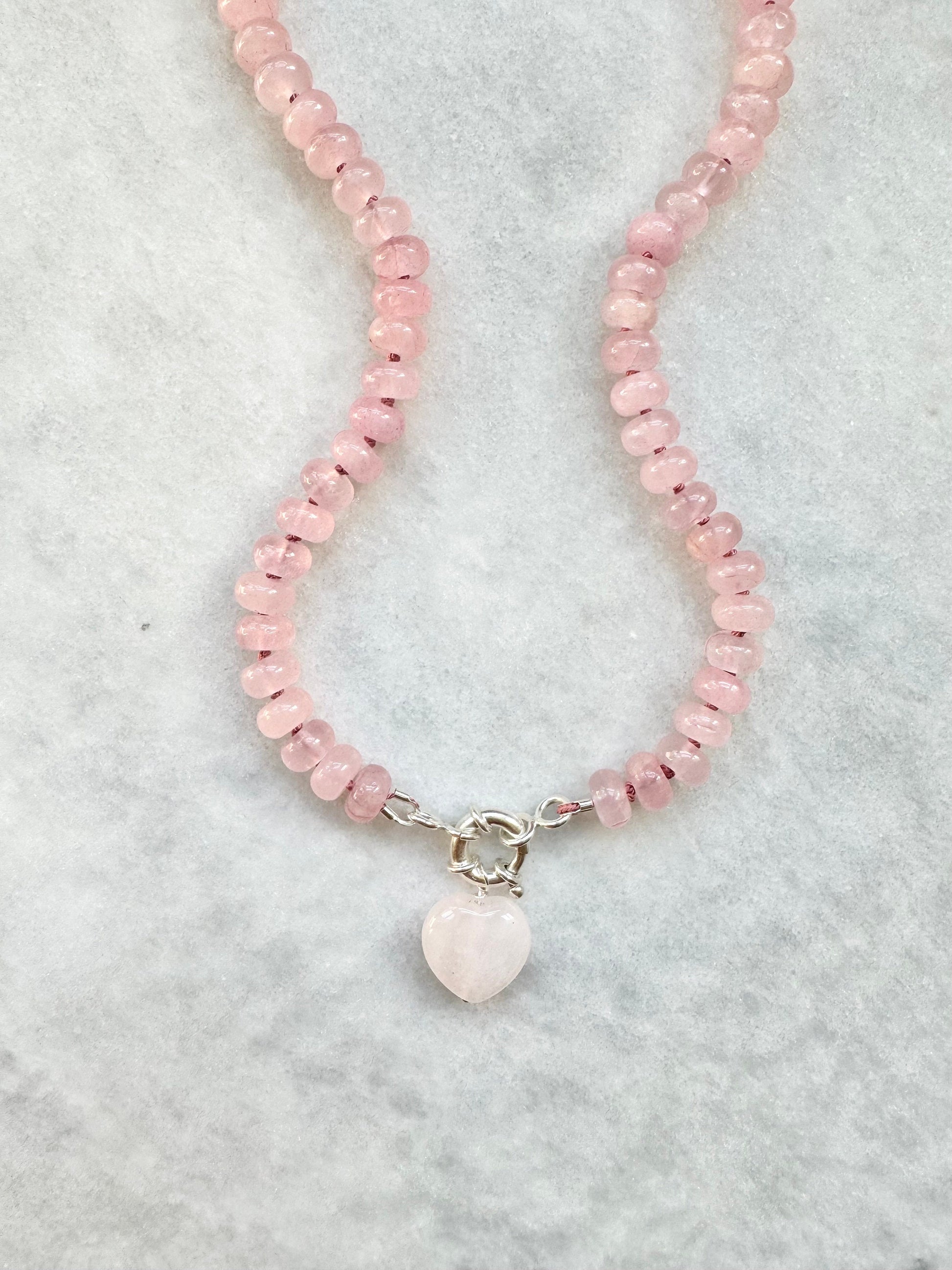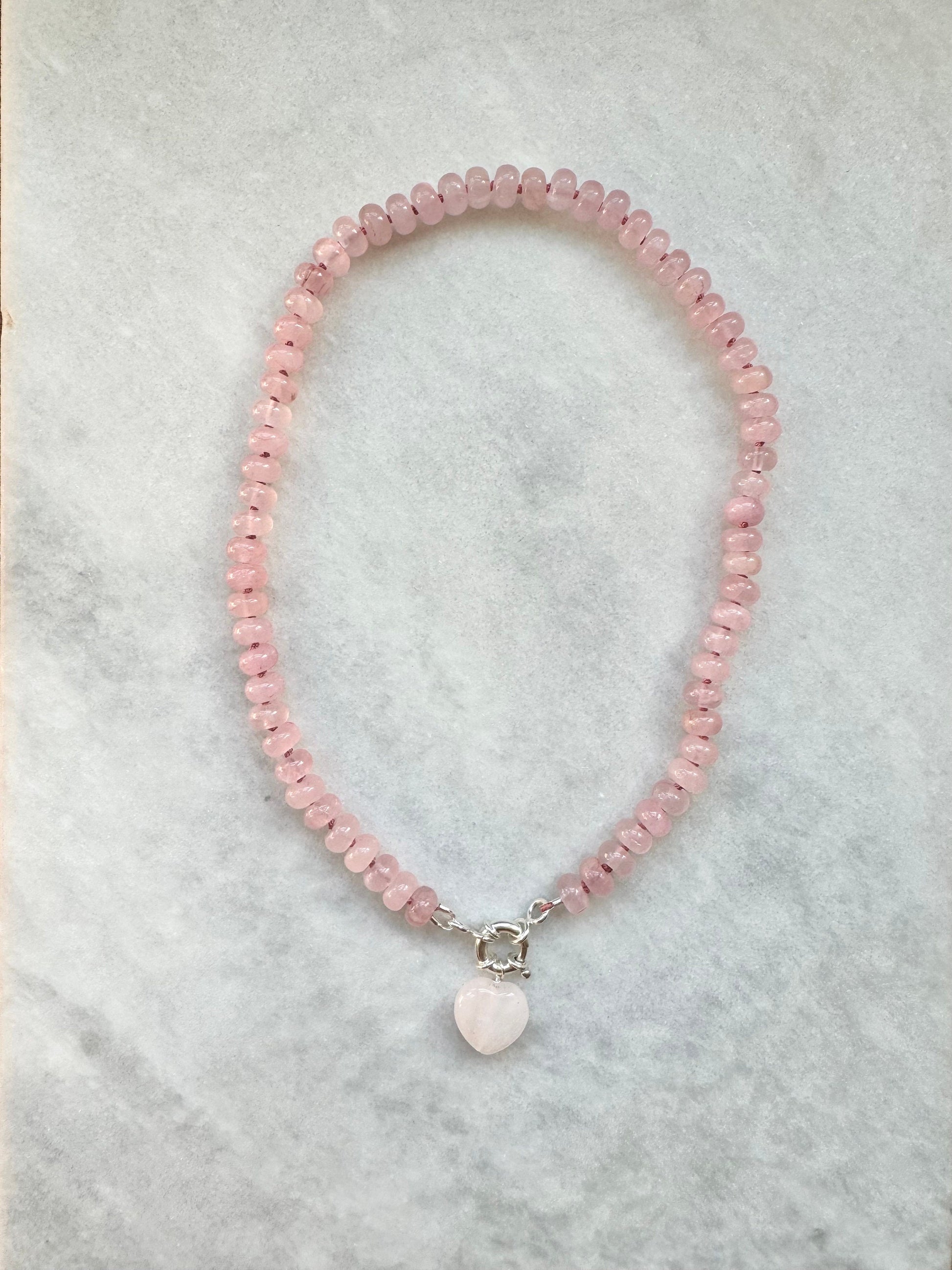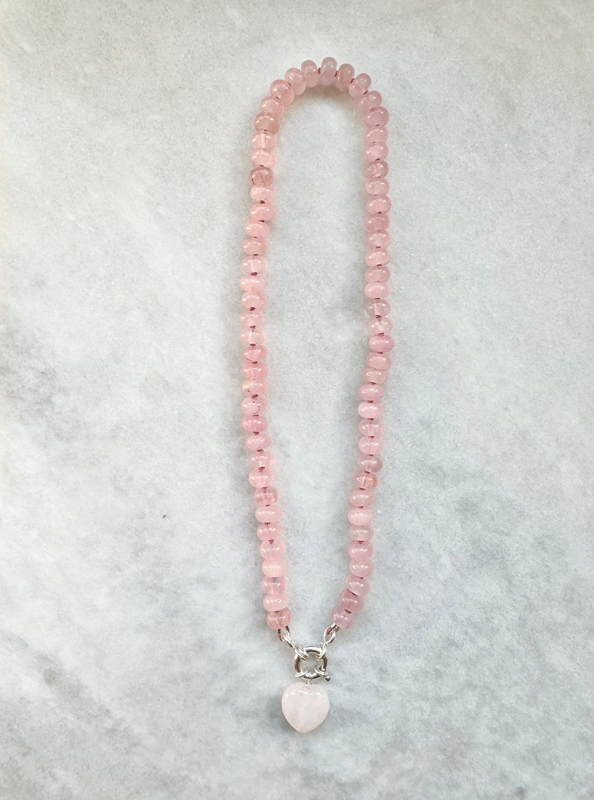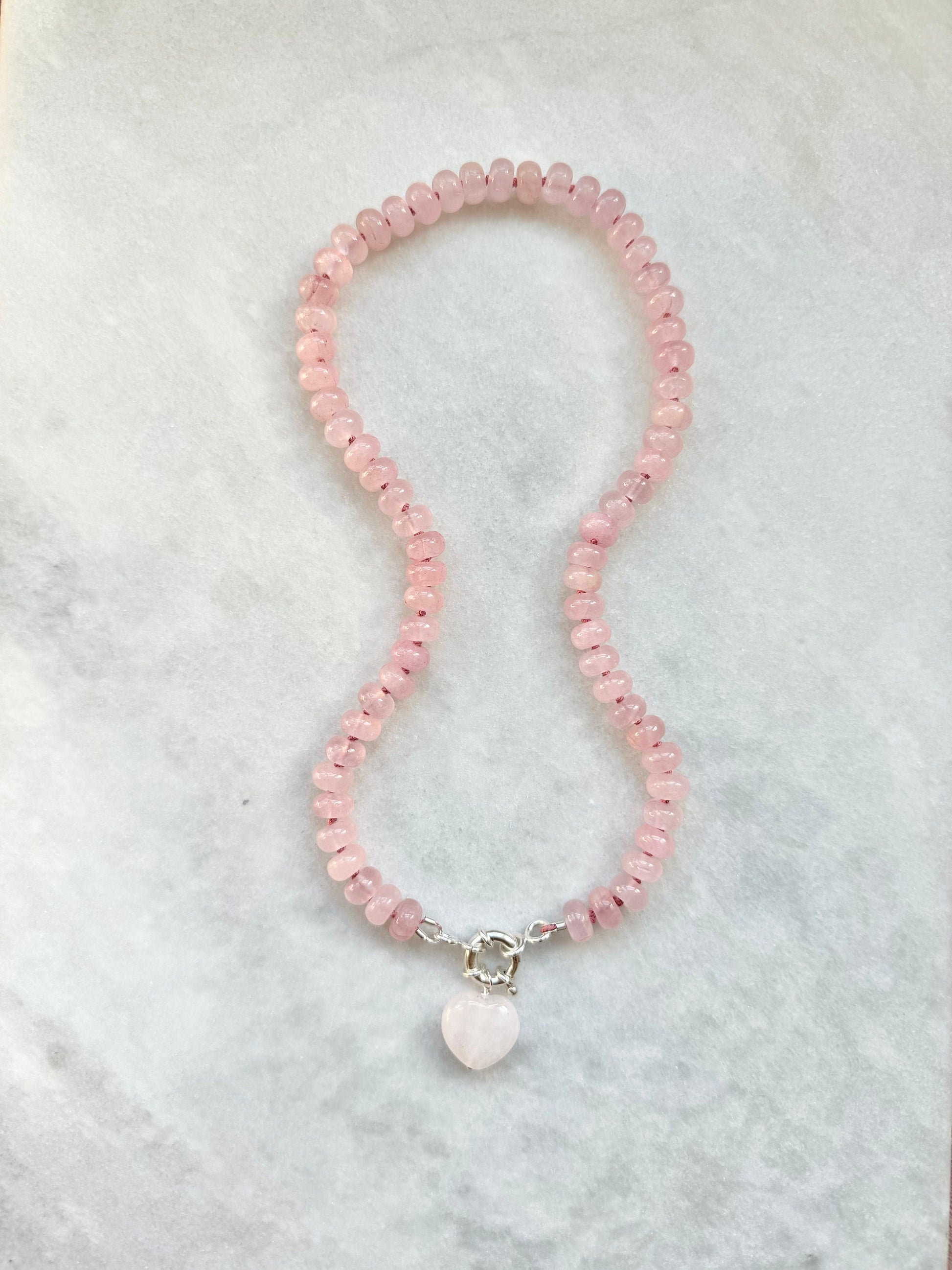 Rose quartz rondelles hand knotted on dark pink silk thread, finished with a sterling silver sailor clasp and rose quartz heart charm.