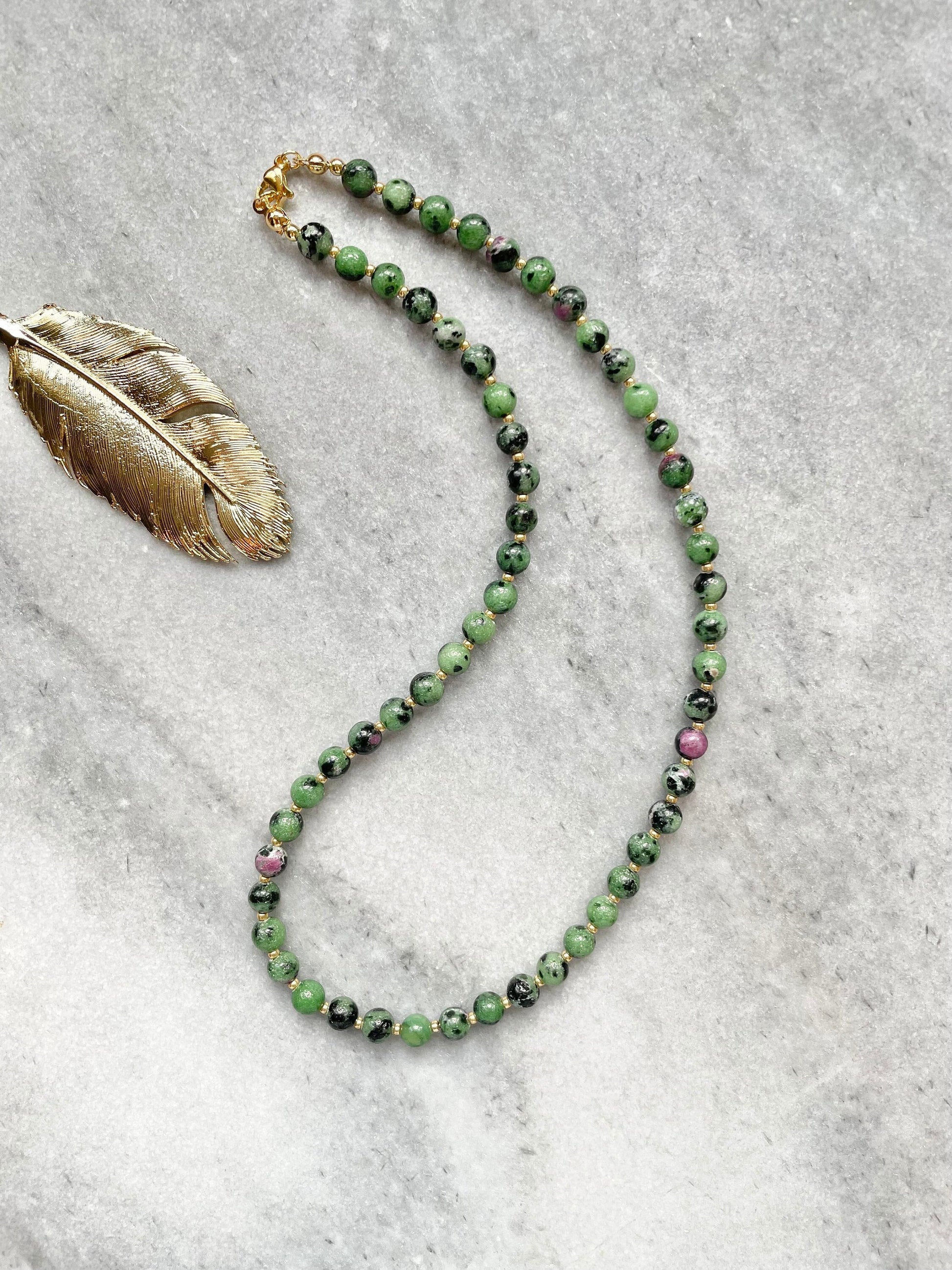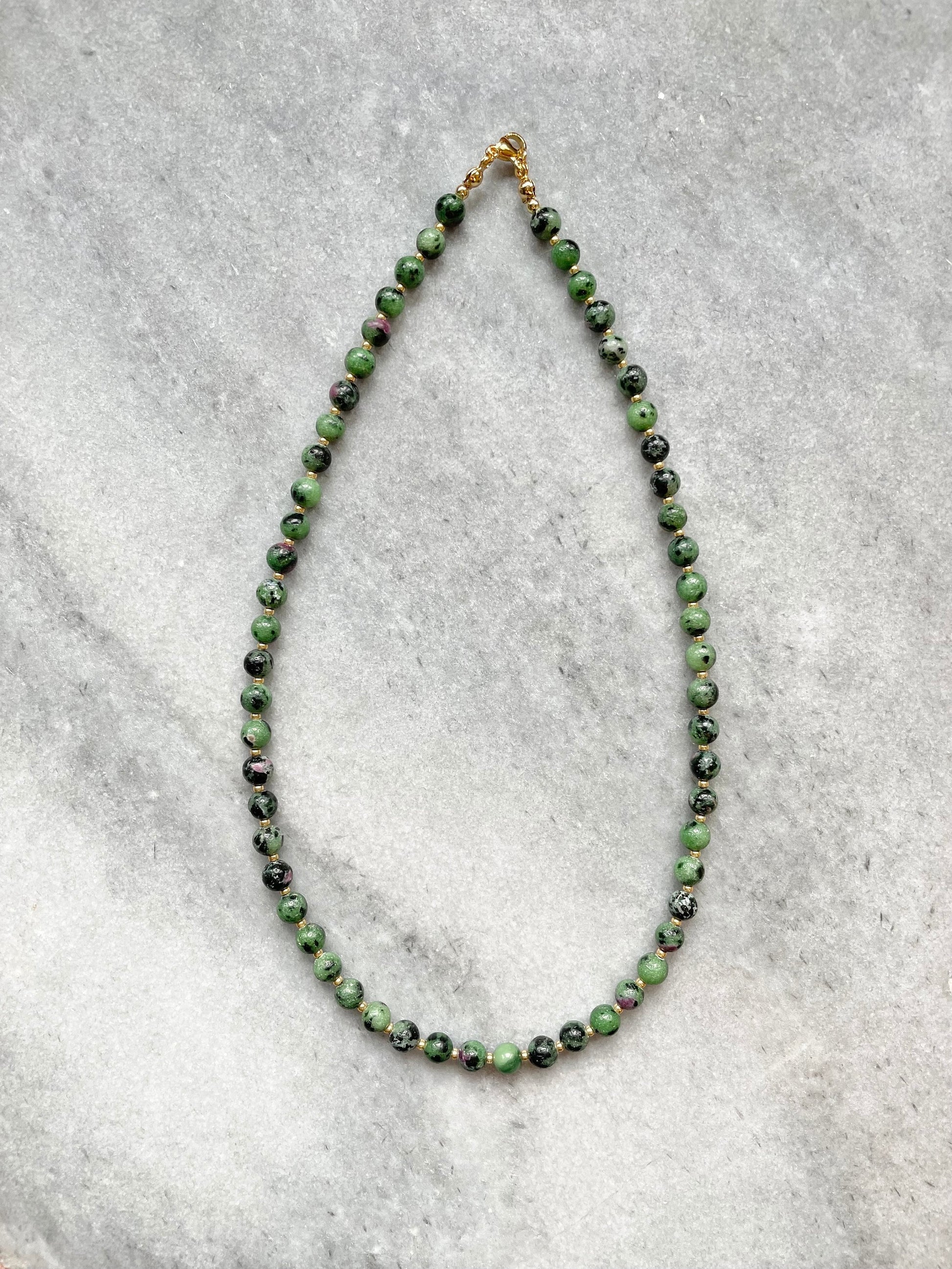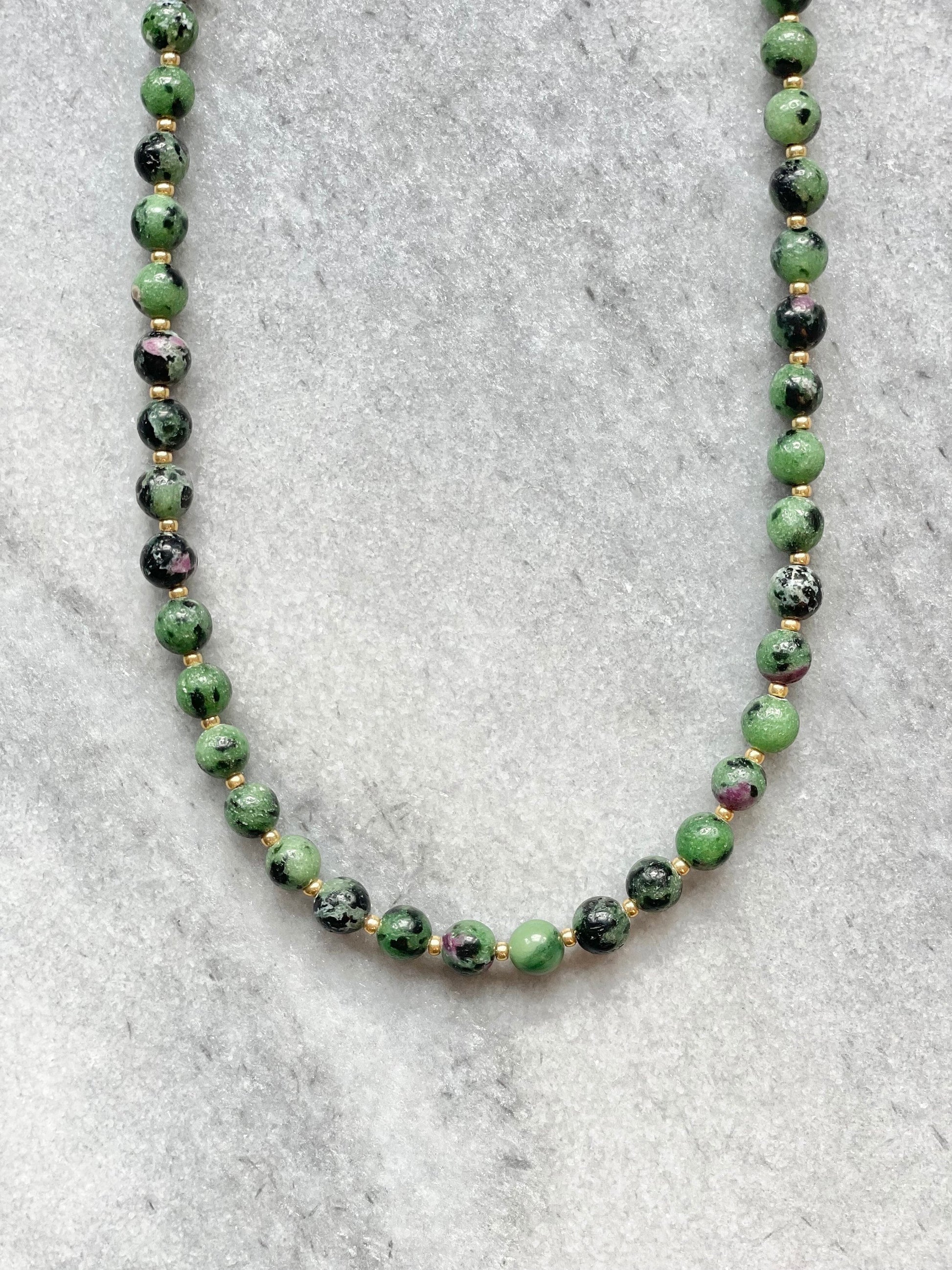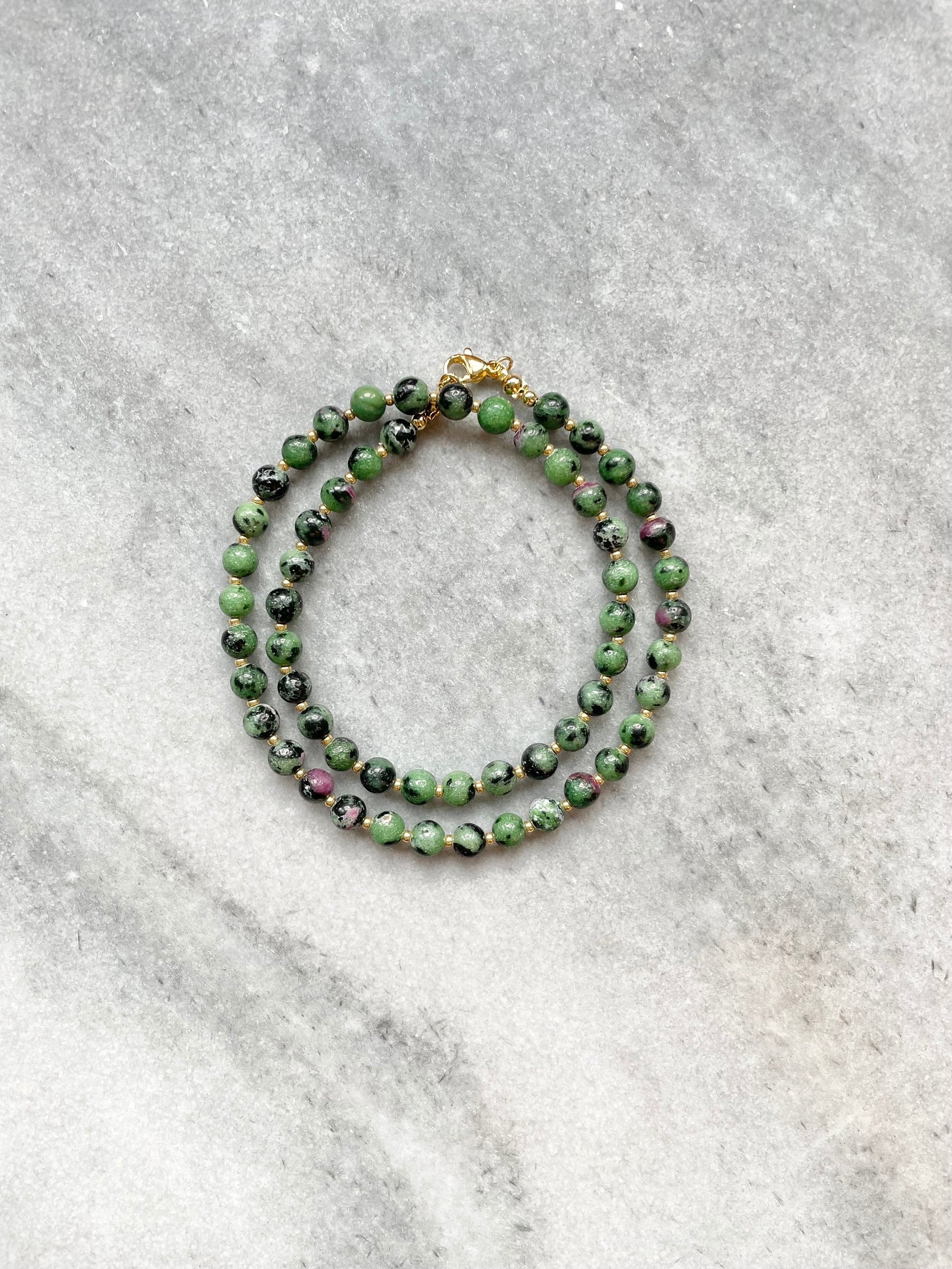 Ruby Zoisite beaded necklace with gold miyuki spacer beads and a gold vermeil lobster clasp