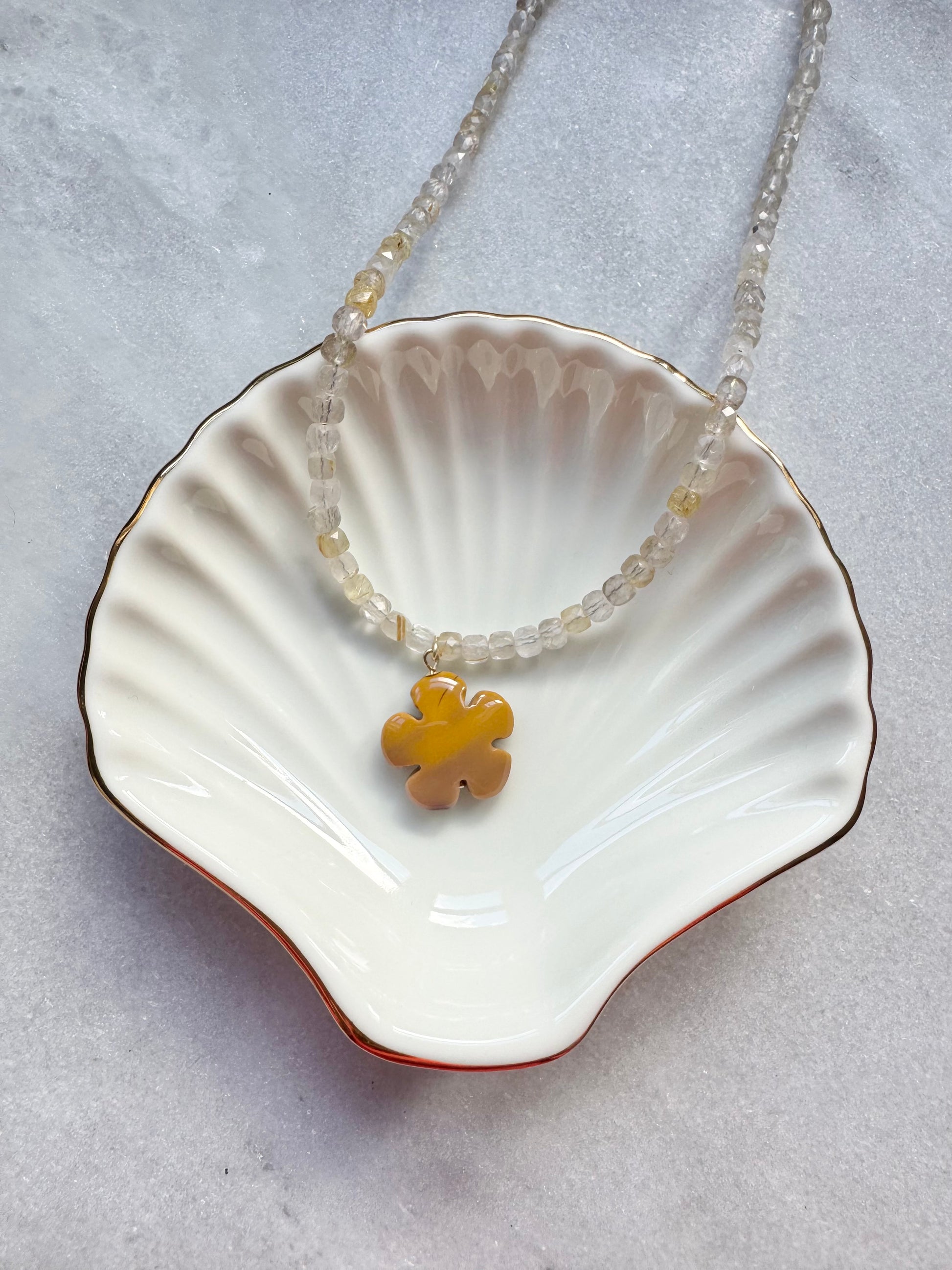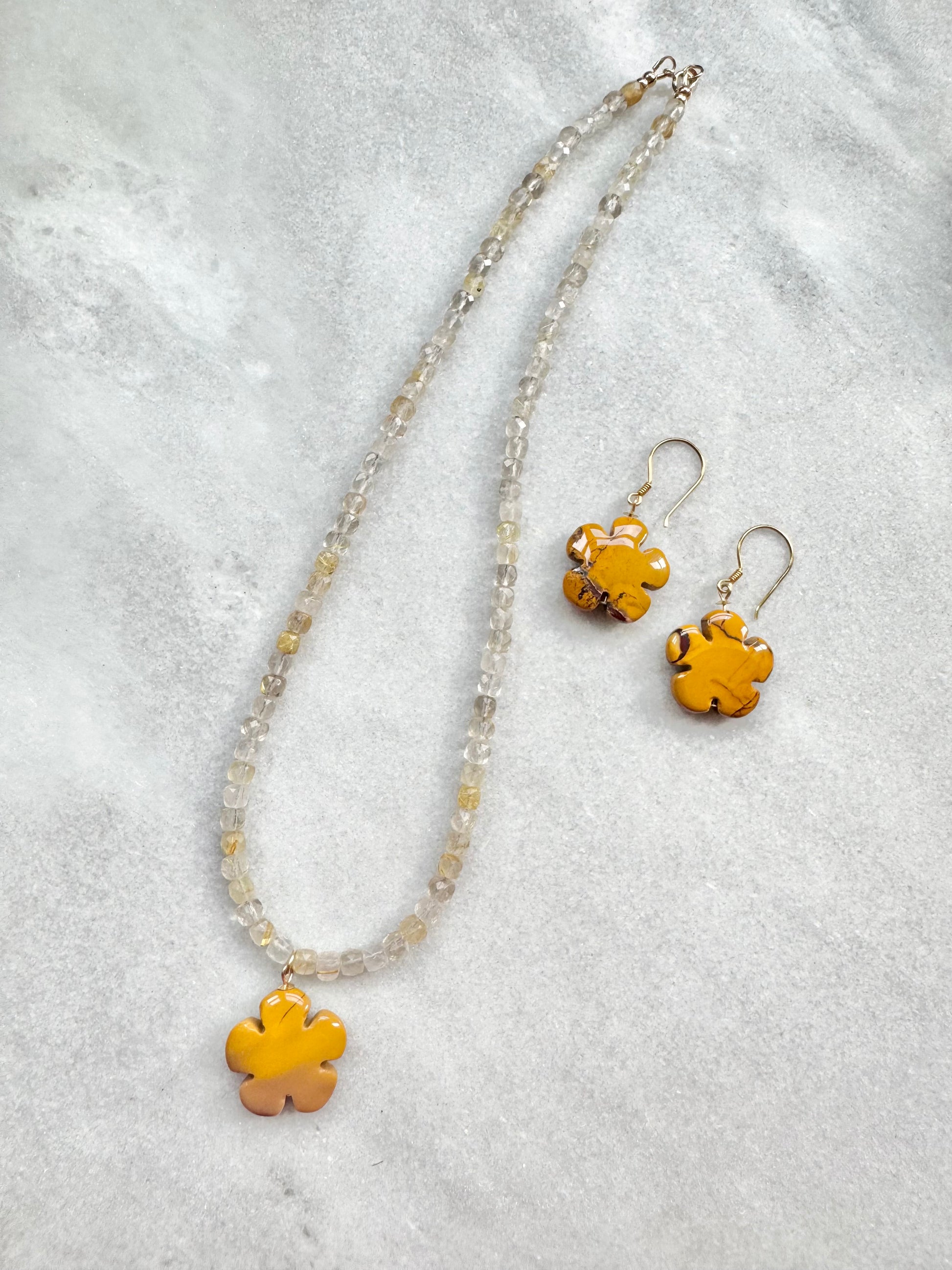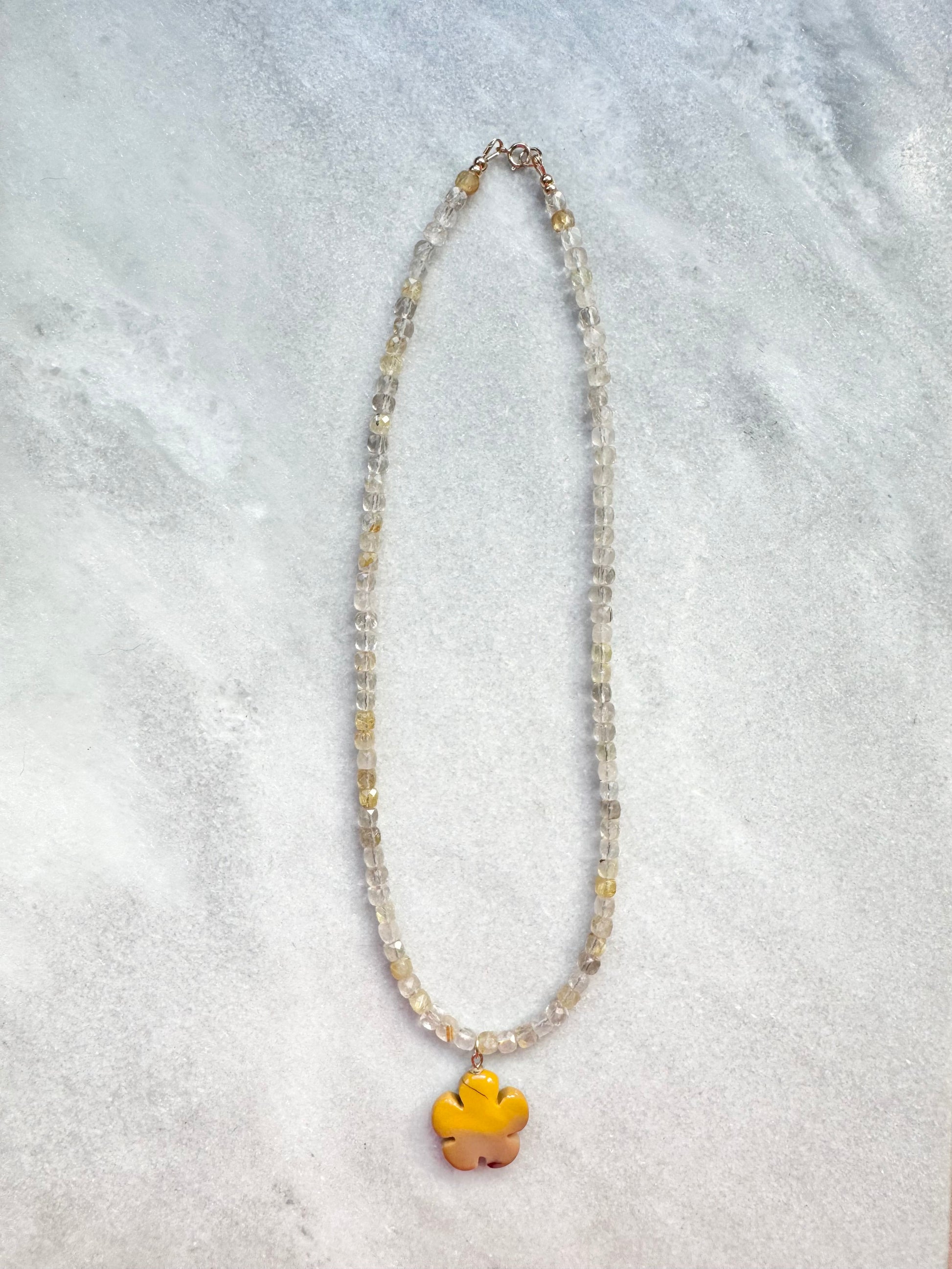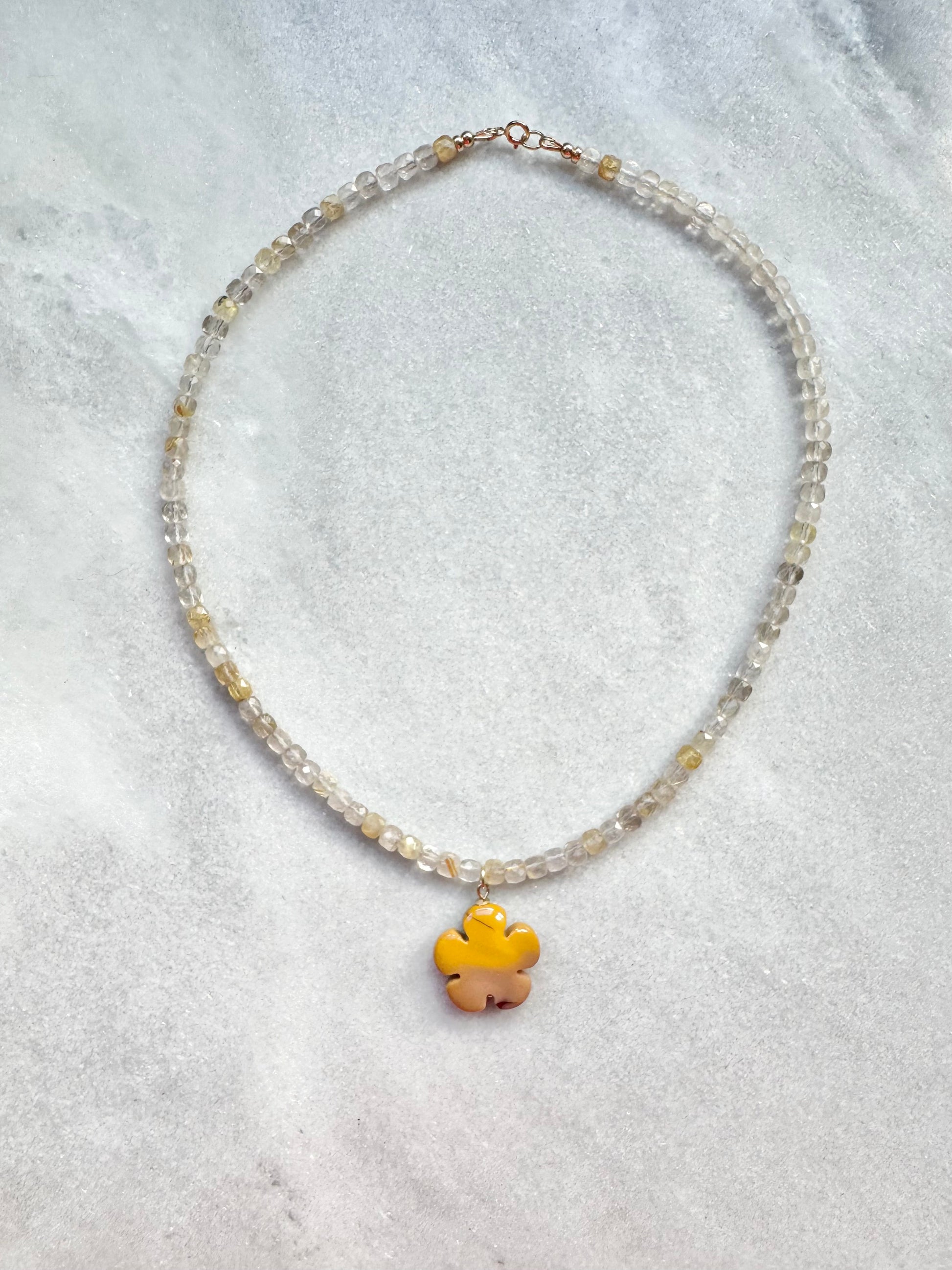 This necklace features Rutilated Quartz cubes and a Mookaite Jasper pendant, finished with a gold-filled clasp.