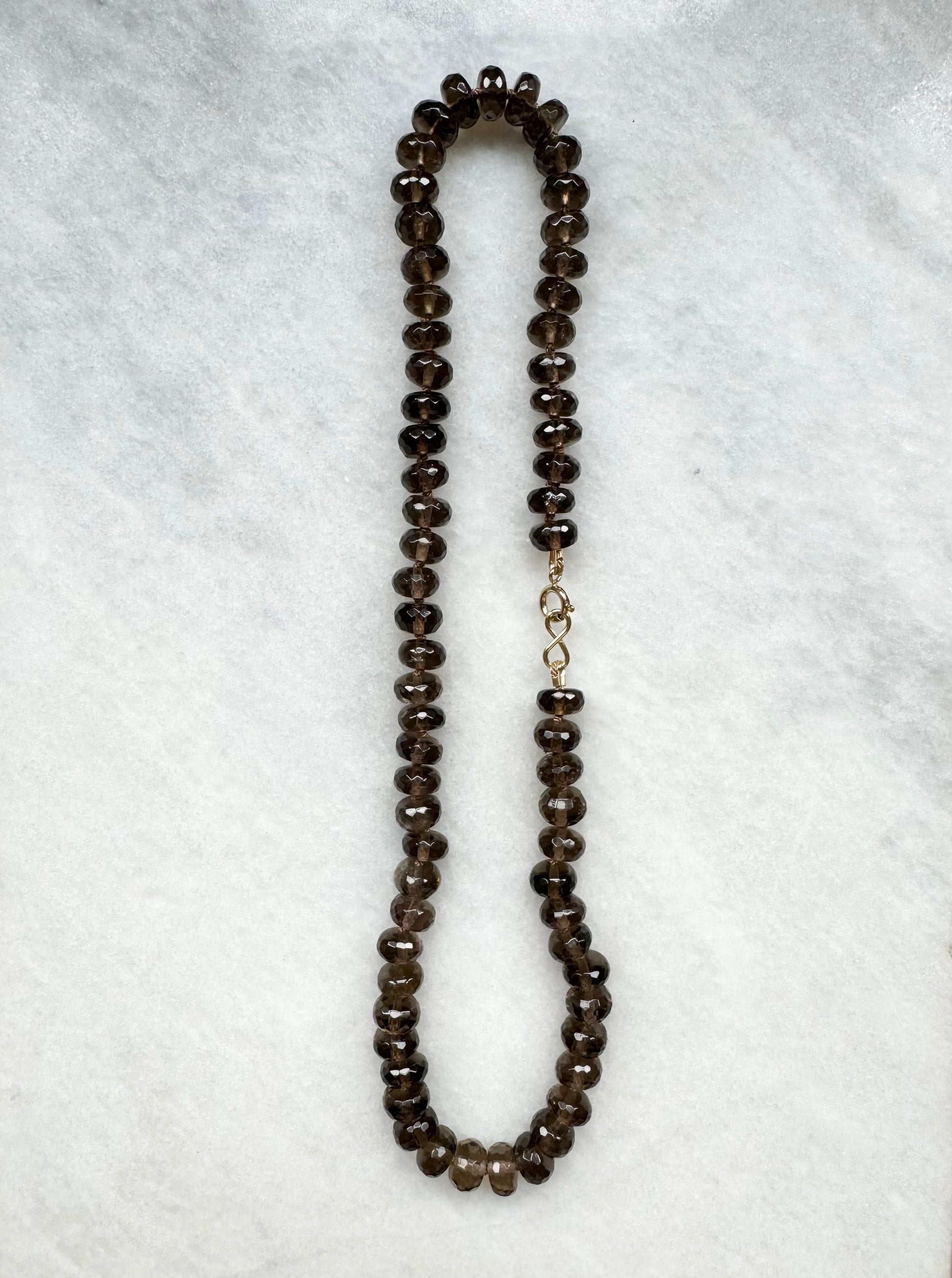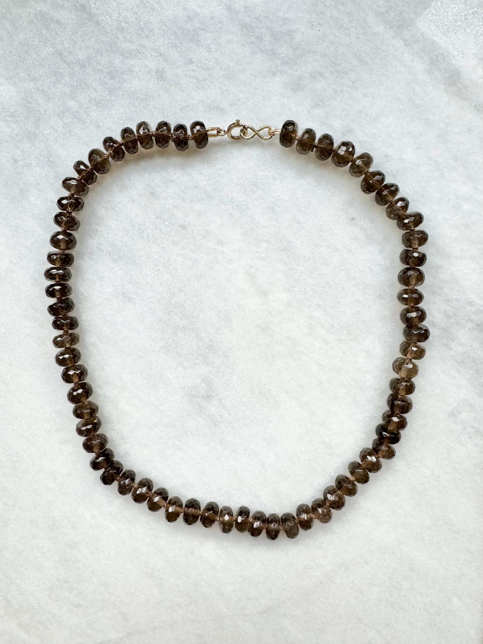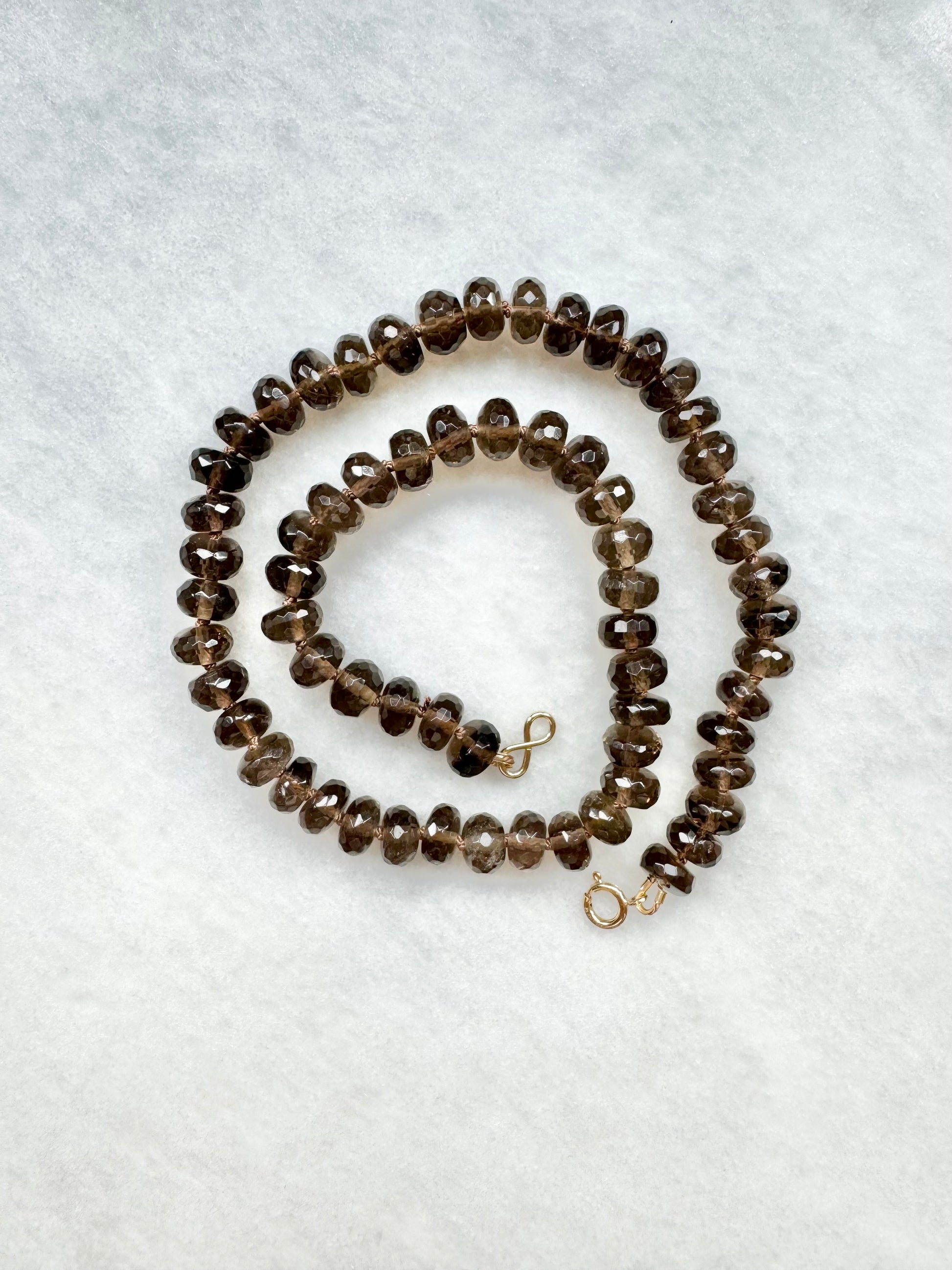 This exquisite piece features hand-knotted smoky quartz rondelles, each carefully selected for its unique, rich brown hue and translucent beauty.