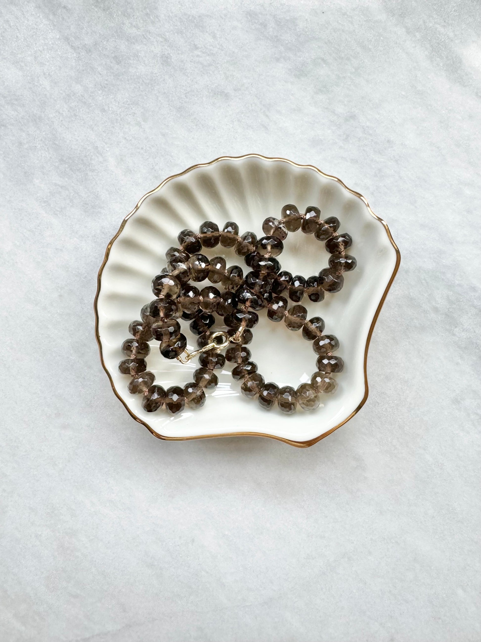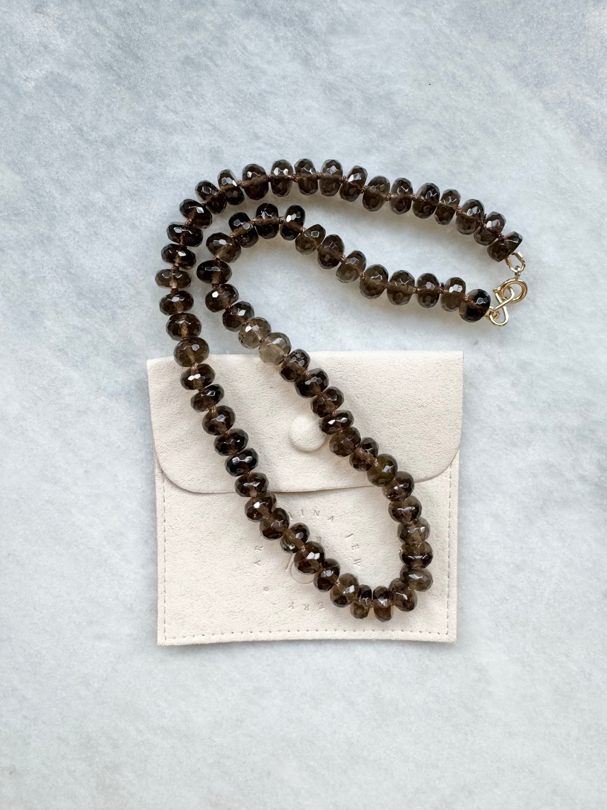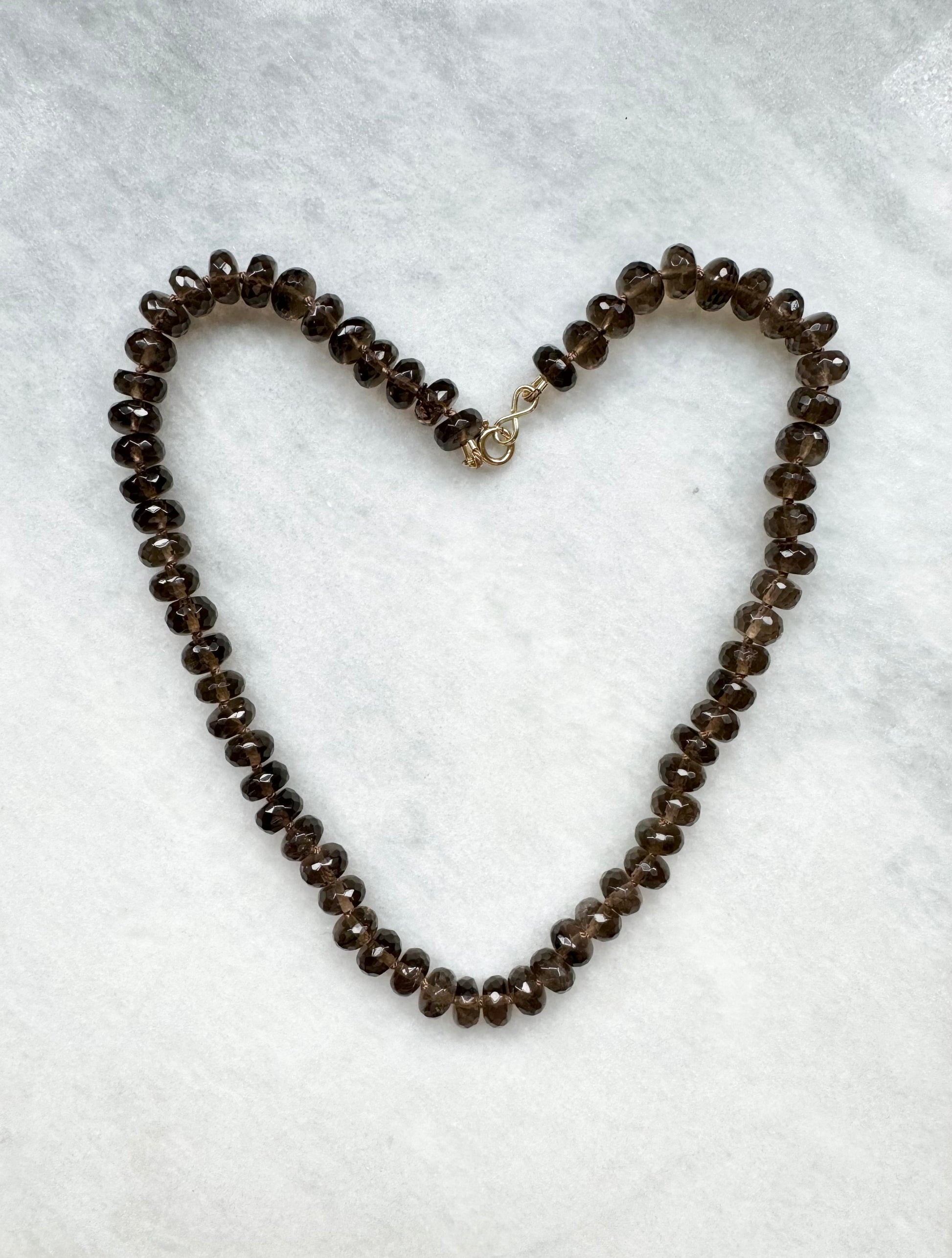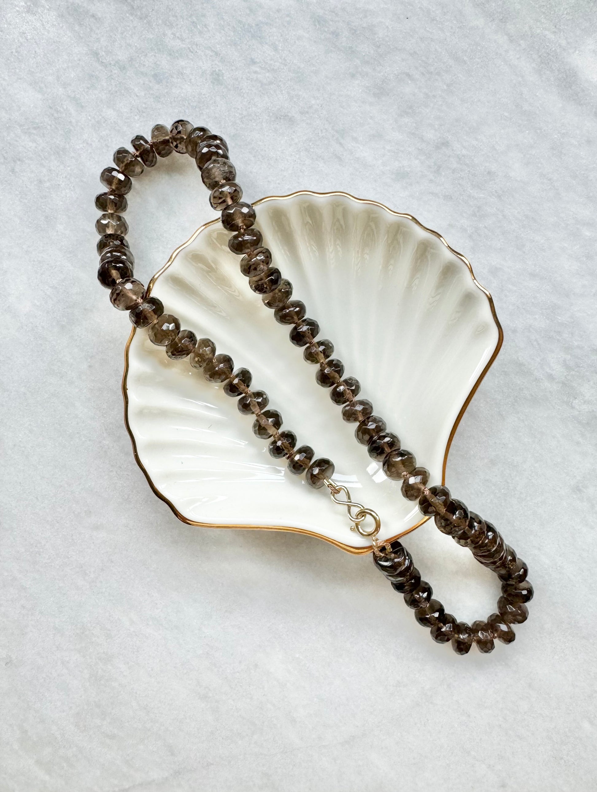 This exquisite piece features hand-knotted smoky quartz rondelles, each carefully selected for its unique, rich brown hue and translucent beauty.