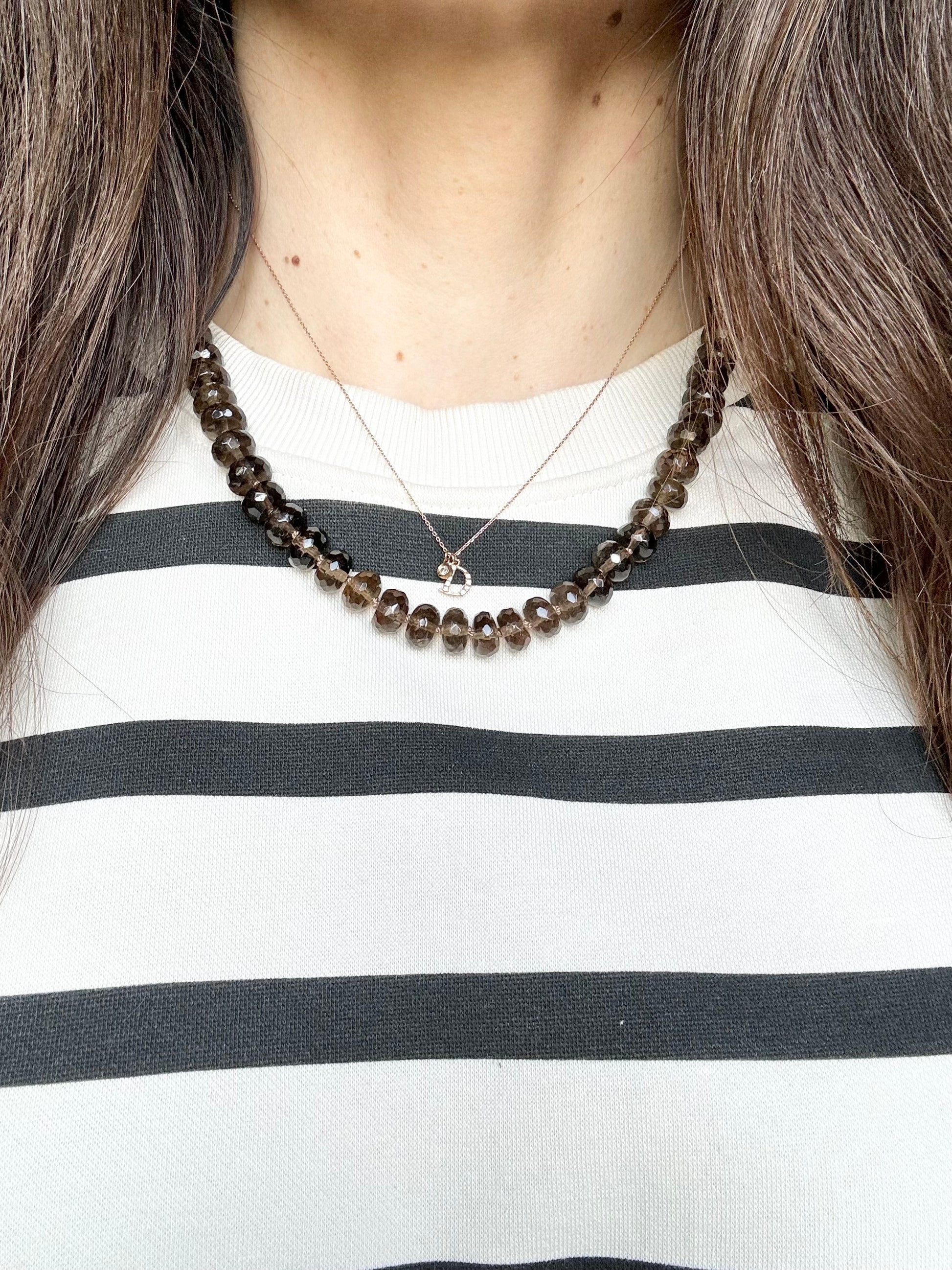 The necklace is finished with a 14K gold-filled clasp, providing a secure and elegant closure that complements the natural warmth of the smoky quartz.