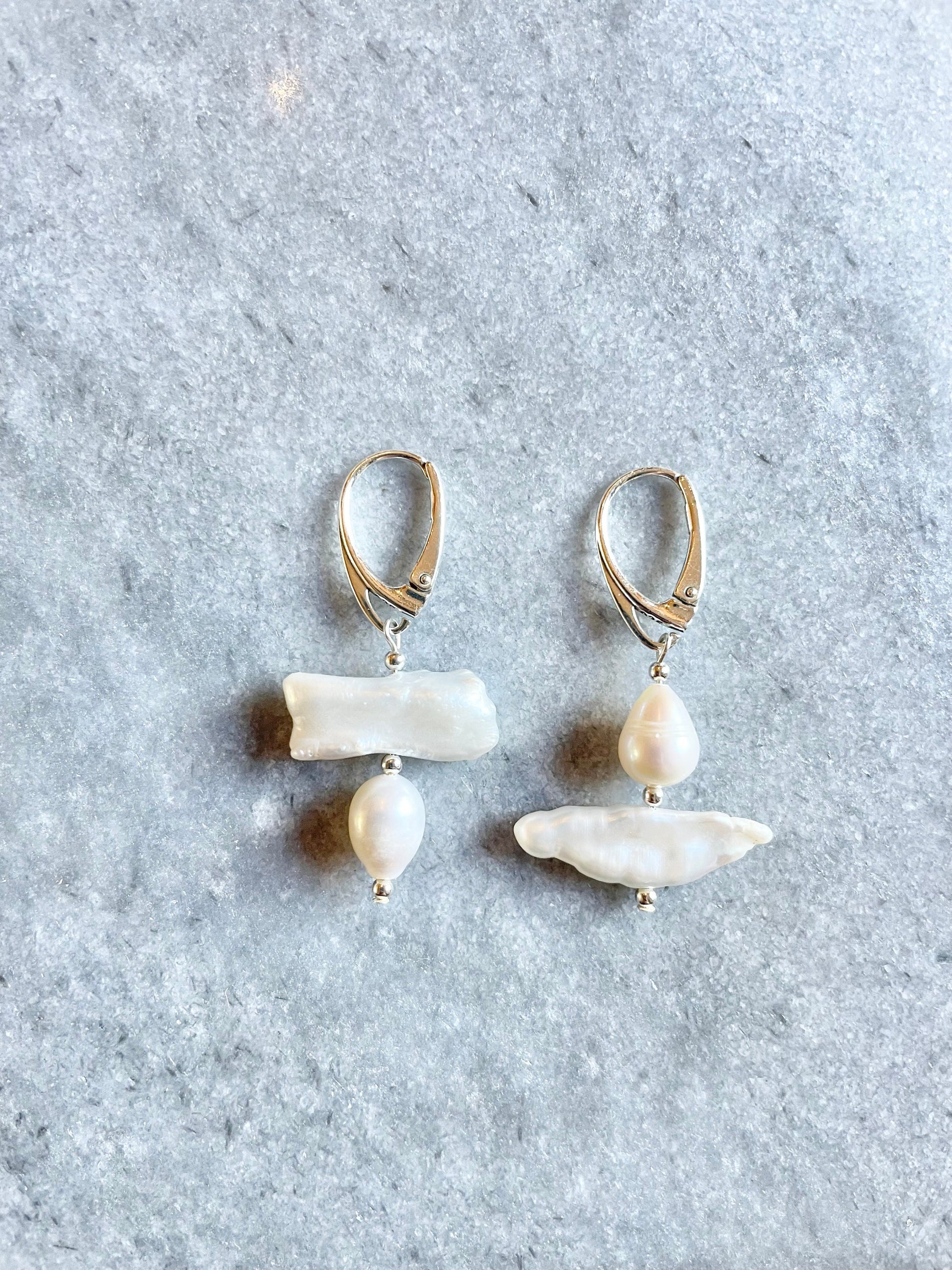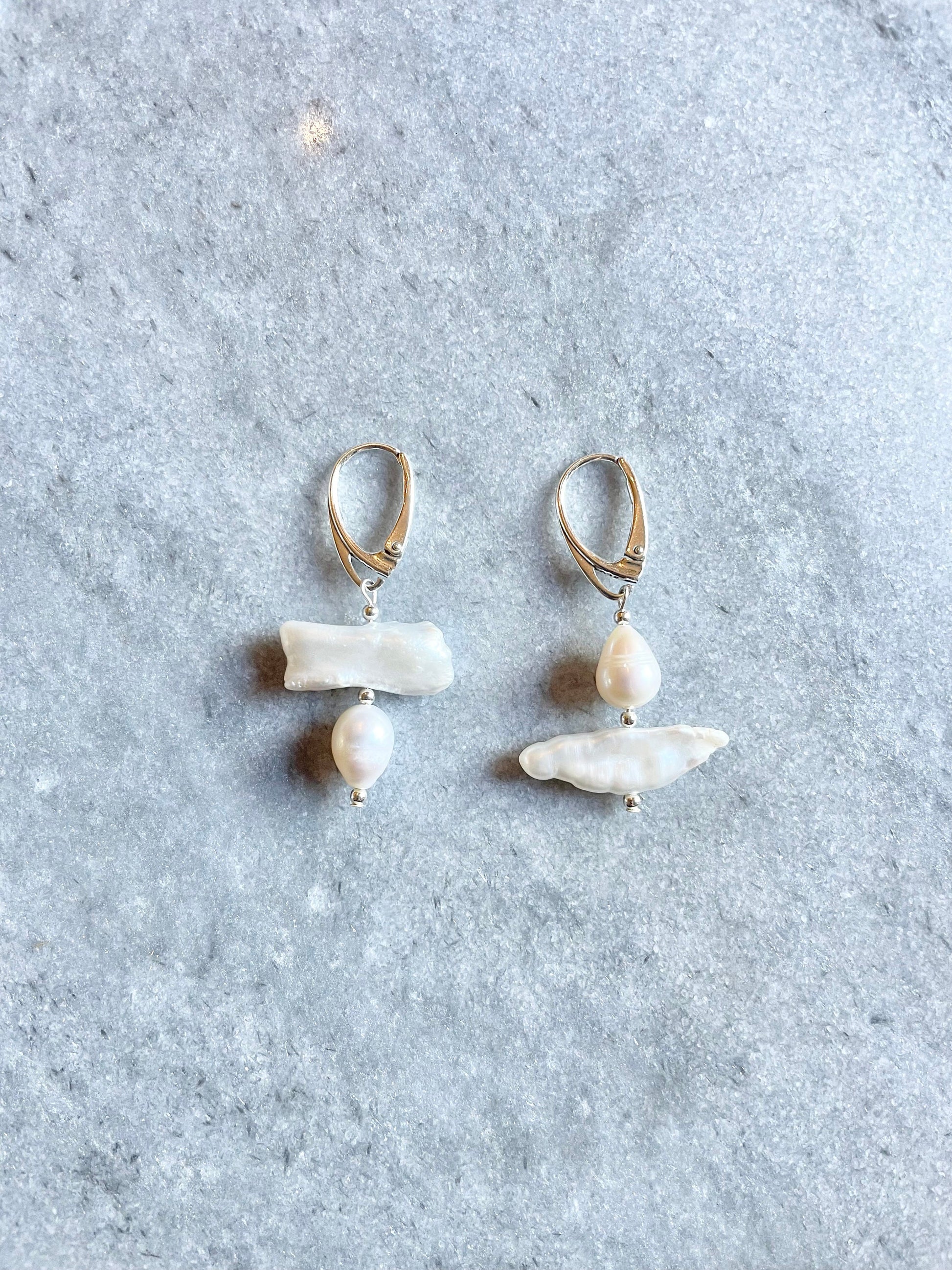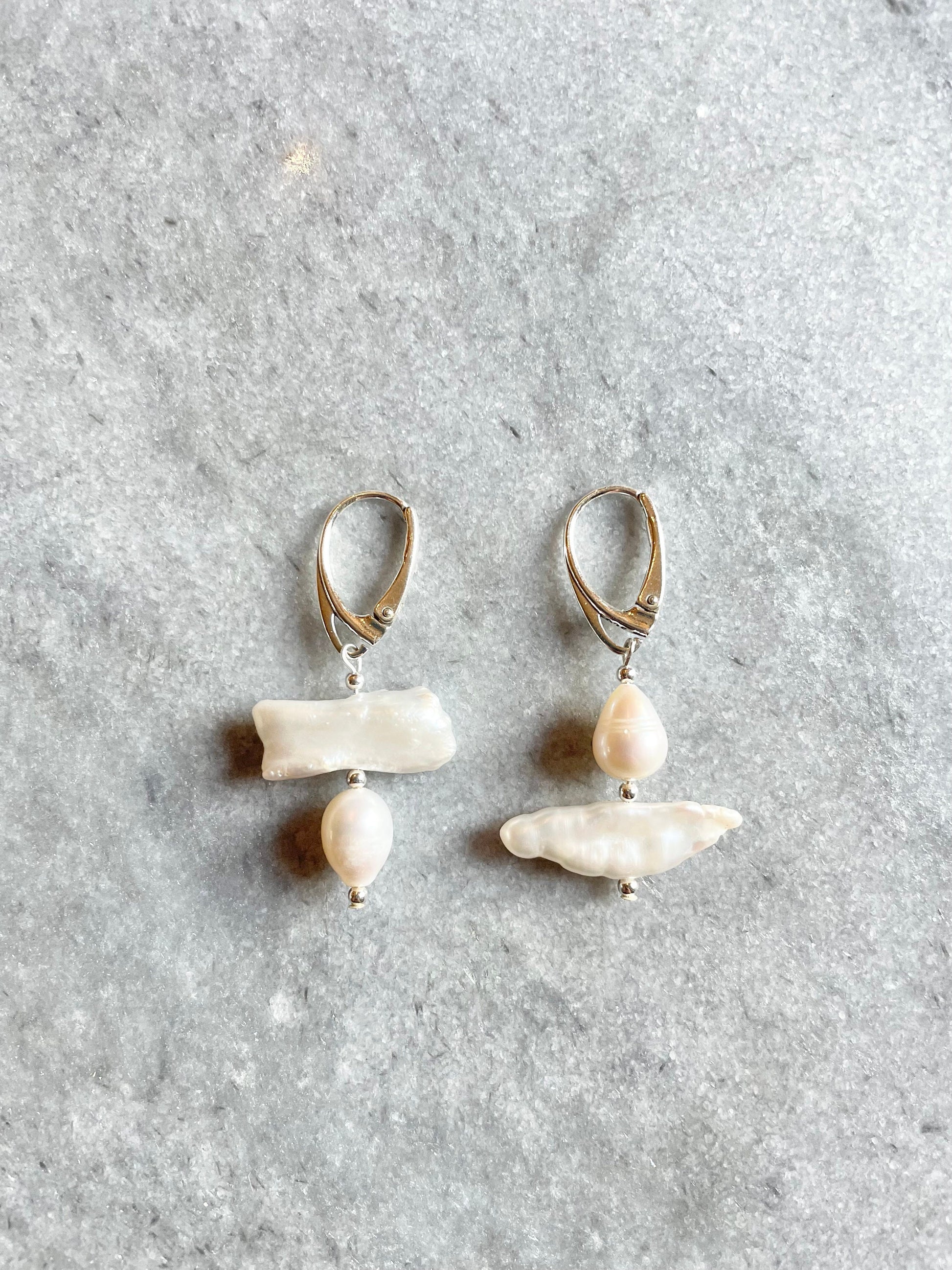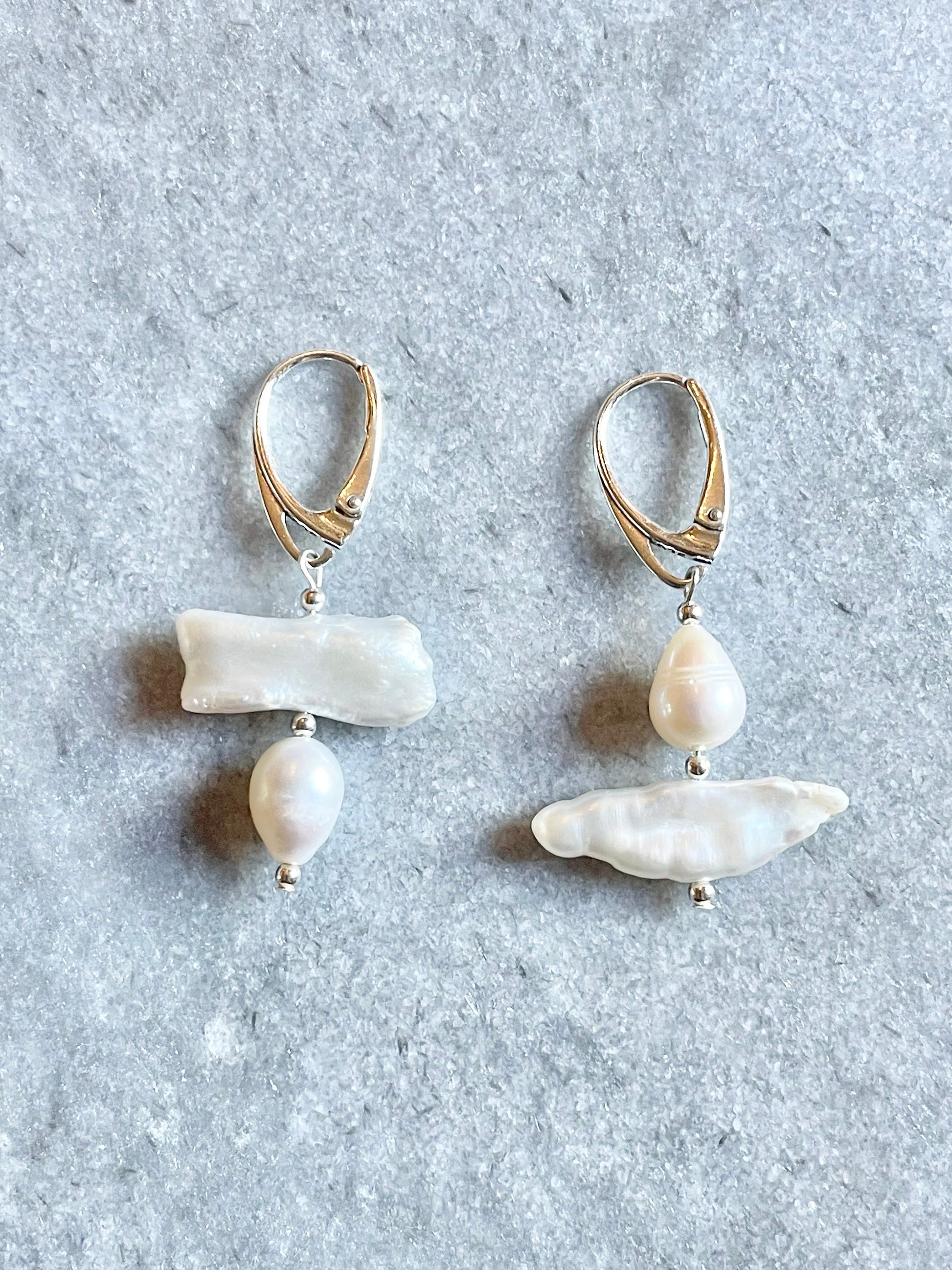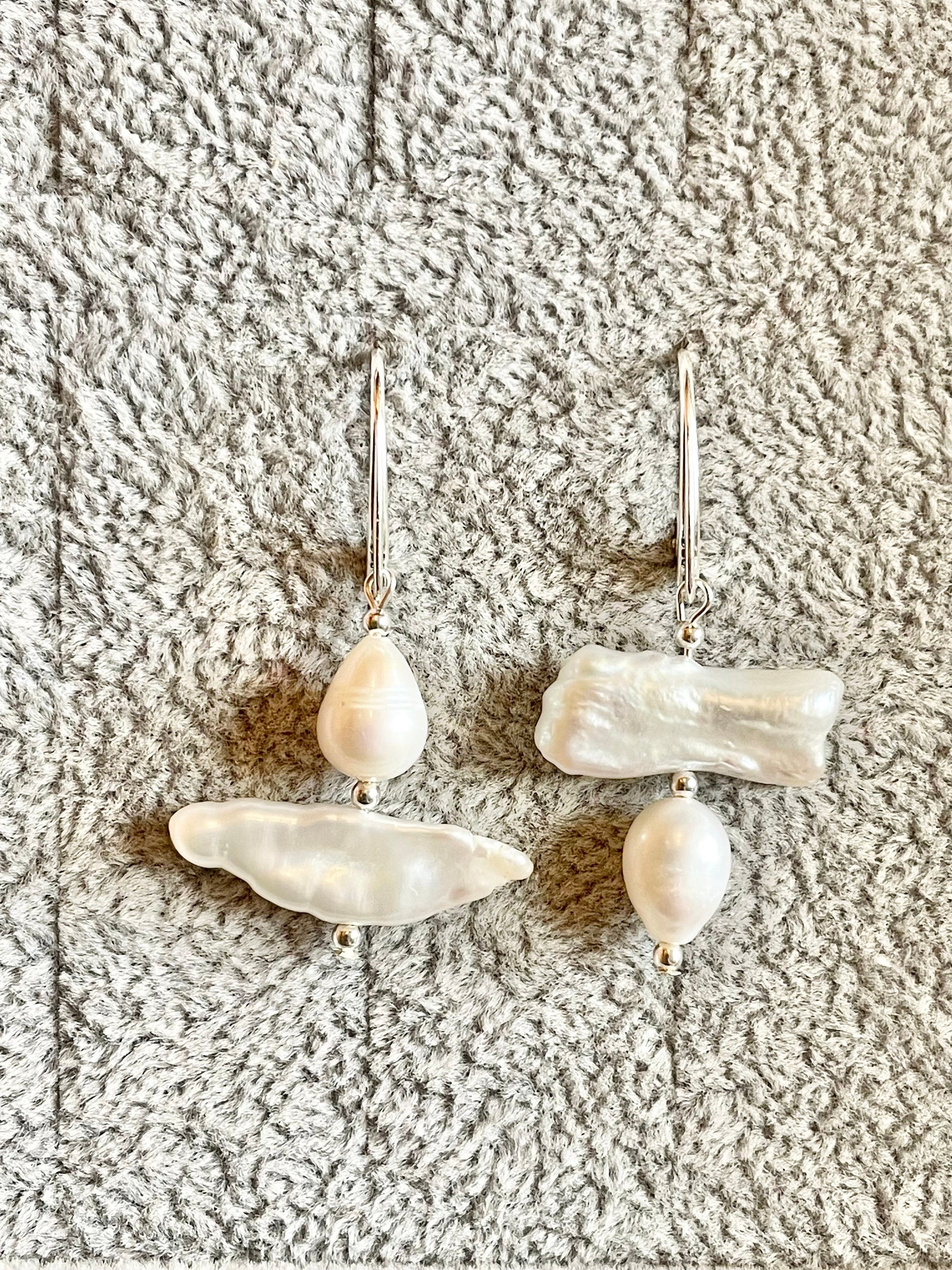 These mismatched earrings are made with biwa and teardrop pearls and finished in sterling silver.