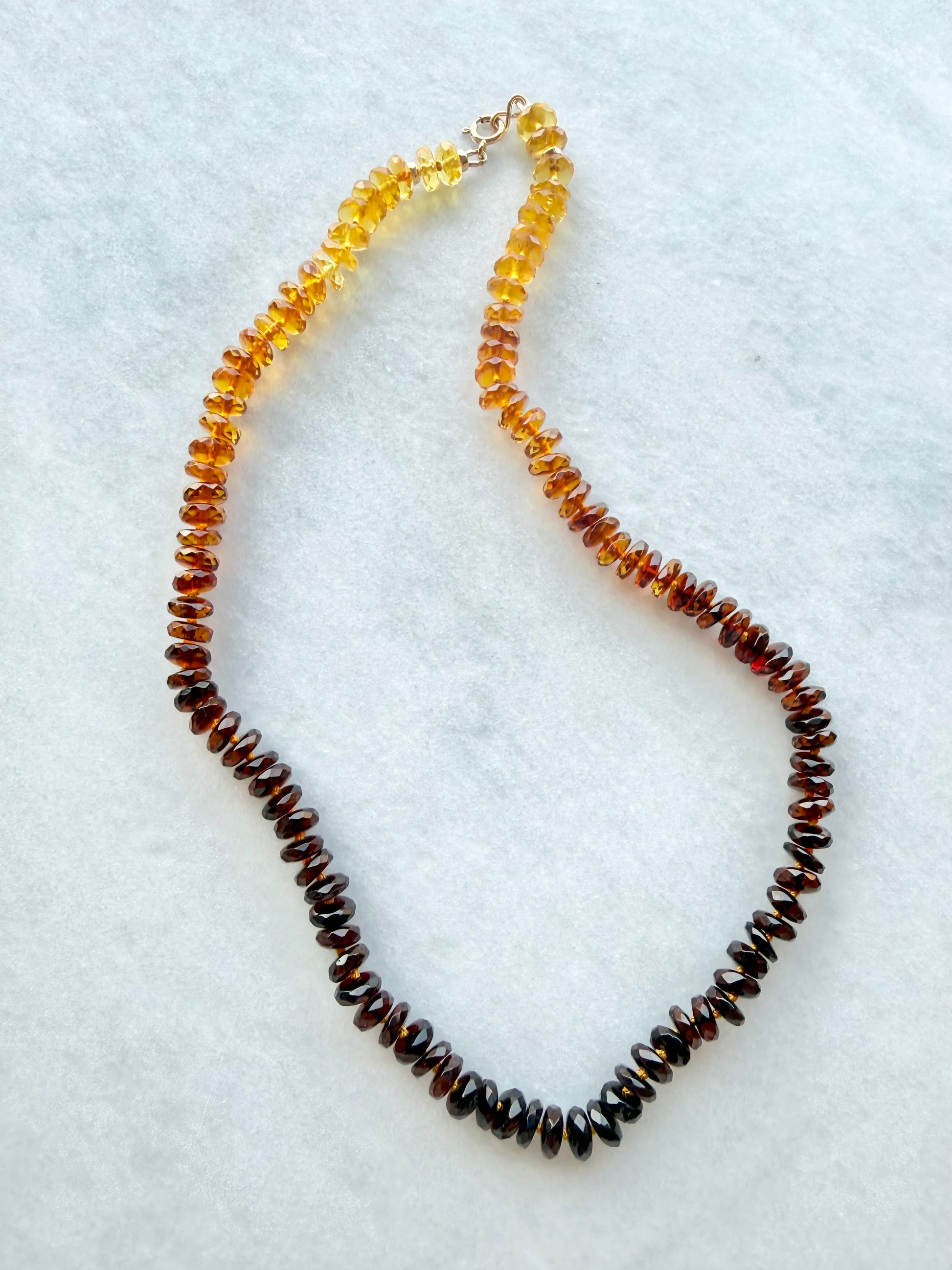 A striking gradient of amber tones—from bright honey to deep cherry—gives this necklace its dramatic, sunset-inspired look. The faceted beads are hand-knotted to enhance their movement and sparkle, creating a rich interplay of light and shadow. Finished with a gold-filled clasp, this piece is bold yet sophisticated, perfect for making a statement.