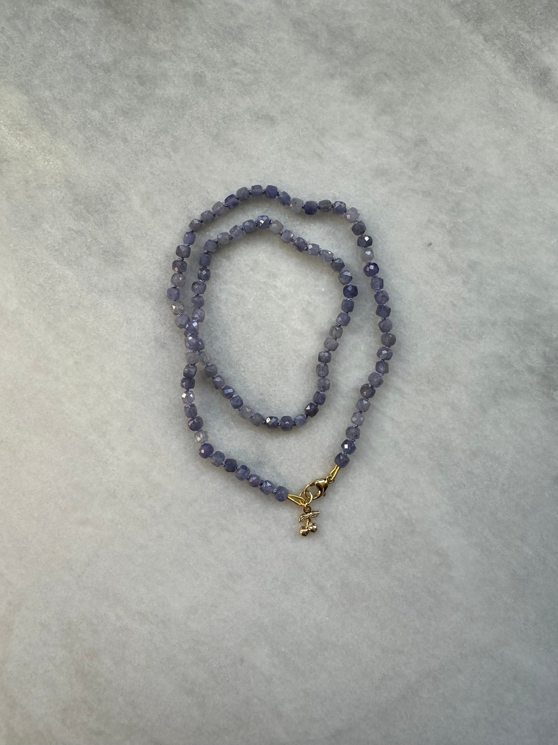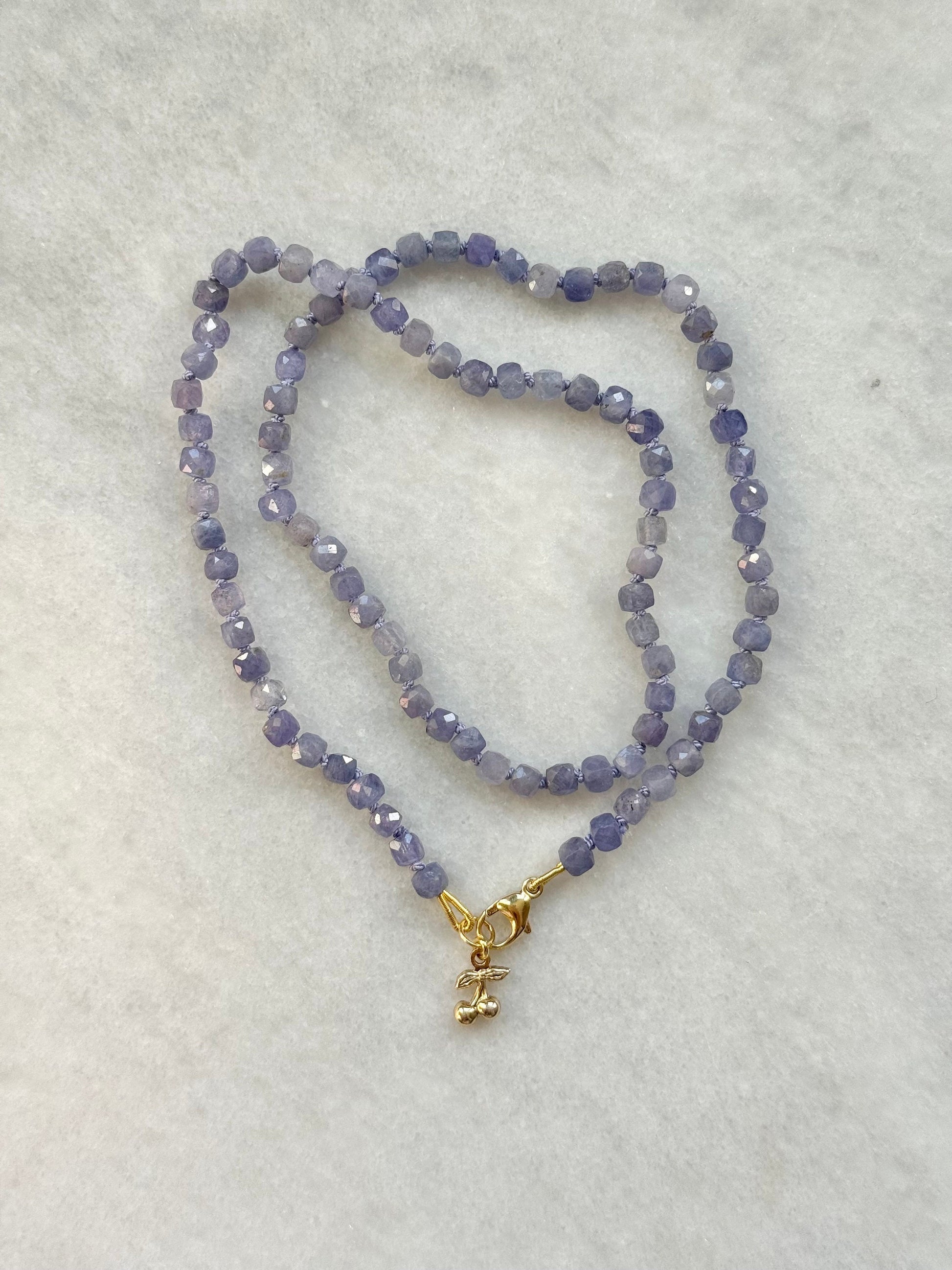 These Tanzanite cubes are hand knotted on lilac silk thread and finished with a gold vermeil clasp and a tiny cherry charm.