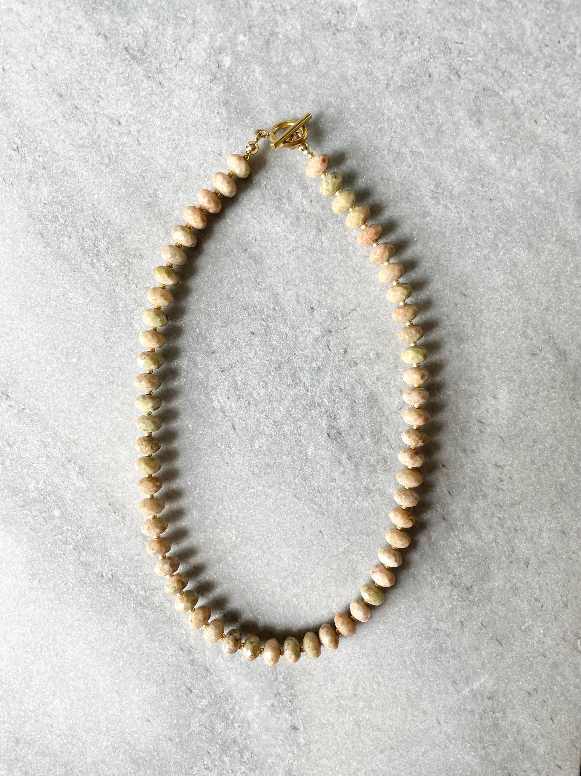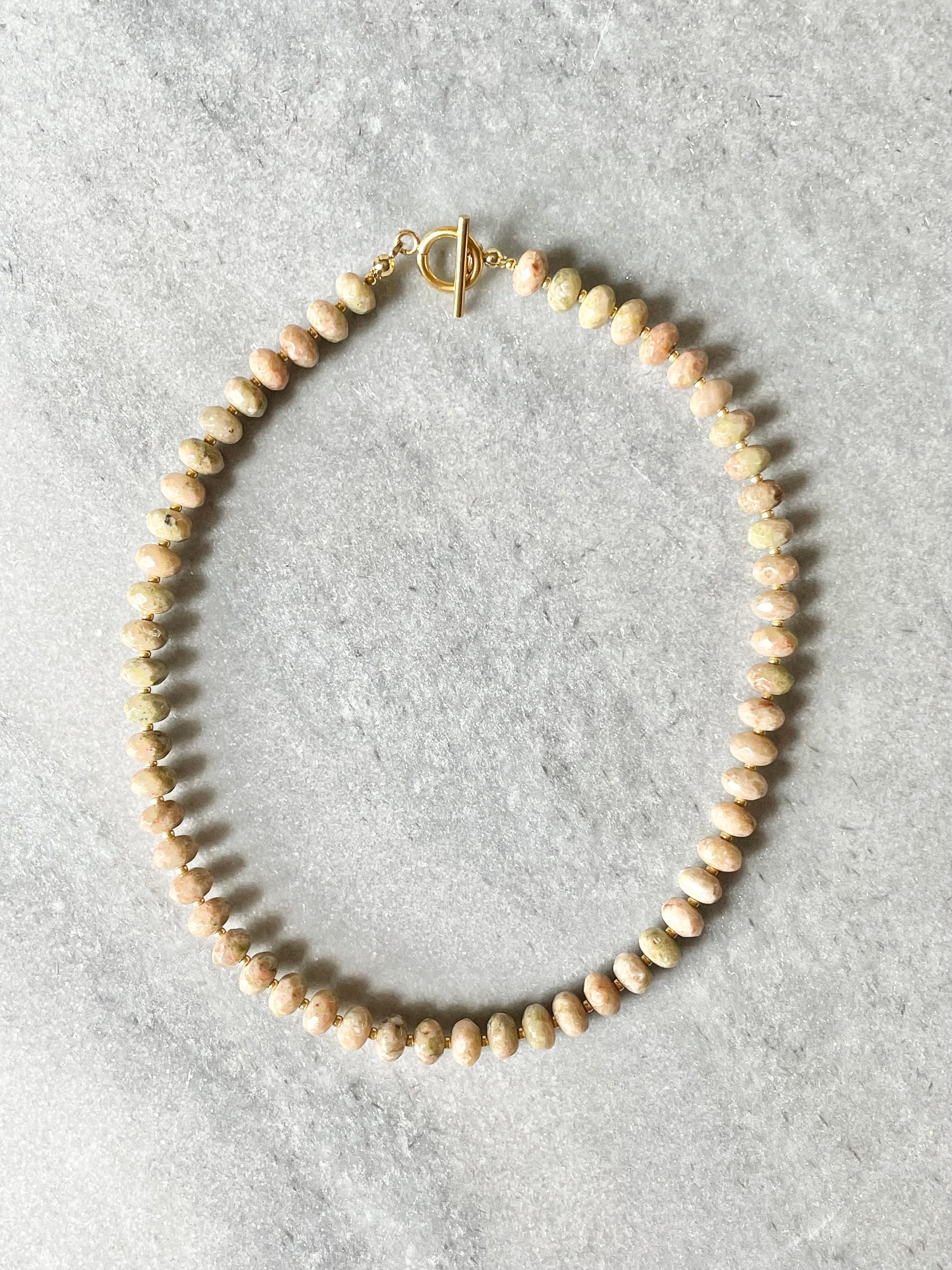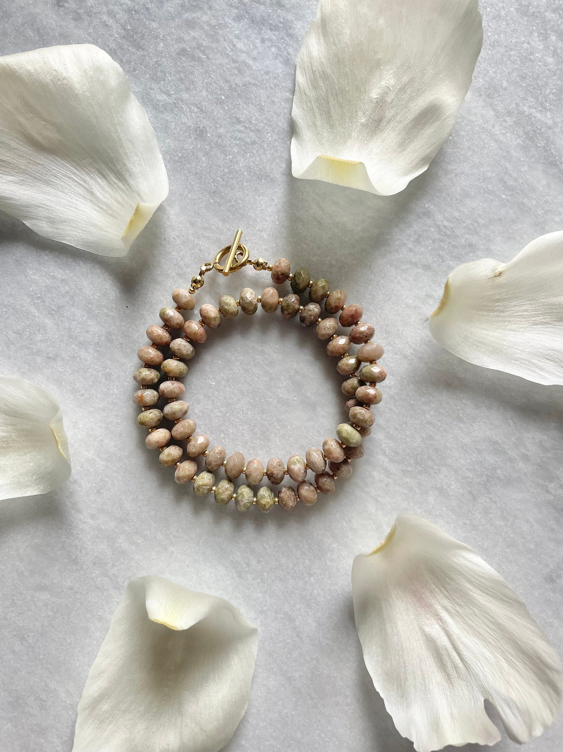 This necklace features Unakite gemstone rondelles, accented with delicate Japanese Miyuki seed beads for a subtle contrast in texture and tone. Finished with a gold-plated stainless steel toggle clasp, it’s both elegant and easy to wear.