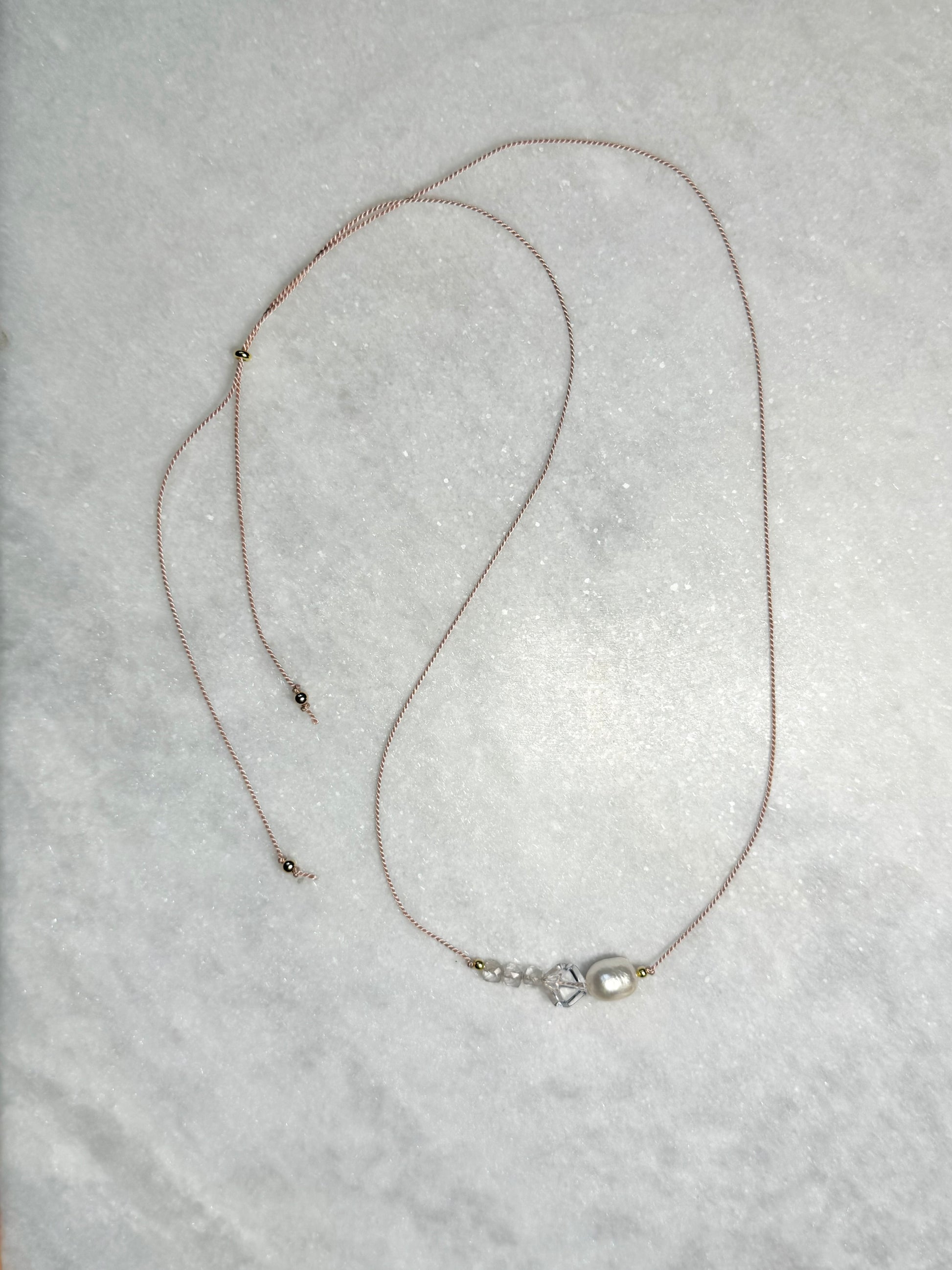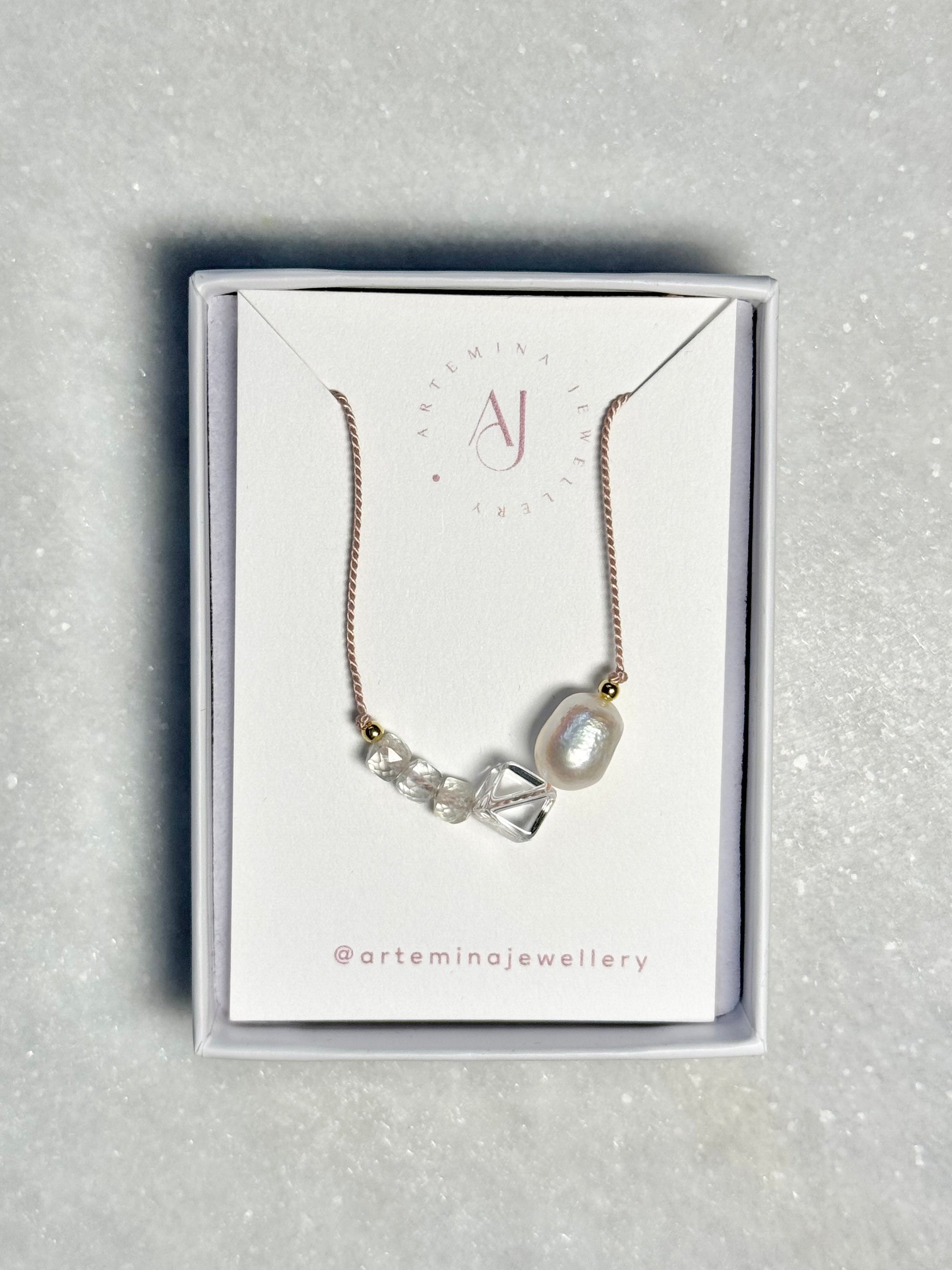 This pendant necklace features white topaz and clear quartz, symbolising purity, strength, and resilience for April. The added pearl brings an elegant accent to the piece.